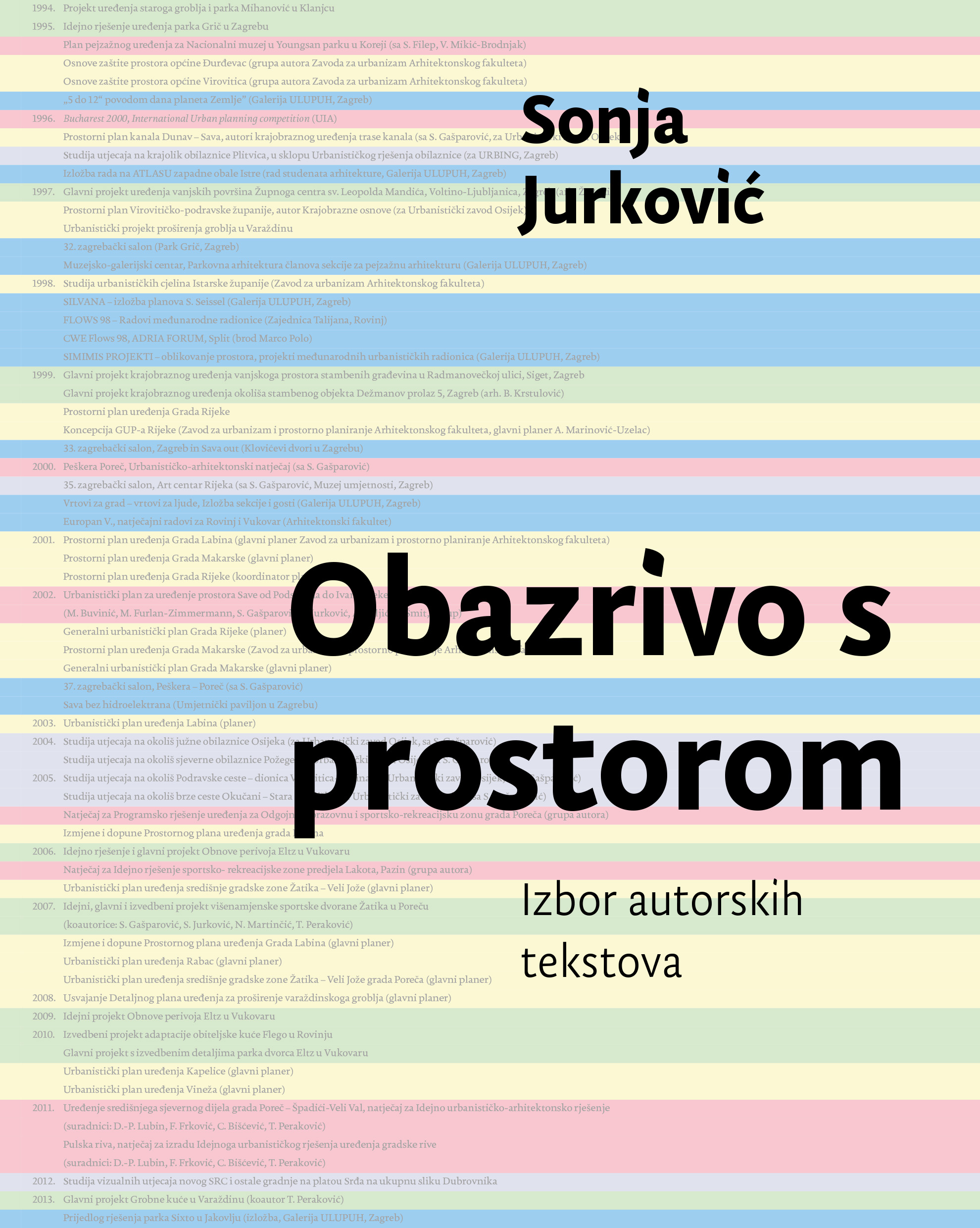 Zbirkom autorskih tekstova nastalih u razdoblju od 1990. do 2010. Sonja Jurković obilježava svoje djelovanje kao arhitektice i krajobrazne arhitektice, urbanistice i planerke te kao pedagoginje sa četrdeset godina radnog iskustva na Arhitektonskom fakultetu u Zagrebu. Kritički odabir osamdesetak ključnih autorskih tekstova odraz su autoričinih nastojanja da stvara i podučava načine kako se etički te s visokom razinom estetike izražavati u suglasju s okolinom - odnosno kako obazrivo djelovati u prostoru. S tom porukom nastaje i ova monografija. Djelo donosi niz tekstova koji na stručno utemeljen način problematiziraju ulogu planiranja u suvremenom društvu, a cilj joj je pobuditi svijest o važnosti urbanističkog, prostornog i pejsažnog planiranja. Iz kompozicije knjige vidljiva je autoričina dosljednost u bavljenju ključnim temama iz domene njene kompetencije, pa je ponajviše tekstova posvećeno: urbanitetu Zagreba, rijeci u gradu osobito Savi, Maksimiru i parkovnoj baštini, problemima pejsaža i zahvatima u krajoliku, gradovima i prostoru Istre. Zbirka tekstova je podijeljena u četiri poglavlja pod naslovima: Ljudi i struka, Prepoznavanje prostora, Gradovi i planiranje, Pejsaž i oblikovanje.