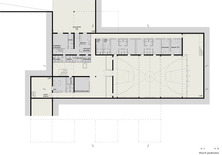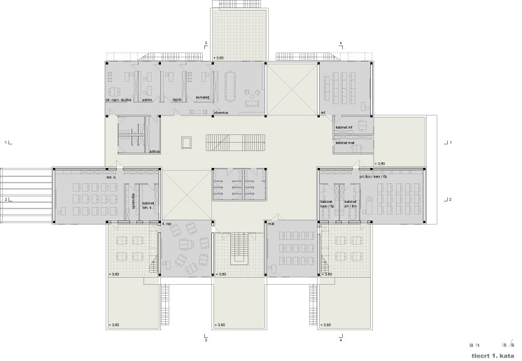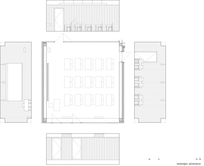 Prostori školske zgrade projektirani su u modularnom rasteru od 8 x 8 m, a jedan modul odgovara veličini jedne učionice. Veće učionice i veći prostori nastaju povezivanjem više modula, dok se manji prostori poput sanitarija i kabineta grupiraju unutar modula uz neki veći prostor ili funkcioniraju kao manje samostalne jedinice unutar modula.