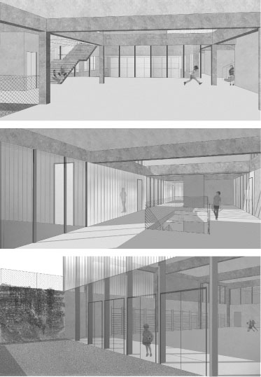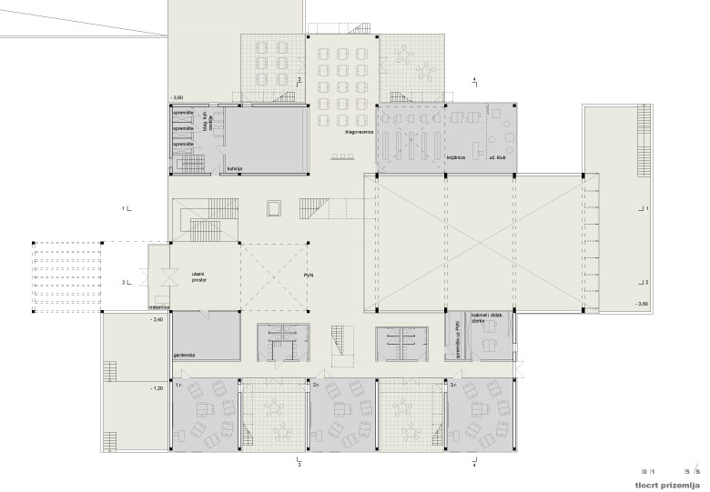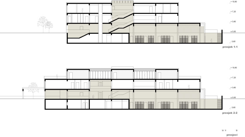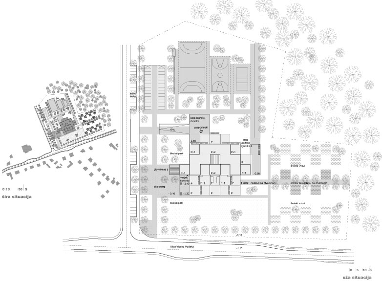 Osnovna namjera je ostvarenje veze parcele i škole te škole sa šumom i gorjem. Veza se ostvaruje kroz terasasti presjek koji omogućava iskorištavanje južne orijentacije i vizura prema sjeveru. Elementi punog - volumeni učionica i praznog - prostori terasa i vrtova izmjenjuju se te postupno uvlače u dubinu tlocrta na svakoj sljedećoj etaži. Broj učionica, terasa i vrtova je na južnom pročelju dominantan, dok se na ostalim pročeljima smanjuje. Društveni sadržaji i nekoliko učionica, nalaze se na sjeveru. Struktura vanjskog volumena i nizanje planova dijelom su prisutni i u interijeru. Servisni prostori i kabineti učionica formirani su unutar manjih jedinica koje s pojedinim sadržajima otvorenijeg karaktera i manjim brojem dvoetažnih prostora stvaraju ritam punog i praznog, providnost, nizanje planova te sugeriraju različita kretanja kroz prostor.