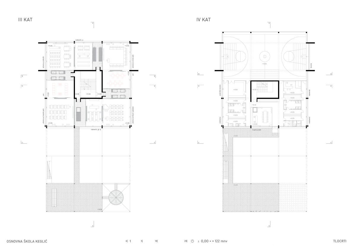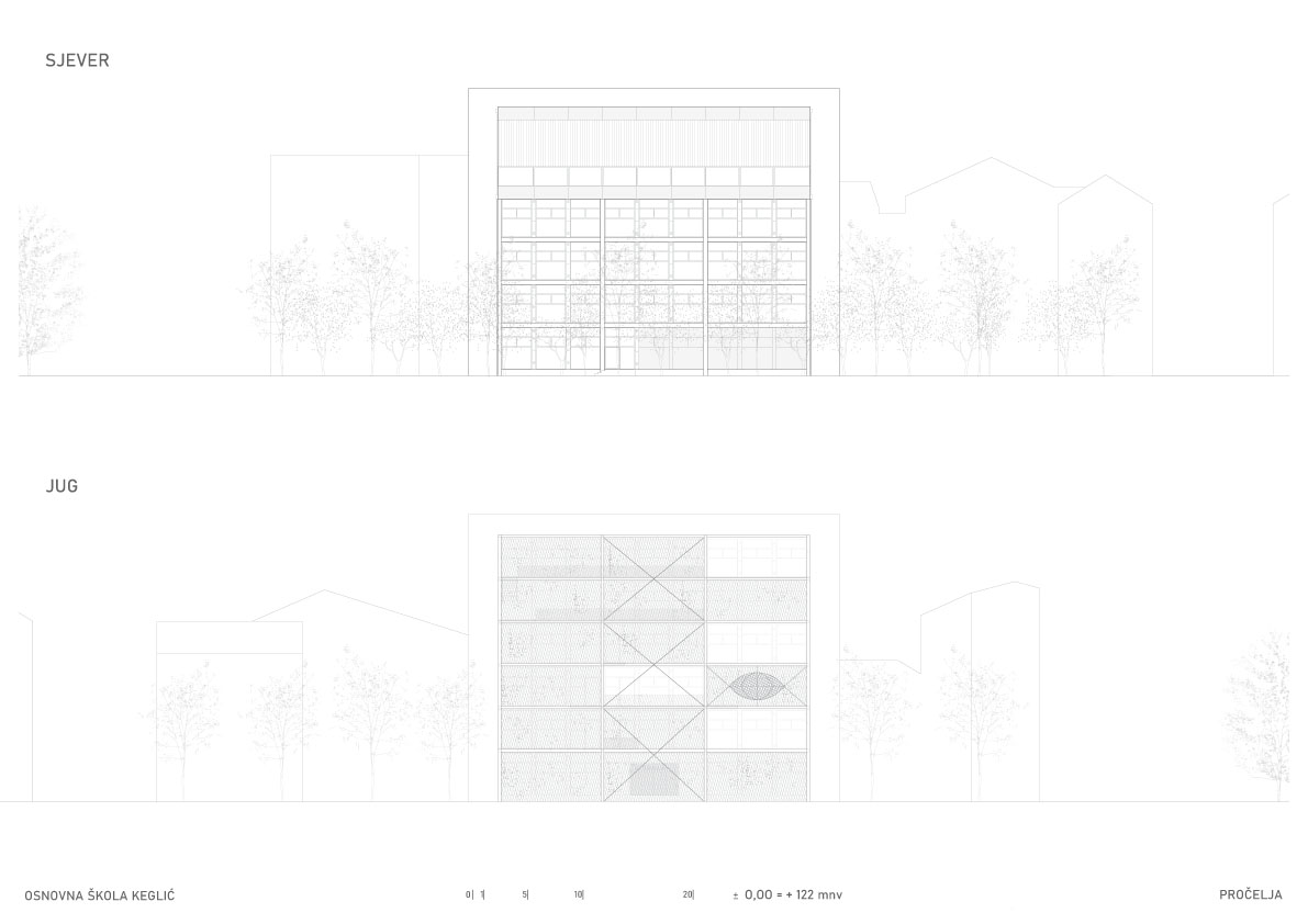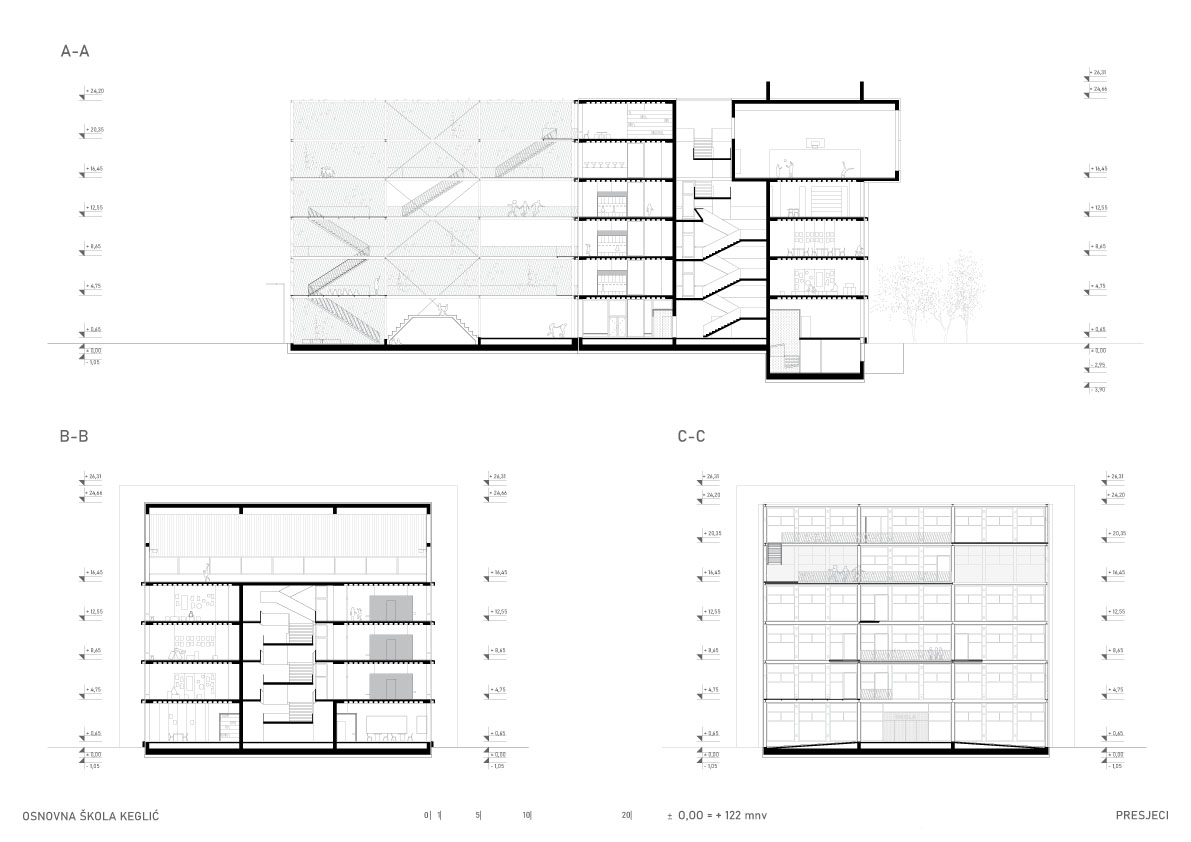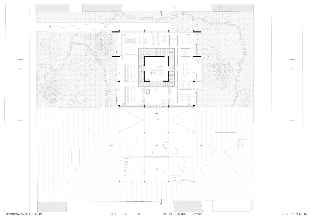 Višeetažna kvadratična prizma u sredini ima jezgru sa stubištem, nastaje prostorija samo za stubište koje postaje društveni prostor i mjesto susretanja. Oko stubišne jezgre projektiraju se cjeloviti prostori učenja, stvara se mogućnost novog modela pedagoškog rada. Edukativni prostor kata nastaje grupiranjem različitih prostora učenja zajedno sa servisnim otocima u jedinice i umnažanjem tih jedinica, tj. njihovom rotacijom oko jezgre. Nastavne cjeline se formiraju u odnosu na uzrast učenika.