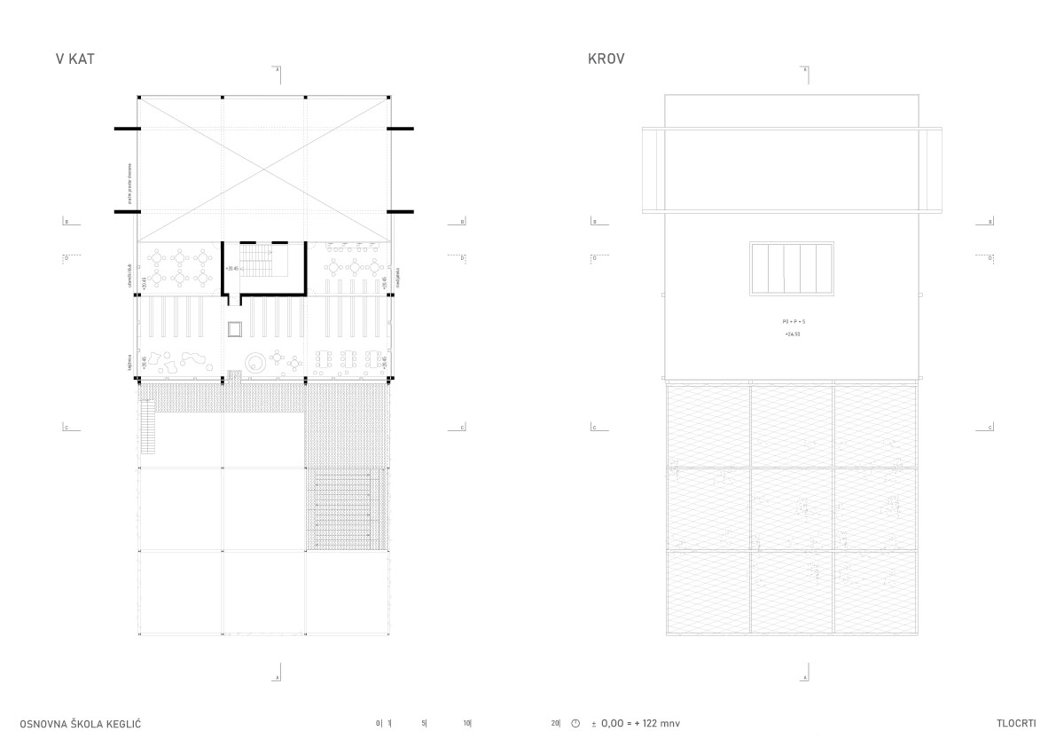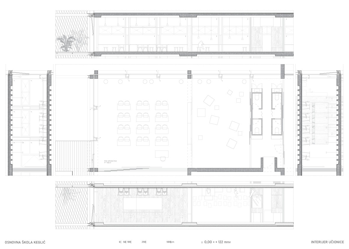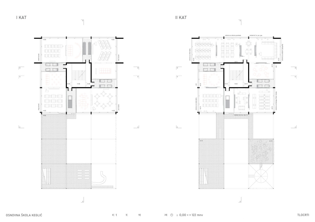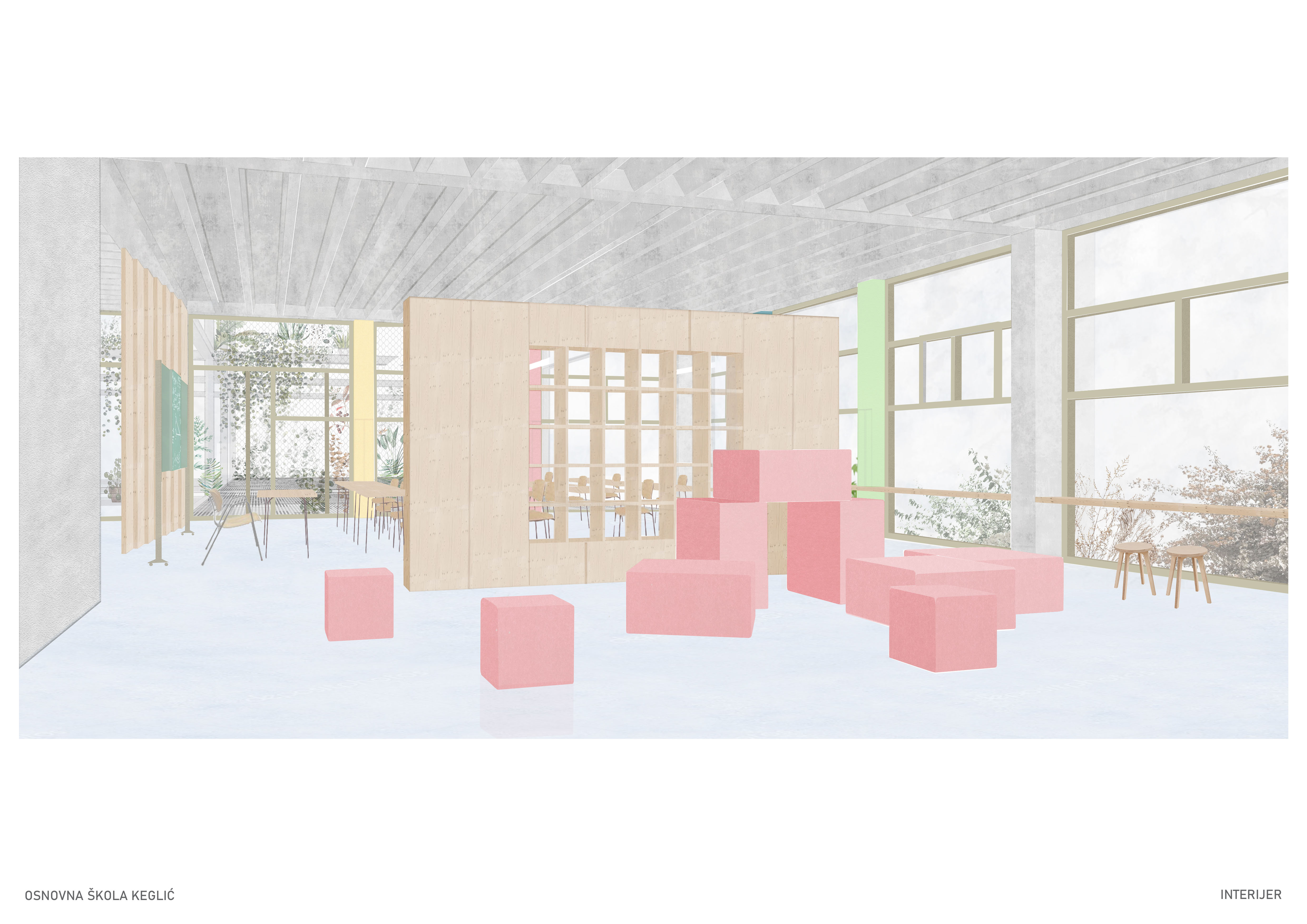 Višeetažna kvadratična prizma u sredini ima jezgru sa stubištem, nastaje prostorija samo za stubište koje postaje društveni prostor i mjesto susretanja. Oko stubišne jezgre projektiraju se cjeloviti prostori učenja, stvara se mogućnost novog modela pedagoškog rada. Edukativni prostor kata nastaje grupiranjem različitih prostora učenja zajedno sa servisnim otocima u jedinice i umnažanjem tih jedinica, tj. njihovom rotacijom oko jezgre. Nastavne cjeline se formiraju u odnosu na uzrast učenika.
