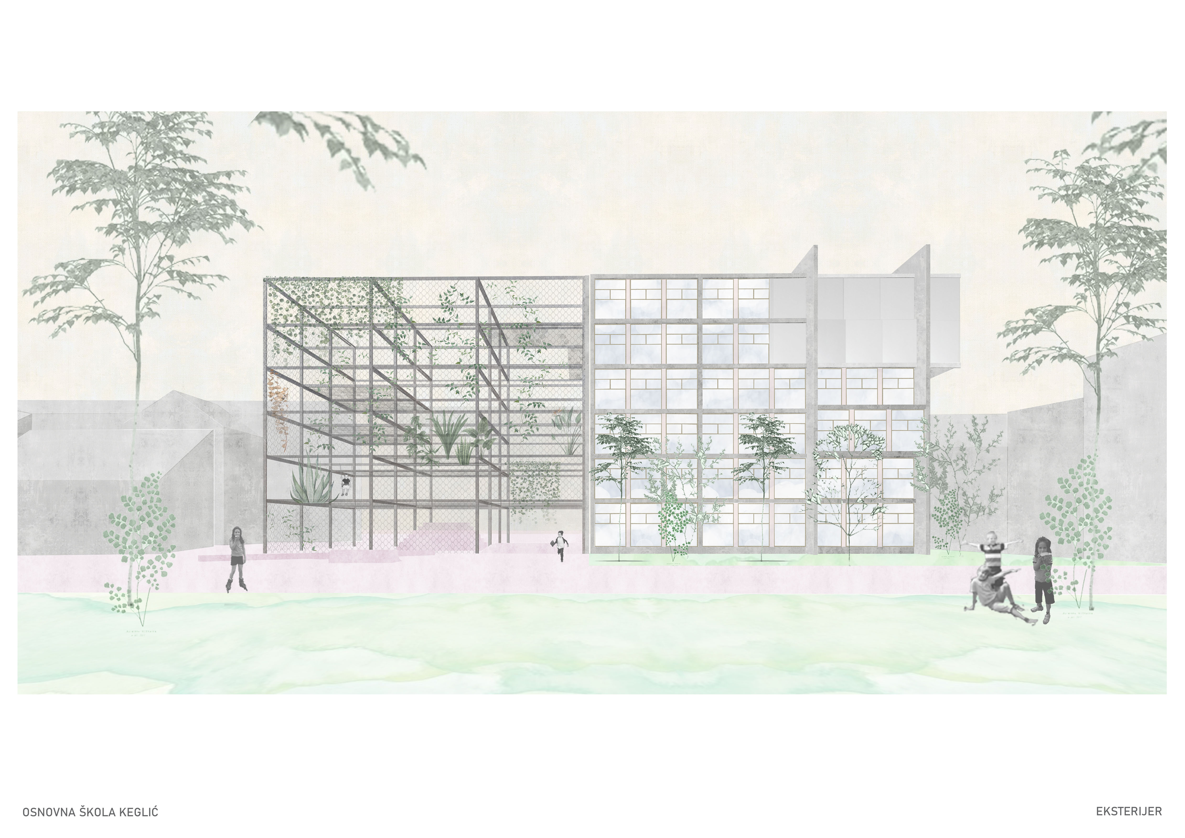U oblikovanju zgrade škole, osjeća se dvojnost, bez hijerarhije. Sastoji se od dva volumena, kao dva blizanca, jedan zatvoreni i jedan otvoreni. Zgrada je postavljena inverzno, tako da se u 'gradskom' dijelu osjeća priroda, a u 'prirodnom' dijelu osjeća grad.