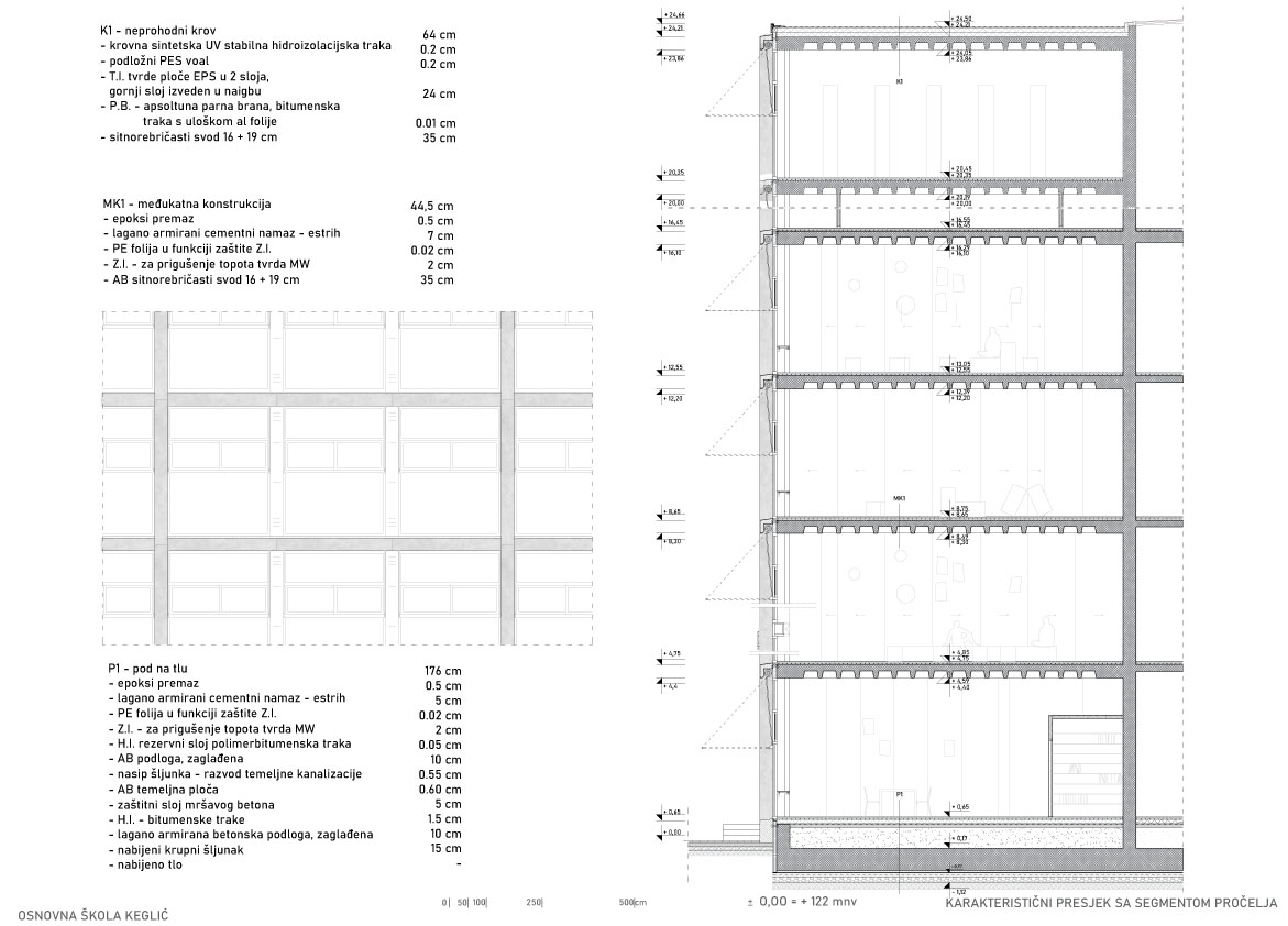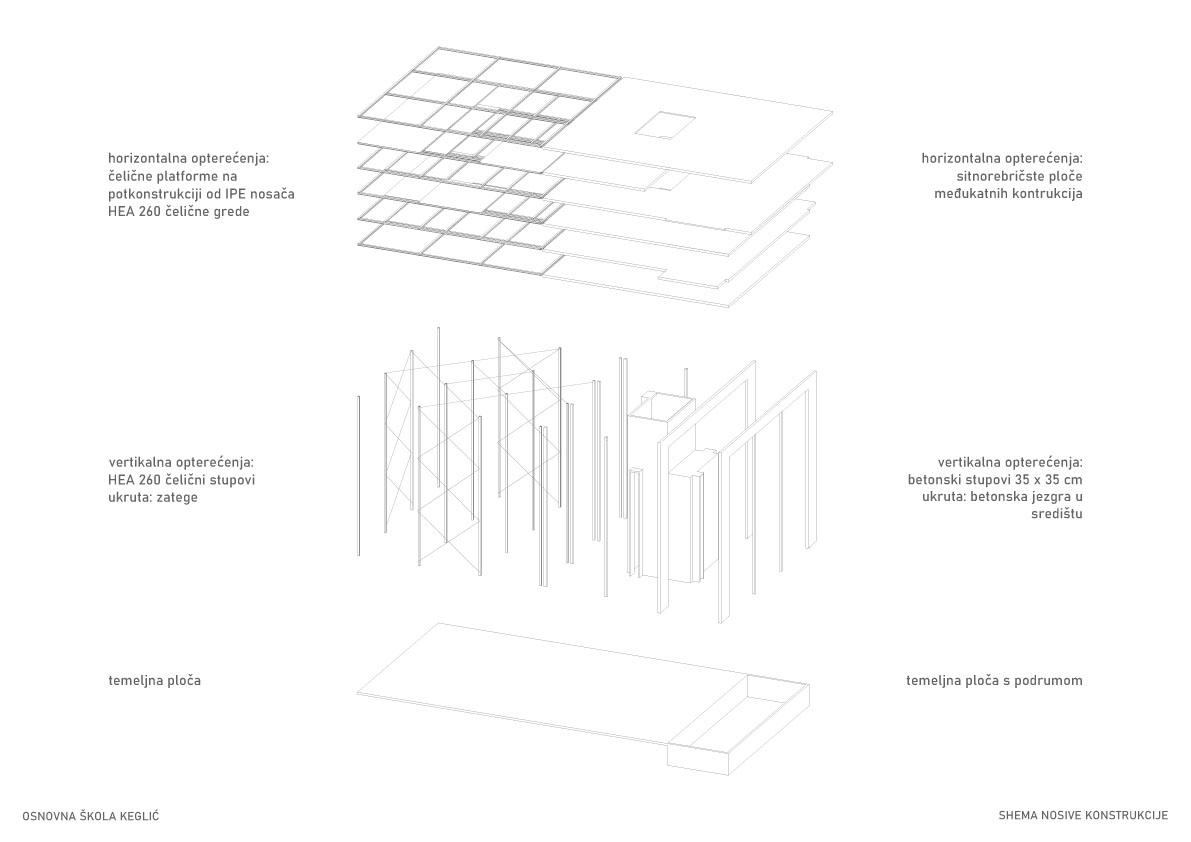 Cjelovitost prostora etaža omogućena je skeletnim sustavom, a ideja dvojnosti se materijalizira tako da je prostor za učenje u zatvorenom od masivne armirano betonske konstrukcije, a prostor za učenje na otvorenom od lagane čelične konstrukcije.