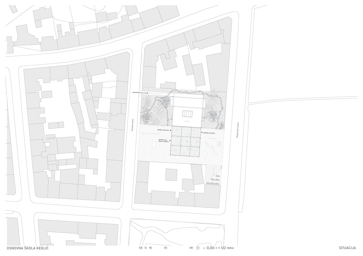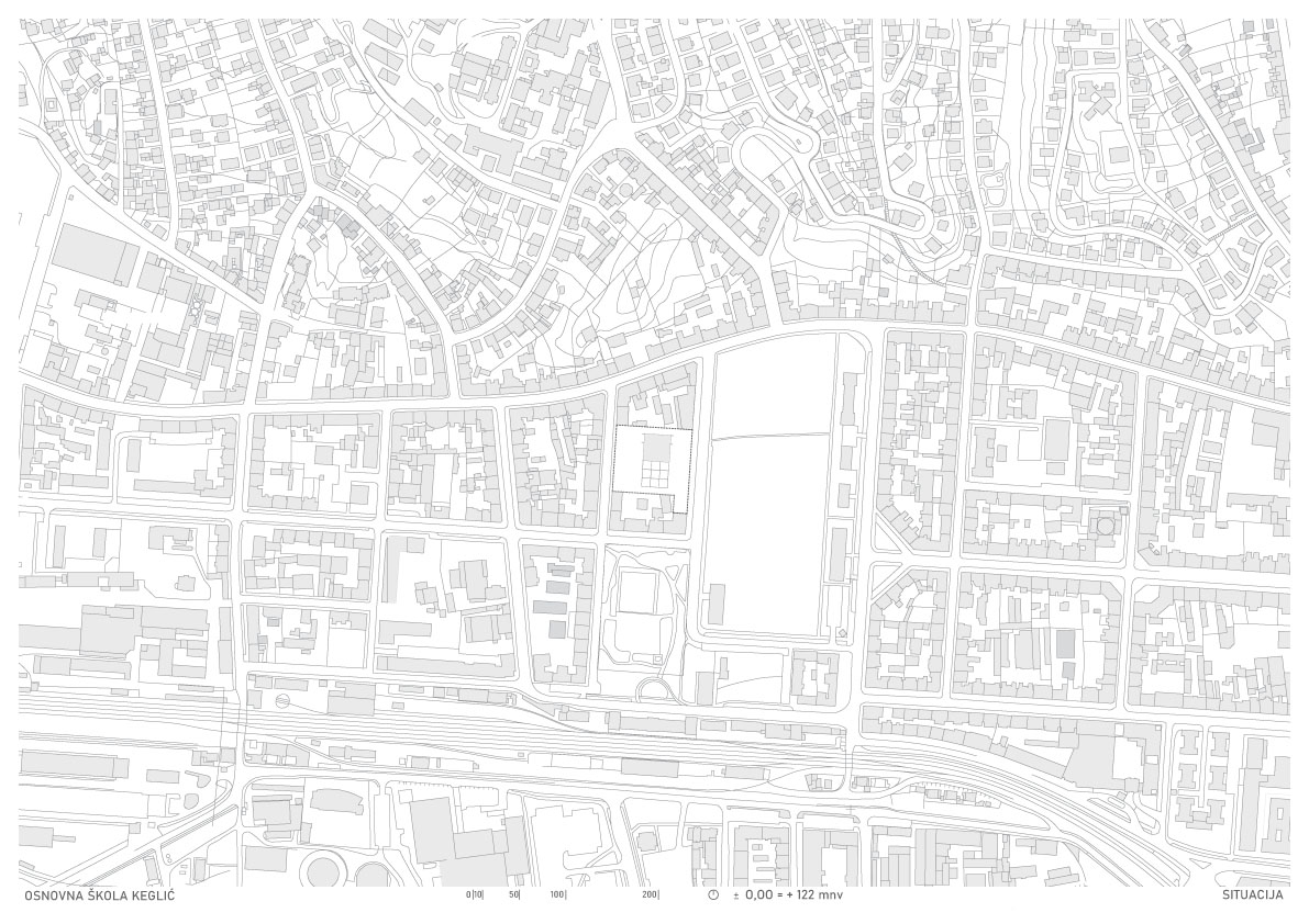 Novoplanirana školska zgrada smještena je na zapadnom rubu Donjega Grada uz Trg Franje Tuđmana. Na parceli se trenutno nalazi bivša tvornica Kamensko predviđena za rušenje. Objekt škole ne interpolira se u ulični niz, već se interpretira kao slobodnostojeći. Usred pretežno izgrađene blokovske strukture i pored pretežno zelenog Trga, nastaje dvojni urbani prostor. Dio parcele je šuma, a dio grad, te takva artikulacija reprezentira suživot prirode s izgrađenim.