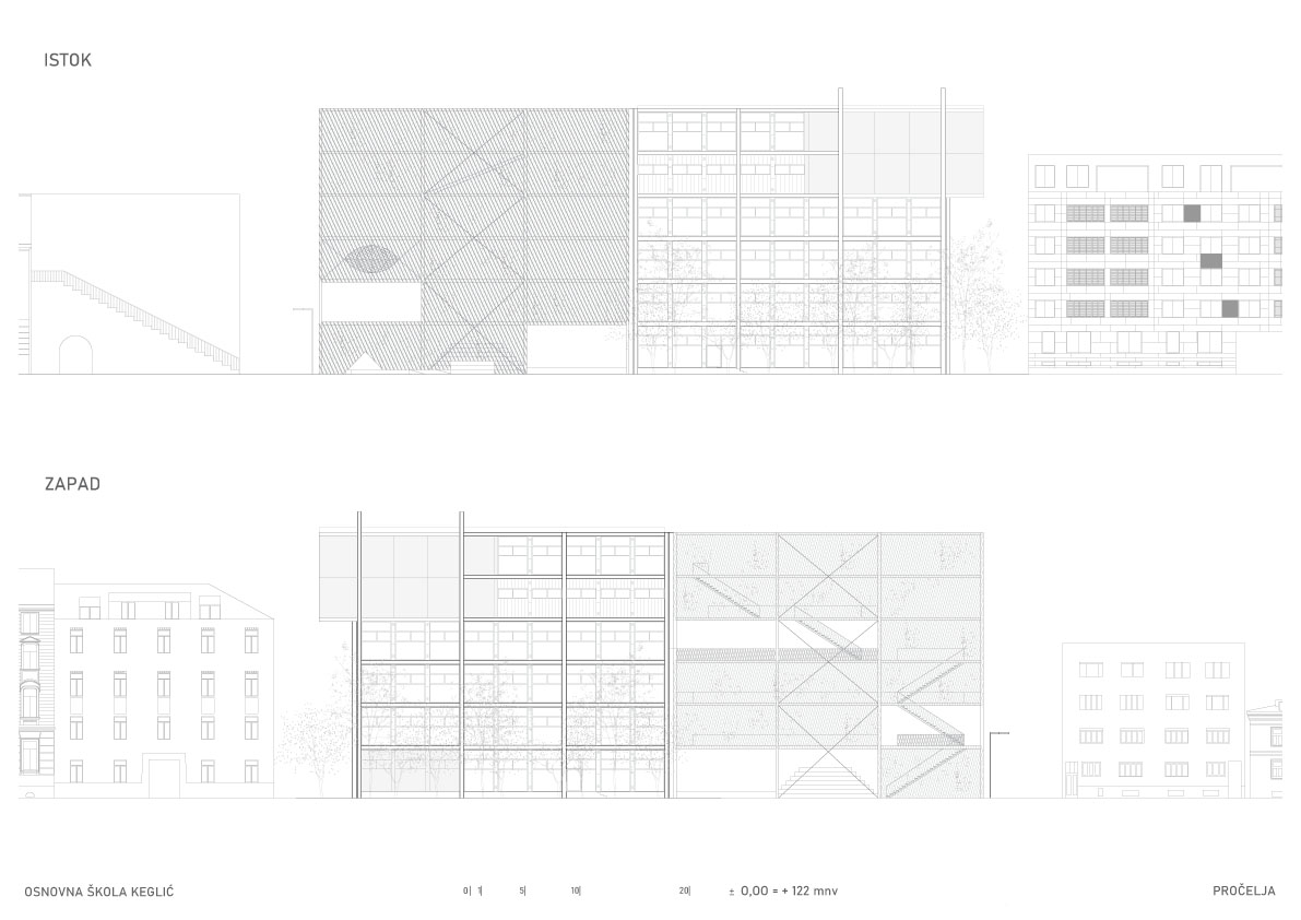 Betonski je dio zatvoren uglavnom staklom s ventilacijskim elementima, ponegdje limom ili profiliranim staklom. Horizontale i vertikale skeletnog rastera naglašene su prefabriciranim armirano-betonskim elementima. Čelični je dio, ondje gdje se nalaze platforme za boravak na otvorenom, osiguran mrežom, po kojoj se penju penjačice. Ozelenjeni vanjski dio škole, služi kao velika sjenica te održava ugodnu temperaturu ljeti, dok podjela pročelja unutrašnjeg dijela omogućava brzu ventilaciju pomoću kliznih prozora, te trajnu ventilaciju kroz ventilacijske elemente.