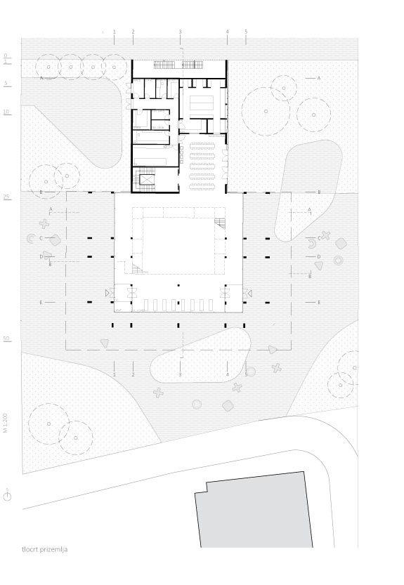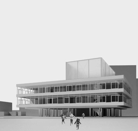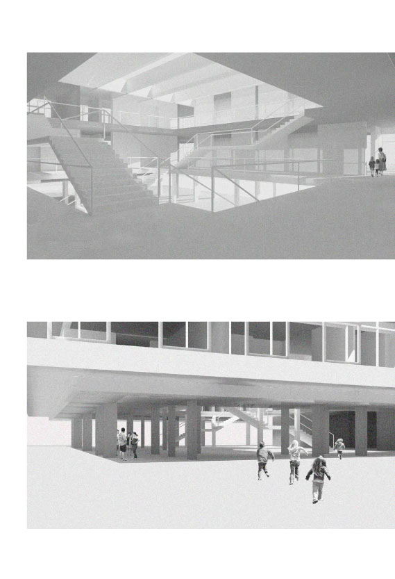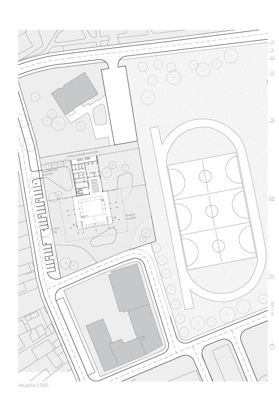 Prostorna zamisao pretpostavlja kompoziciju dva volumena karakterističnih namjena i proporcija. U horizontalnom izdignutom volumenu učionice se nižu oko pravokutnog šupljine zajedničkih prostora jasno formirajući središte škole integrirano sa parterom dubokim trijemom. Specijalizirani, prateći prostori i školska dvorana oblikuju se u vertikalni volumen koji uspostavlja dijalog sa novijom, gušćom i višom izgradnjom višestambenih zgrada naselja u transformaciji.