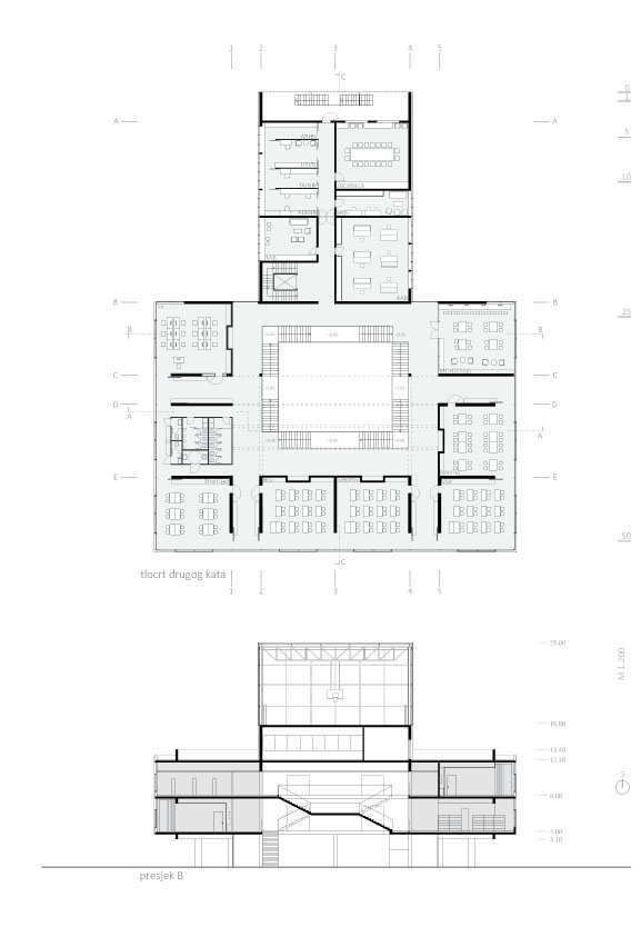U rasteru stupova u prizemlju se ističu krakovi stubišta koji pozivaju korisnika i najavljuju prostore na etažama iznad. Unutarnji prostor je organiziran u obliku galerija koje okružuju PVN koji se svojom visinom proteže kroz cijeli volumen zgrade. Galerije zadiru u pravilan raster učionica smještenih po obodu tlocrta, stvarajući tako podjelu prostora na javni, polu-javni i privatni. Fleksibilnost u korištenju prostora postignuta je granulacijom, tj. organizacijom prostorija prema veličini i namjeni. Tako nastaju potezi učionica na jugu i istoku, sjeverne jedinice sadržavaju učenički klub i biblioteku koja je na dvije etaže dijagonalno povezana stubištem te prostore specijaliziranih učionica čijim povezivanjem nastaje veliki radno tehnički prostor Na posljednjoj etaži smještena je dvorana, a etažu ispod njezini popratni sadržaji. Dvorana je smještena na vrh kako bi se očuvala čistoća organizacije prostora u nižim etažama. To je iskorišteno u oblikovnom smislu jer se postavljanjem dvorane na vrh, škola visinom približava susjednom soliteru i na taj način uklapa u urbanistički kontekst, a oblikovanjem fasade, daje se akcent koji stvara ravnotežu između dva vertikalna elemeta i stvara se novi reper tog mikro prostora.