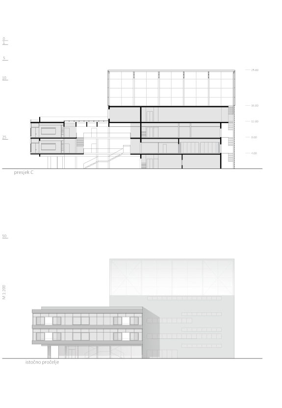 Nosivu konstrukciju sjevernog volumena čine armirano betonski zidovi, a južnog armiranobetonski zidni nosači na stupovima. Oni se međusobno razlikuju u vanjskom oblikovanju. Završna obloga vertikalnog volumena je neutralna betonska obloga dok se na vrhu ističe translucentna membrana koja obavija dvoranu. Pročelja horizontalnog volumena su ostakljena, kao elementi oblikovanja ističu se trake međukatne konstrukcije i parapeta obložene profiliranim limom, te naglašeni okviri kliznih stijena.