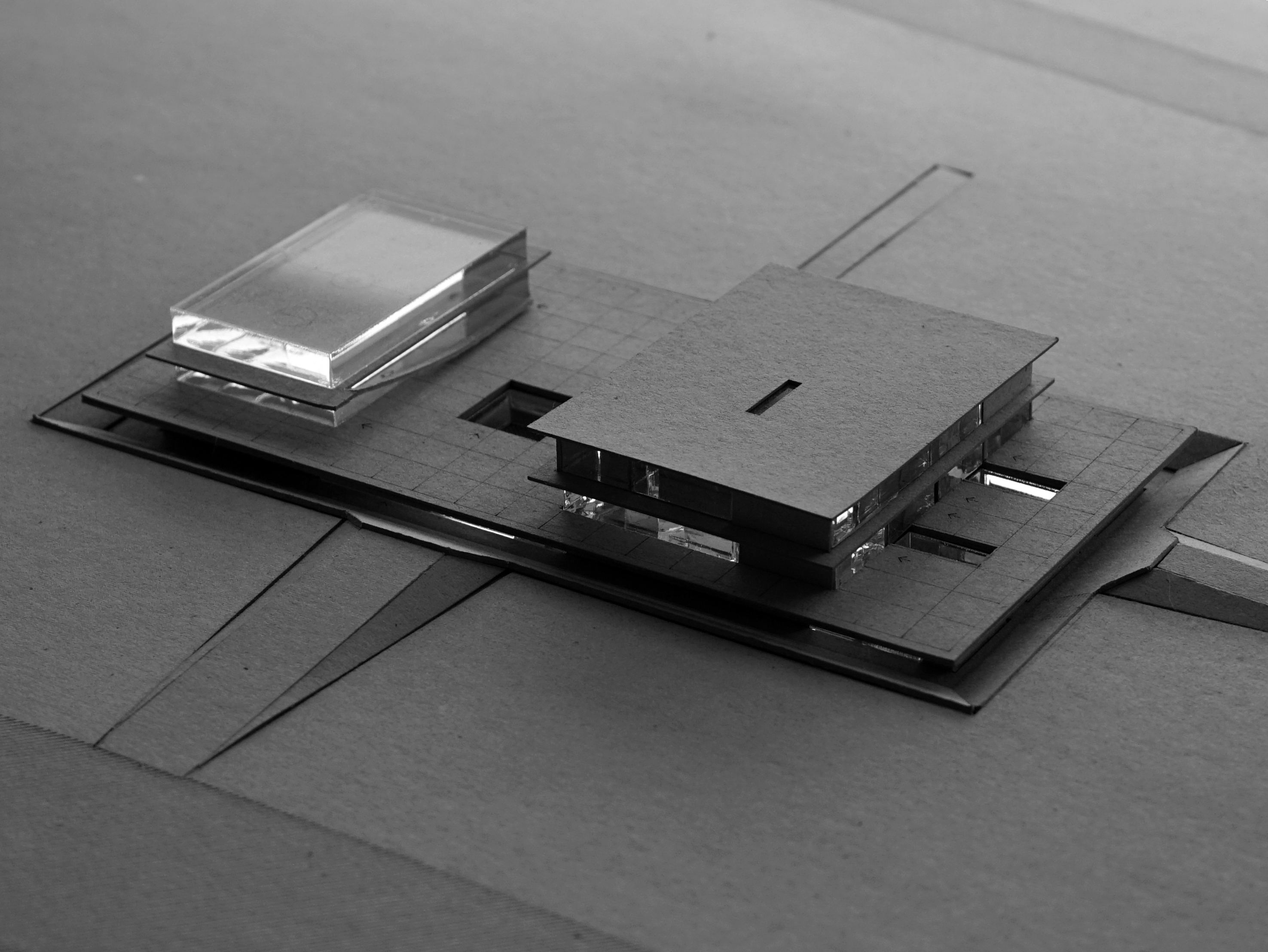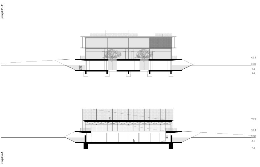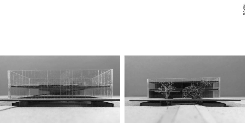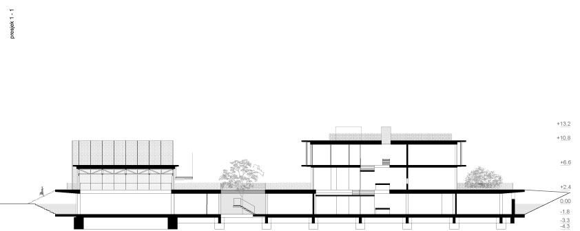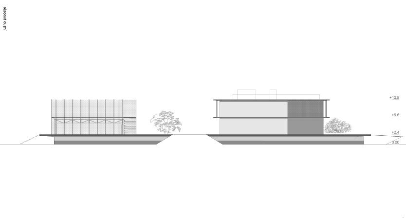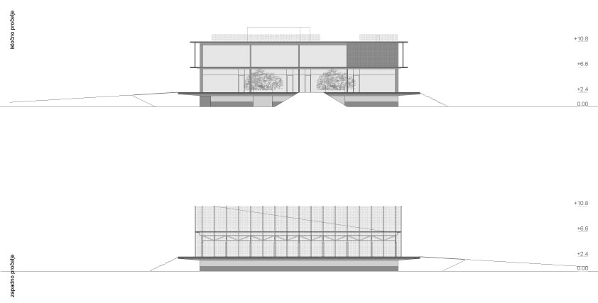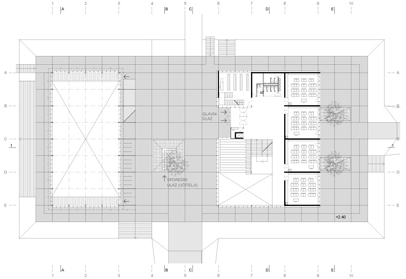transparentni volumen škole (prostori učionica razredne i predmetne nastave) s jedne i volumen