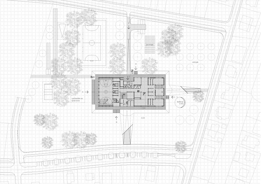 posebnih obilježja. Na mjestu škole teren se upušta, u njega se utiskuju suterenski sadržaji, a