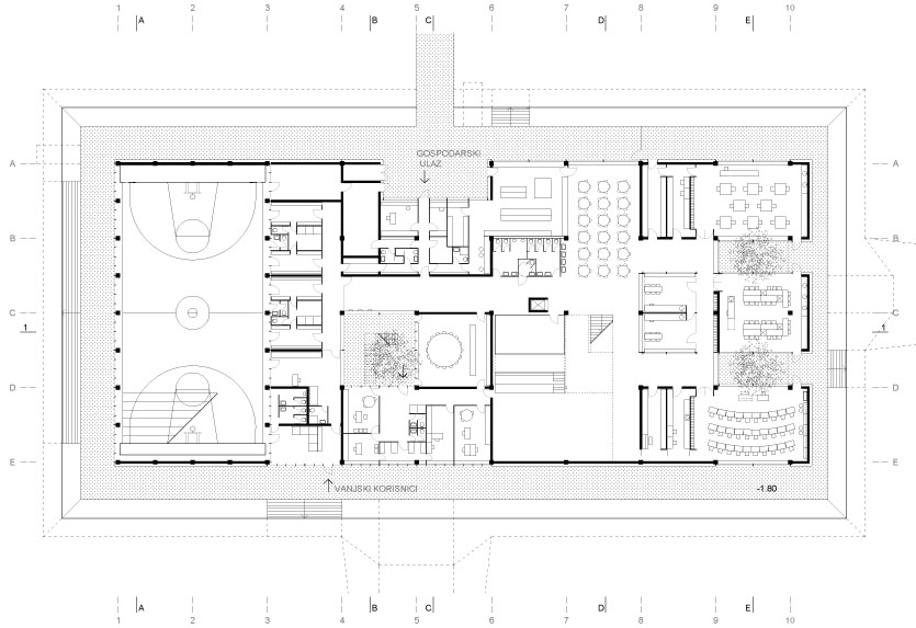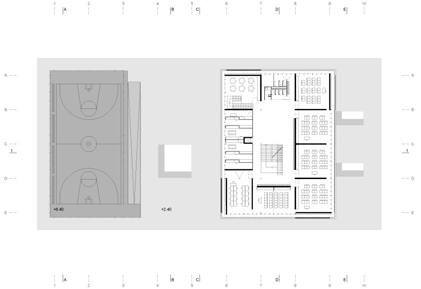 sportske dvorane (s krovnim igralištem) s druge strane. Među njima se nalazi školski trg.
