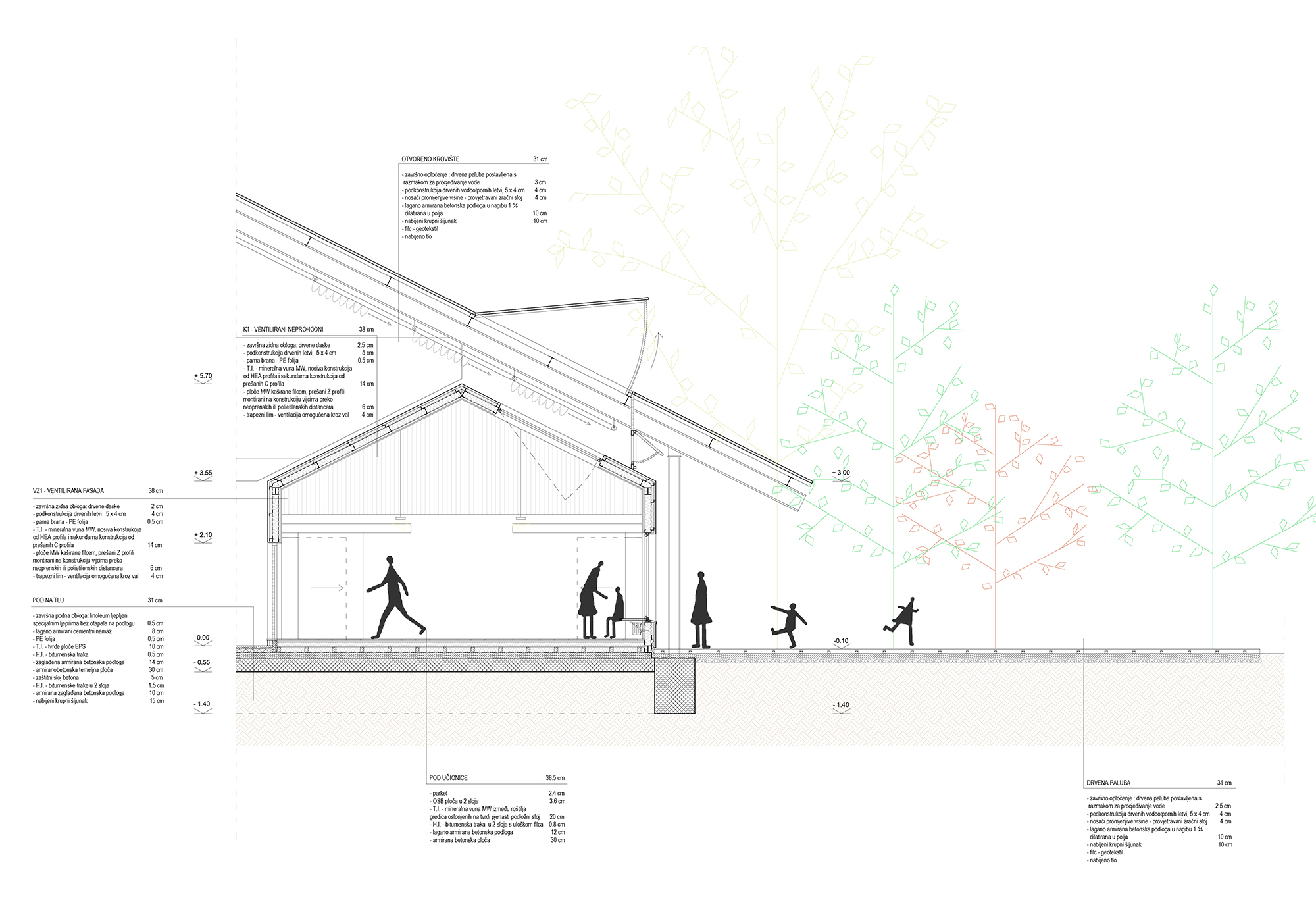 Veličina zadane građevne čestice daje mogućnost artikuliranja dodatnih vanjskih prostora (izvan uobičajenih obveznih sadržaja) kao svojevrsnih poligona, vrtova , specifičnih djelatnosti lokalne zajednice (obrti, zanati, poljoprivreda). U procesu projektiranja ispreplitanjem izgrađenog prostora i uređenog krajobraza, trebalo bi ostvariti jedinstveni školski prostor rasprostrijet do krajnjih rubova parcele.