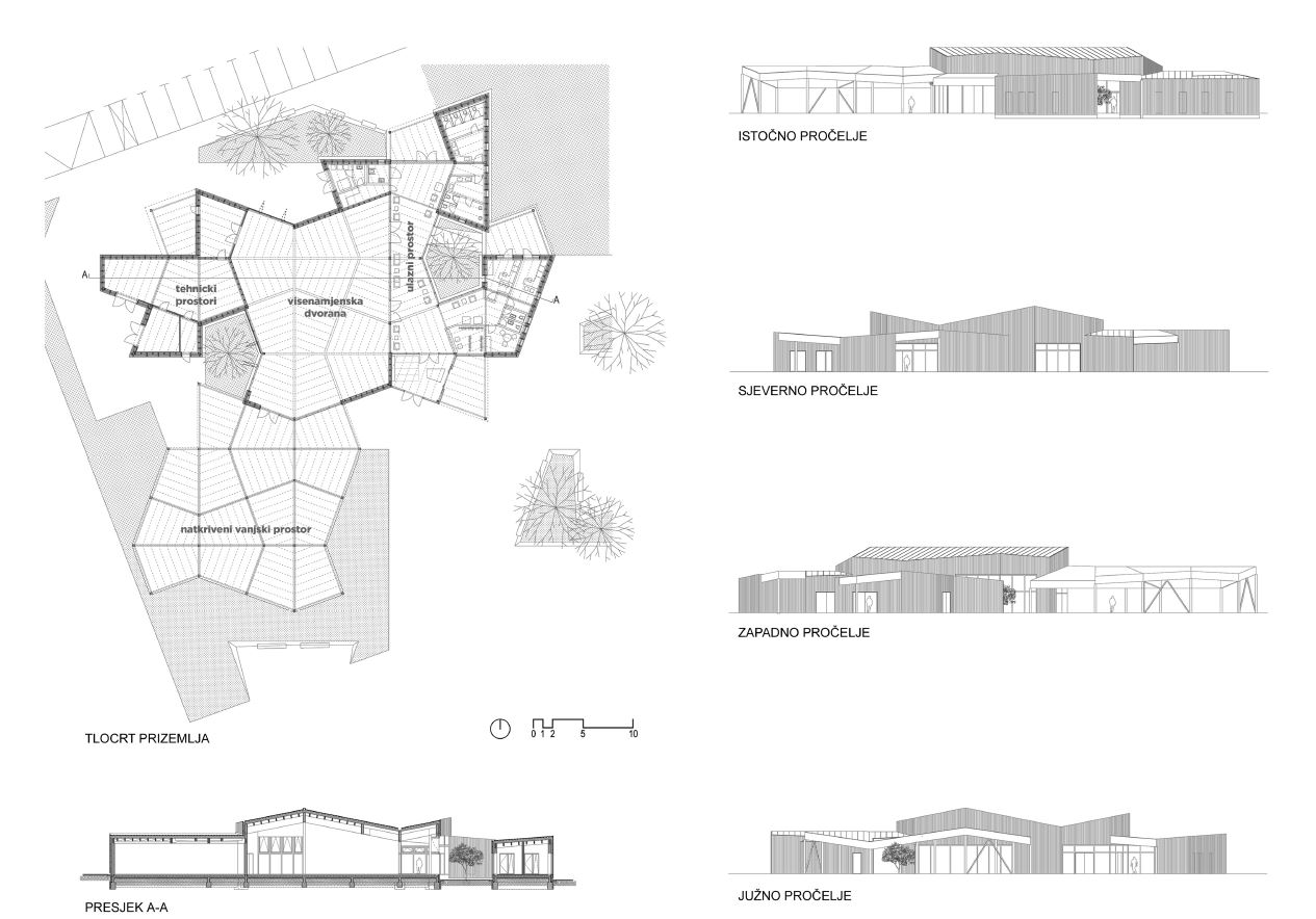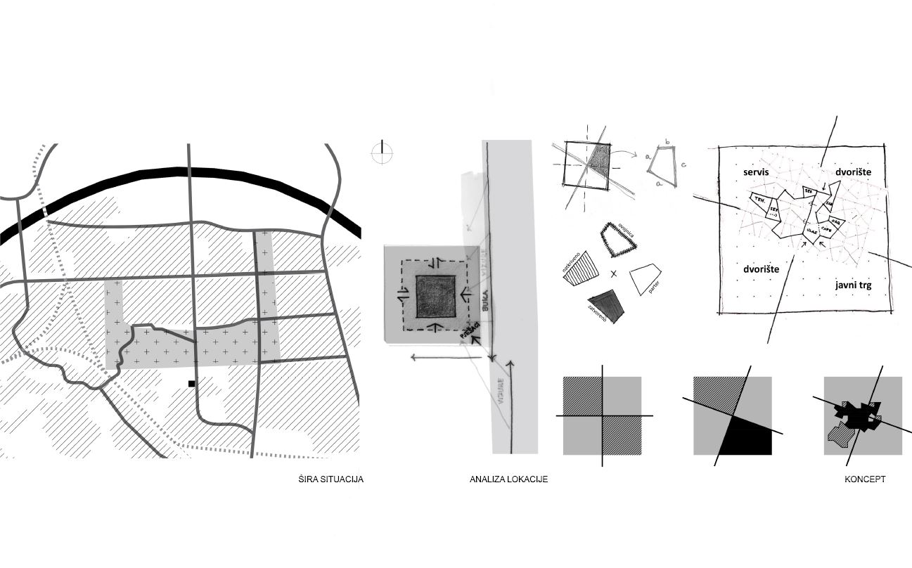 Analiza postojećeg stanja i projektnog zadatka rezultira osnom podjelom parcele na četiri dijela: jugoistočni pristupni javni trg, sjeverozapadni servisni pristup te dva perivoja. Osi koje dijele parcelu zarotirane su 20° čime se paviljon otvara prema kolnoj prilaznoj vizuri sa sjevera i pješačkom pristupu sa istoka. Smještanjem paviljona zapadno u odnosu na središte parcele formiran je prilazni trg u neposrednoj blizini stajališta javnog prometa i smanjen je utjecaj buke sa Avenije Većeslava Holjevca.