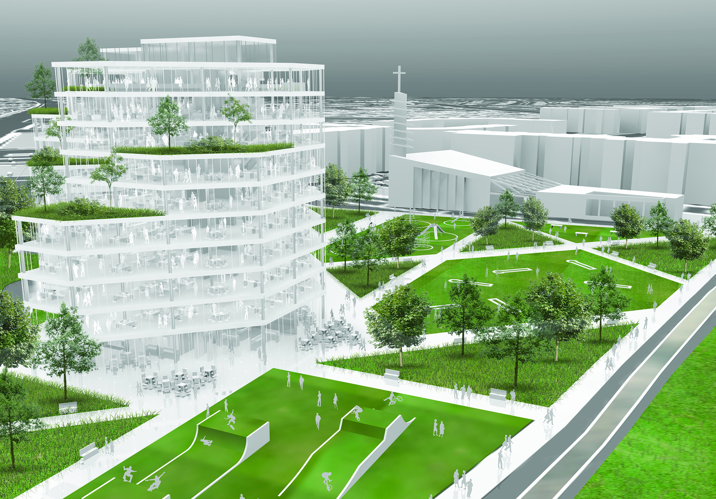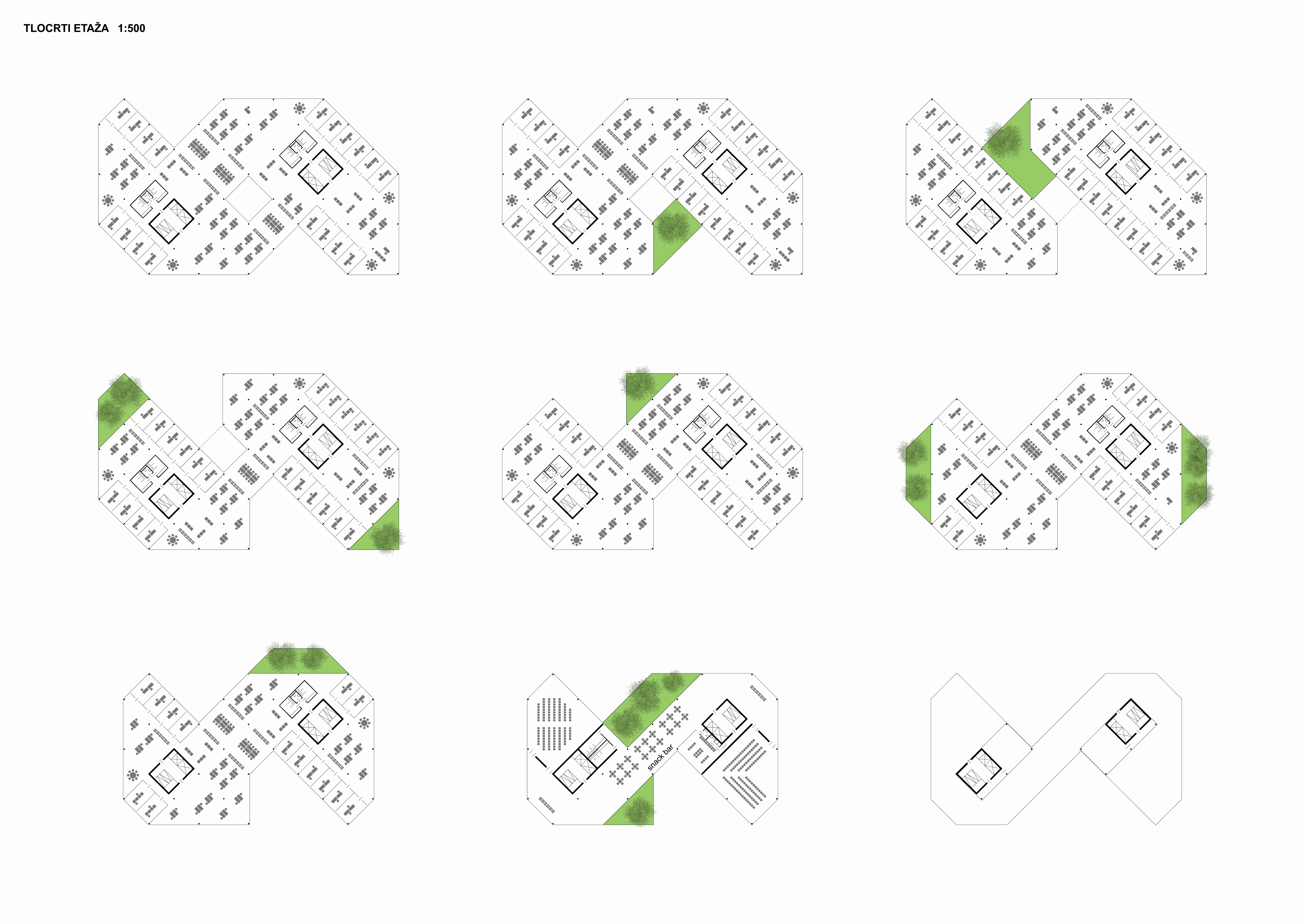 Planirana poslovne zgrada ima 20,000 m2 nadzemne površine koju čine 11 etaža, te 5 etaža garažnog prostora ukupne površine 17,500 m2. Zgrada je postavljena na racionalnom armiranobetonskom konstruktivnom rasteru stupova koji nose ploče različitih tlocrtnih gabarita čime je ostvarena mogućnost promjenljive tipologije korištenja unutrašnjeg prostora: individualni i grupni rad, sastanci, dvorane, itd. Izmicanjem i smanjivanjem gabarita stropnih ploča formirani su zeleni krovovi koji se ritmično nižu po etažama zgrade, te raščlanjuju i fragmentiraju njezin volumen. Zeleni krovni vrtovi stvaraju mikroambijente u kojima se prožimaju unutrašnji i vanjski prostor, a ujedno predstavljaju osnovni oblikovni element pročelja formirajući ideju poslovne zgrade kao svojevrsnog vertikalnog parka.