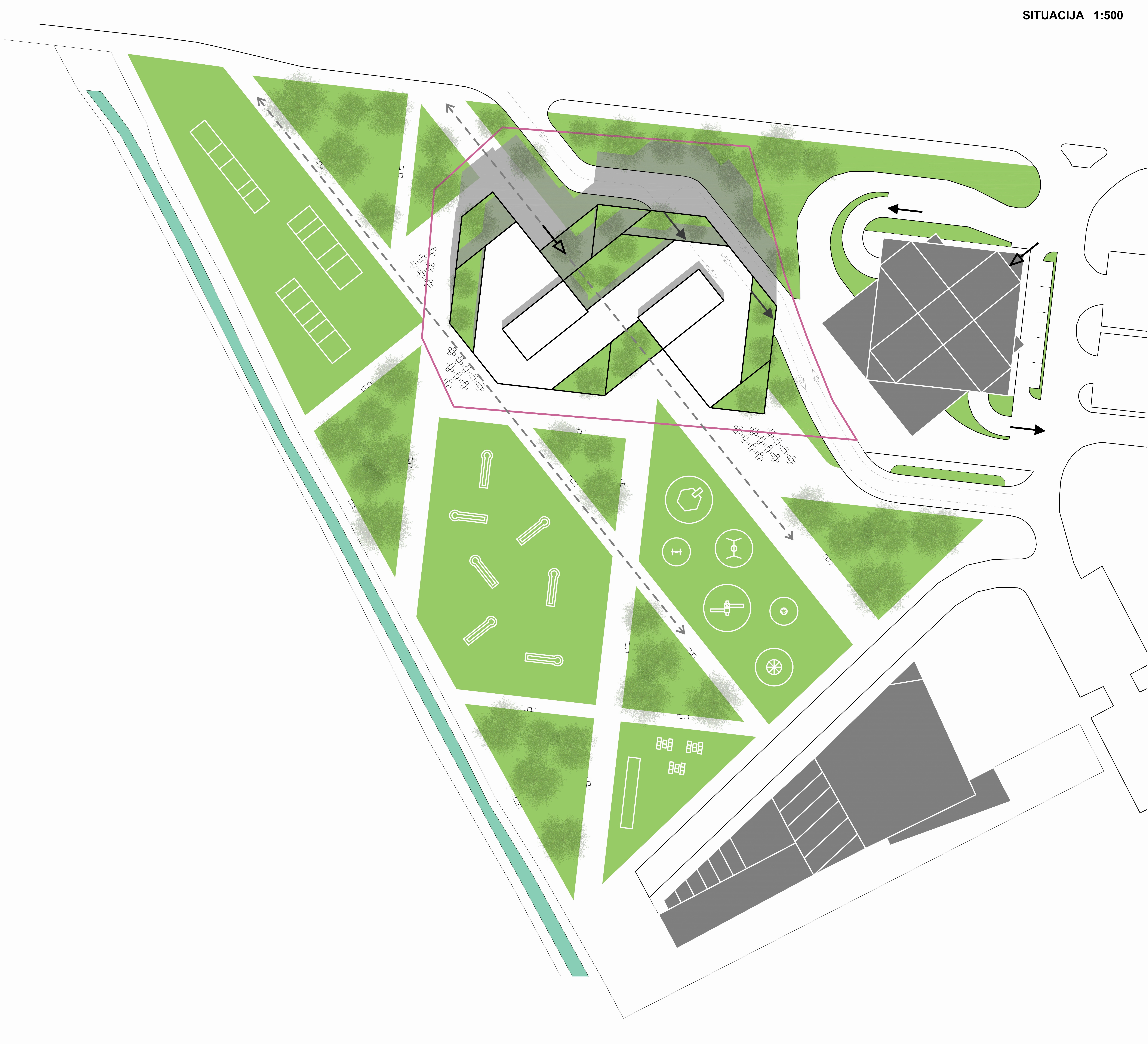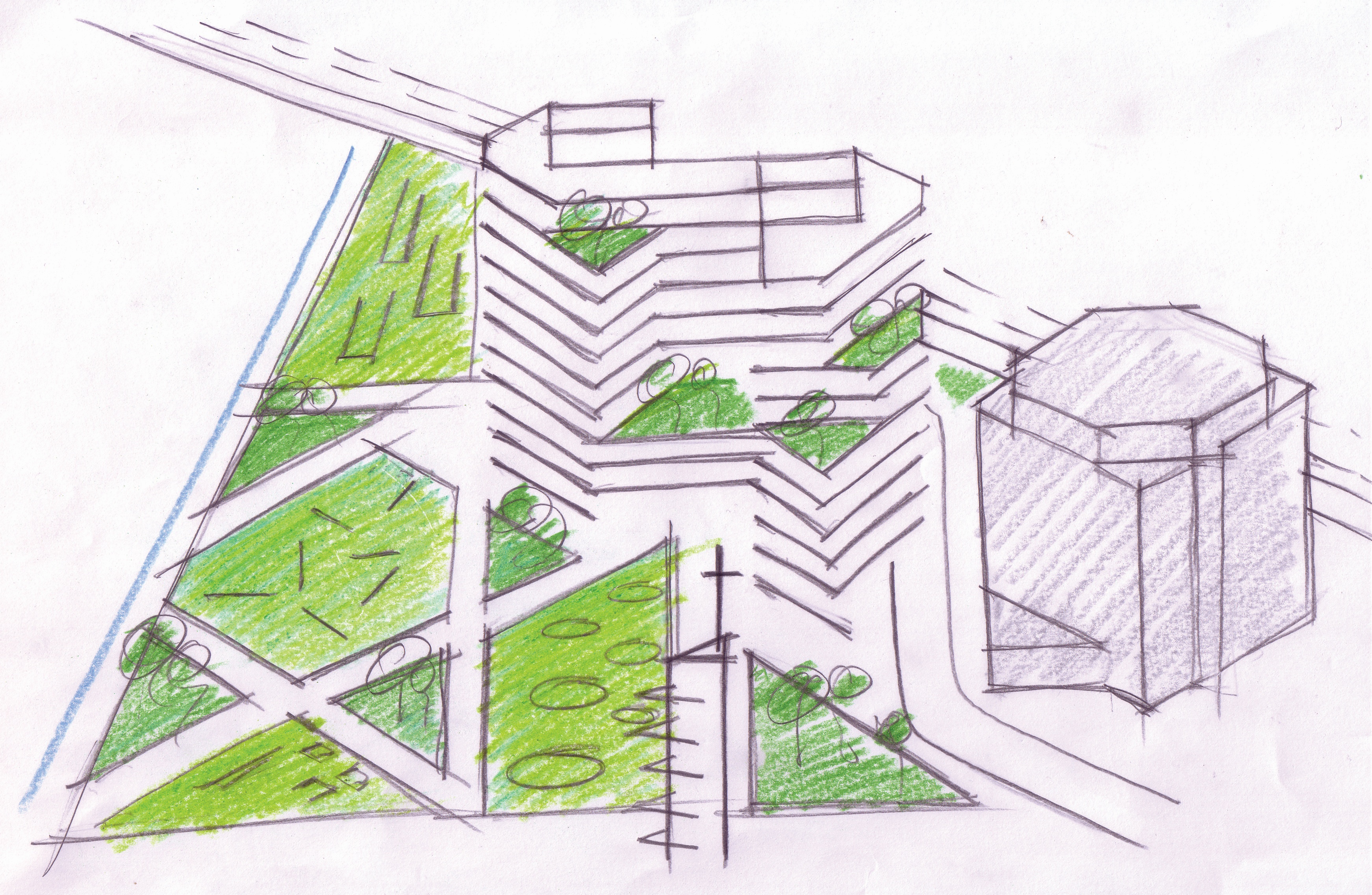 Park je koncipiran na mreži pješačkih staza koje uokviruju zelene otoke s drvećem po čijim rubovima su smještene klupe s pogledom na tematska polja za različite korisnike: dječje igralište, kutak za starije sa boćalištem, minigolf, te skejt park. Zeleni otoci s drvećem razbacani su po čitavoj plohi parka i nastavljaju se vertikalno nizati po etažama nove poslovne zgrade.