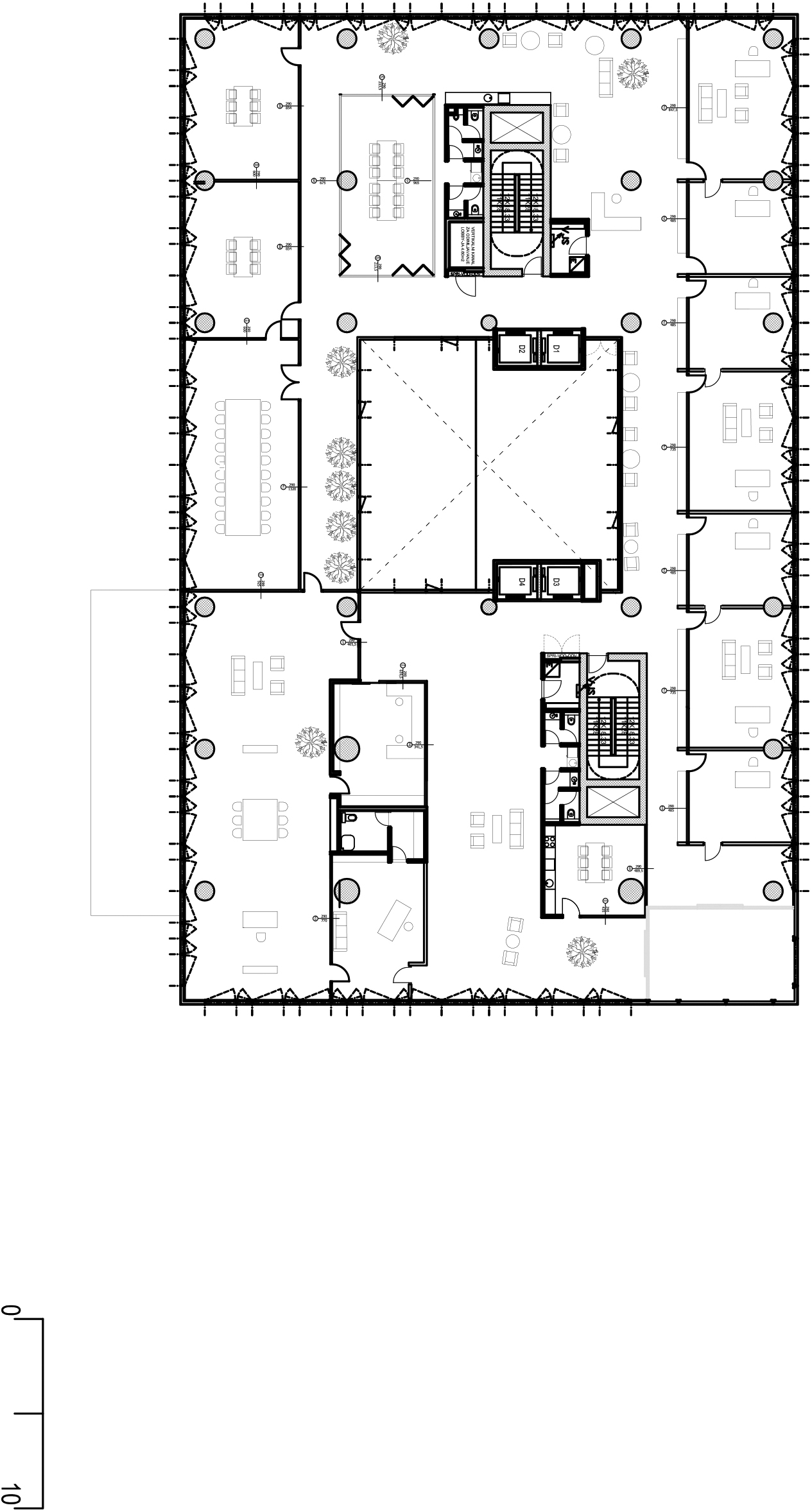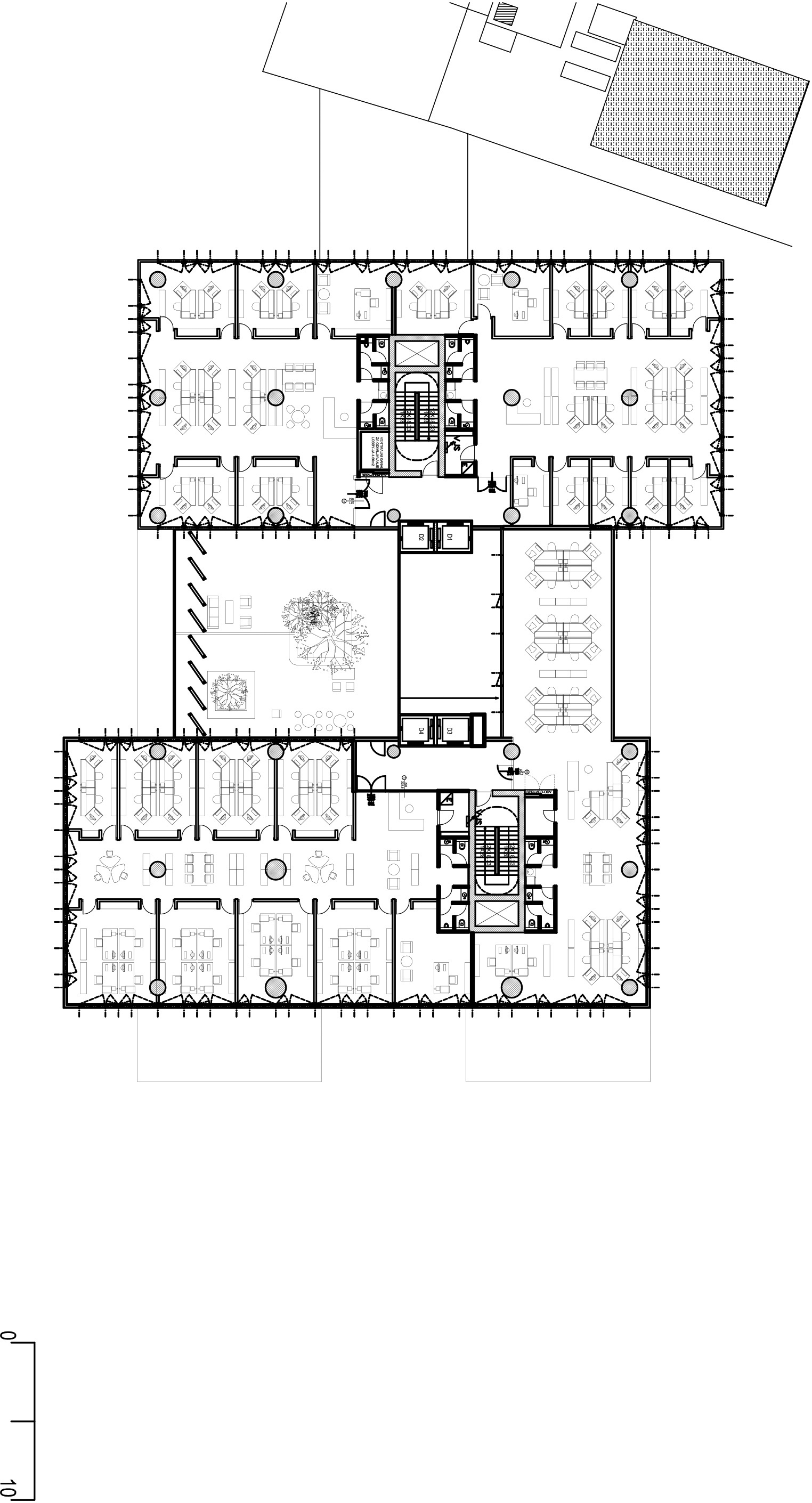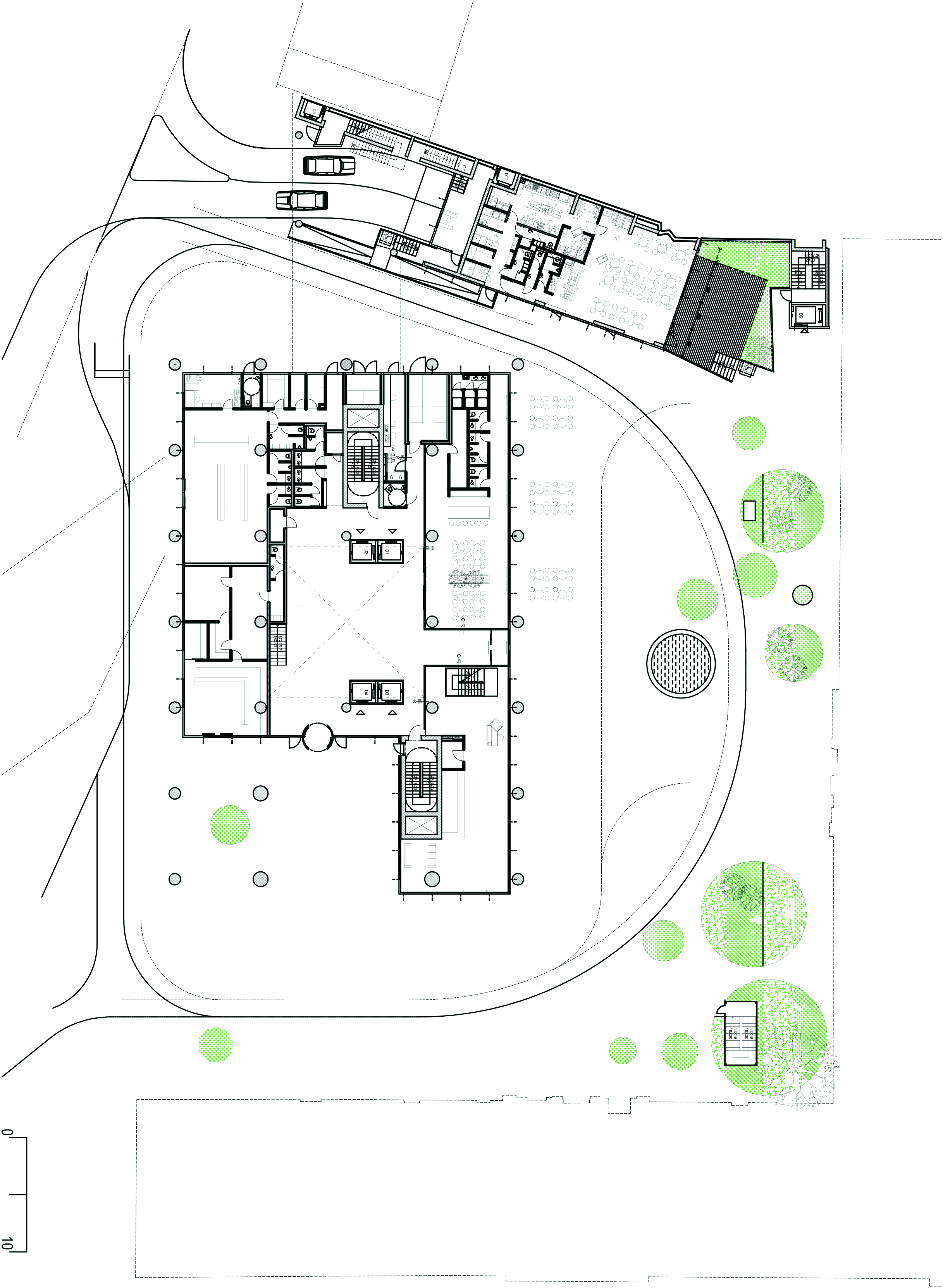 Nova građevina svojim volumenom sudjeluje u aktivaciji unutrašnjosti bloka formirajući unutrašnji trg. Povećanje slobodnog prostora kao javnog, hortikulturno i parterno riješenog trga omogućava slobodan pristup budućem