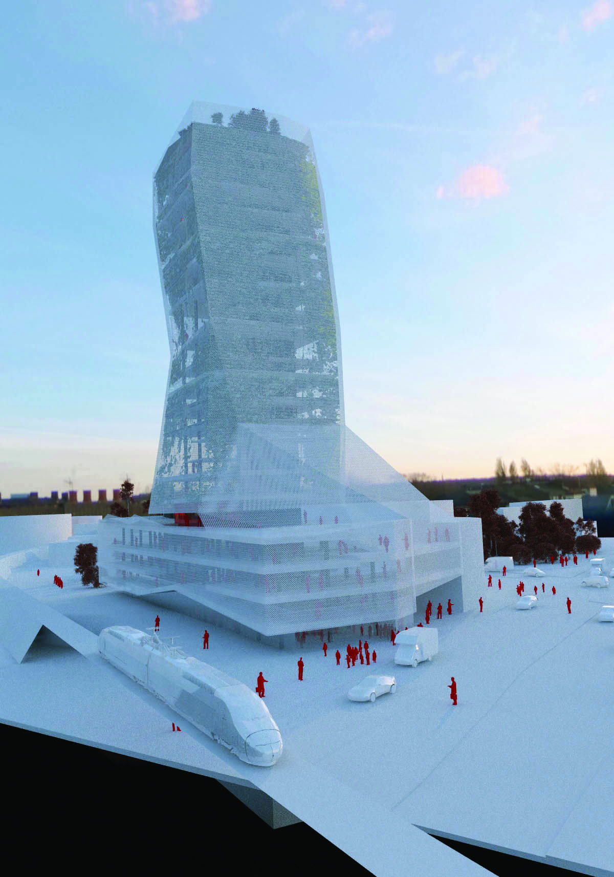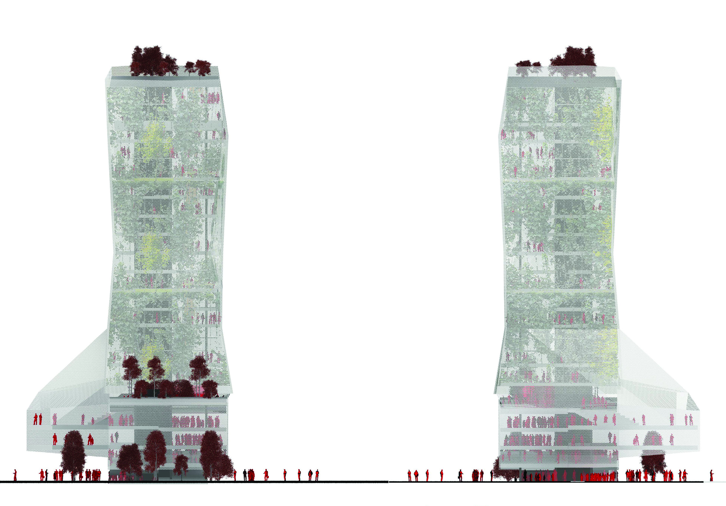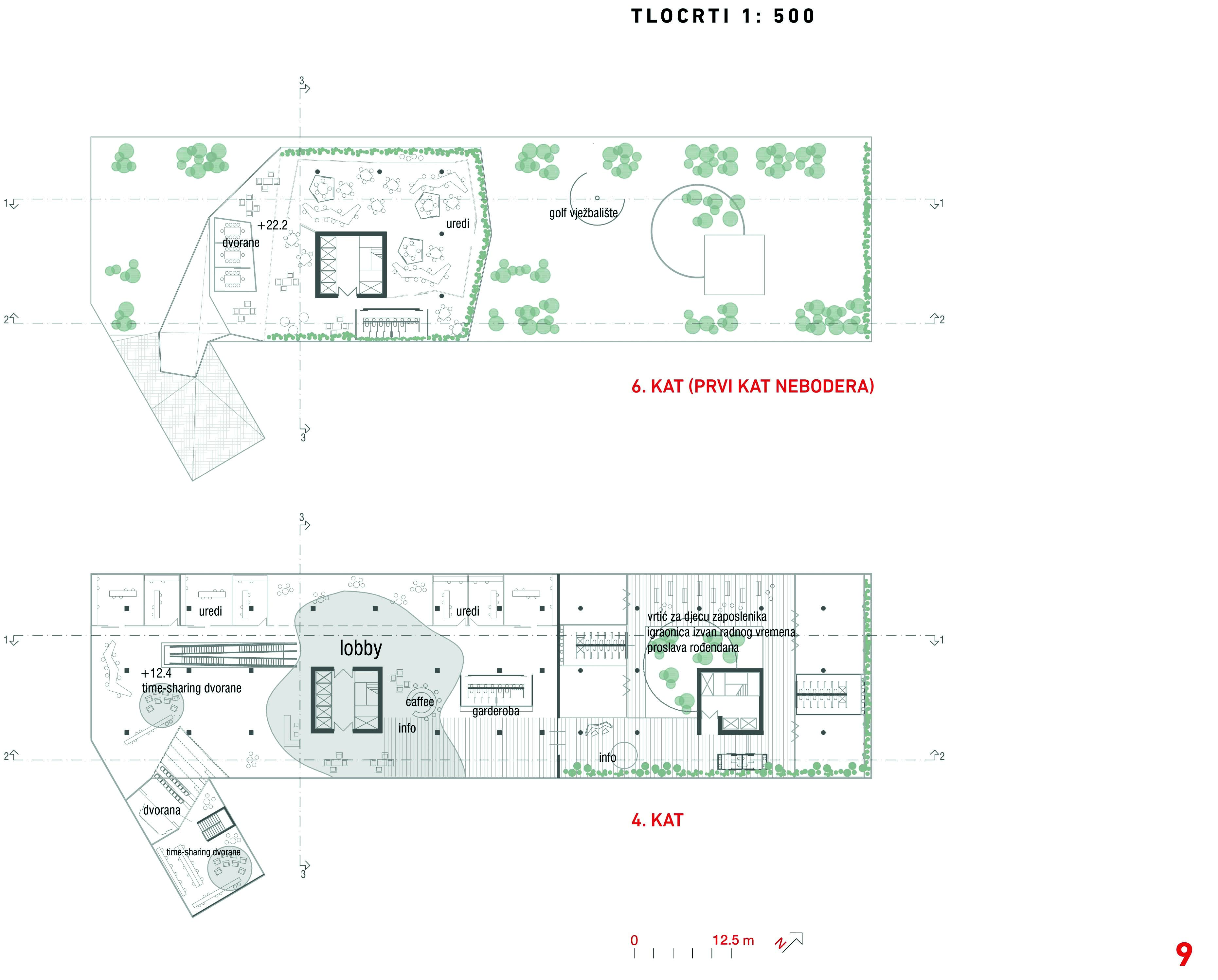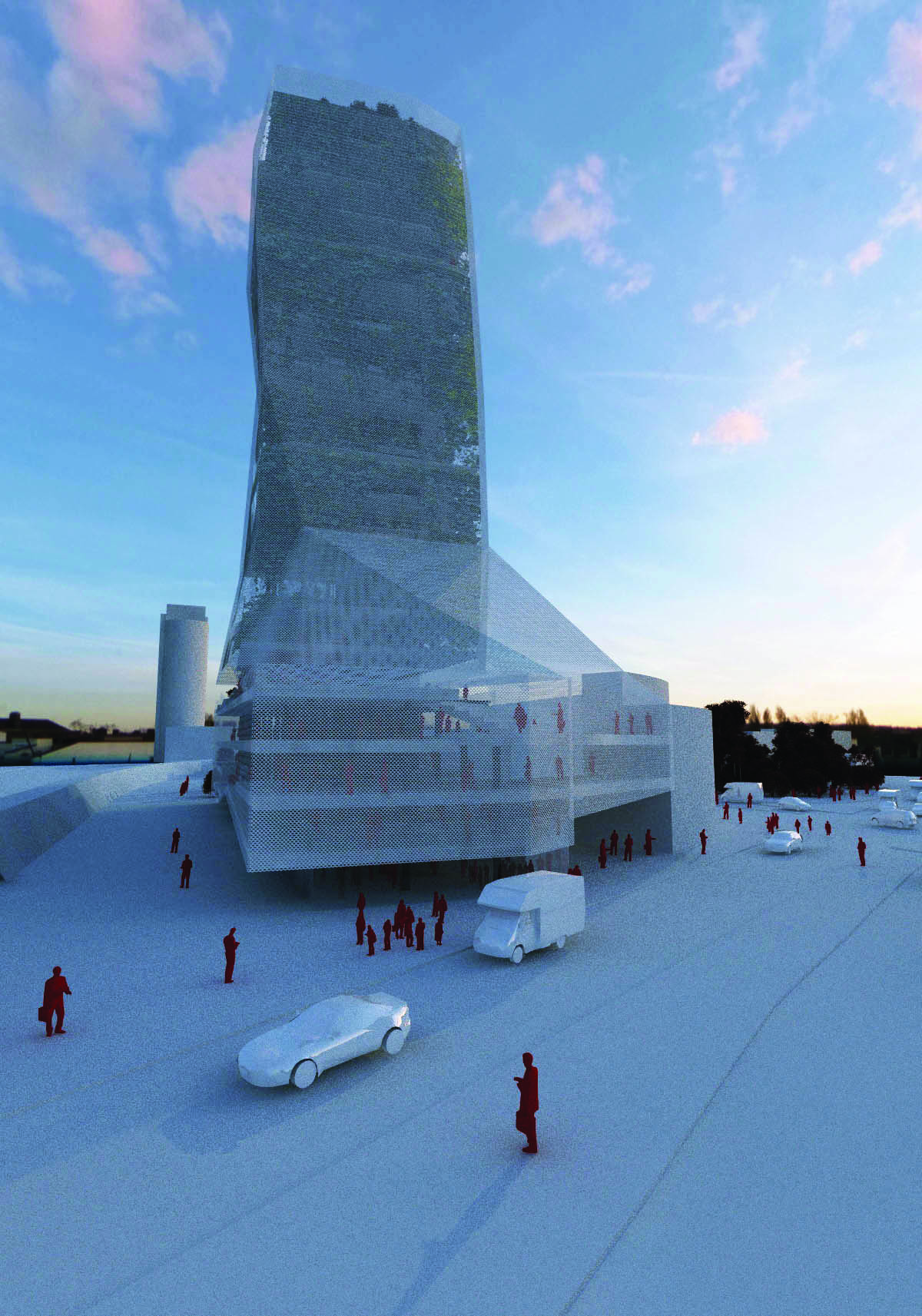 Zelenim ‘jezicima’, linearnim prodorima, atrijima i potpuno ozelenjenim krovom kompleks poslovne građevine potpuno je integriran sa planiranim javnim parkom sa sjeverne strane obuhvata. Kompleks je tretiran kao jedno skulpturalno tijelo, jer njegova visina, zbog urbanističkih ograničenih uvjeta, zahtijeva projekt ‘antinebodera’. Cijelo tijelo je kompaktno i sastoji se od 3 primarne cjeline: horizontalnog volumena ( u čijim se podzemnim etažama smještaju parkirališta, servis, skladišta) te vertikalni toranj, koji preko vezivnog elementa iz horizontale prelazi u vertikalu. Na taj način postignuta je dinamičnost i individualnost u kontekstu drugih zagrebačkih nebodera.