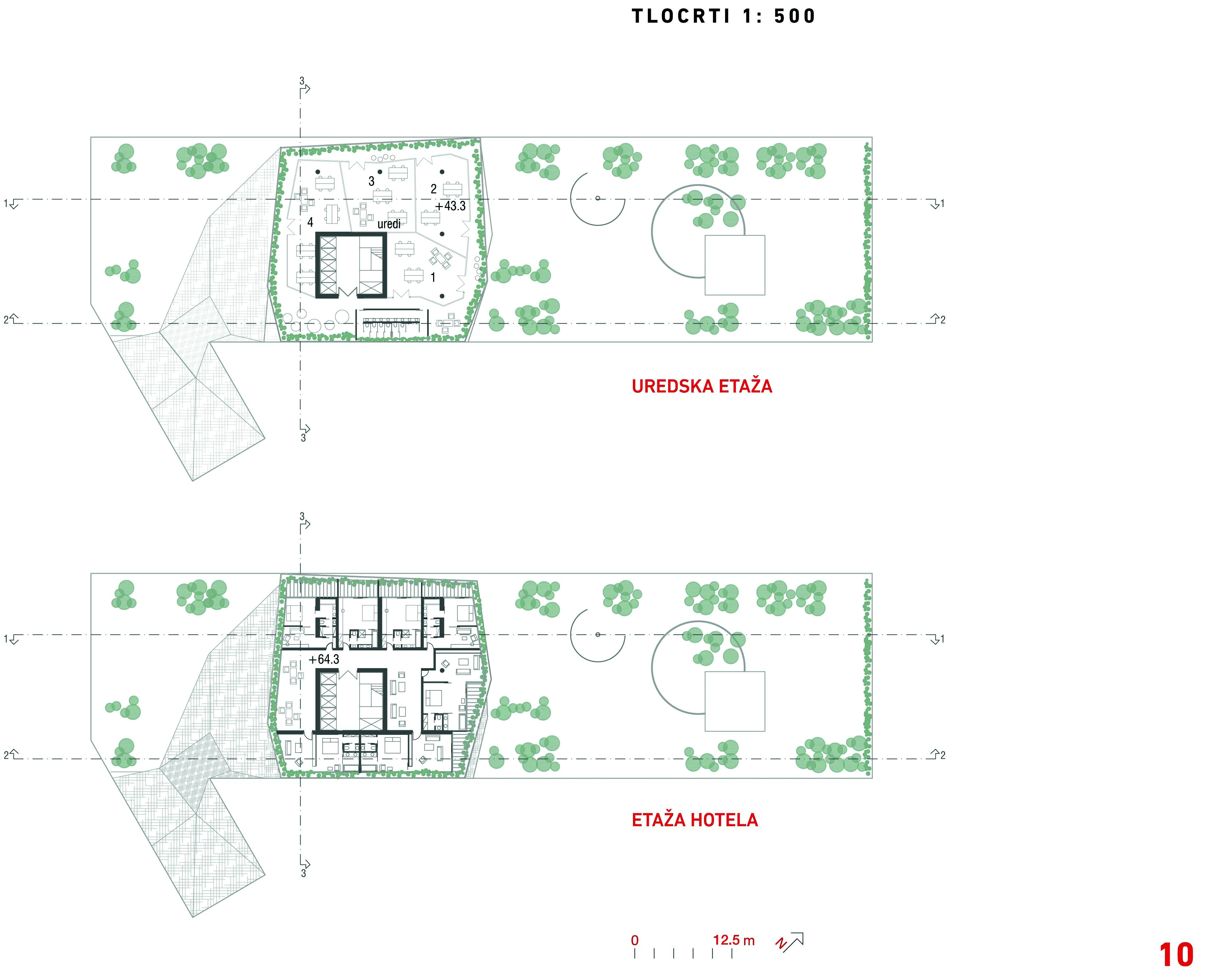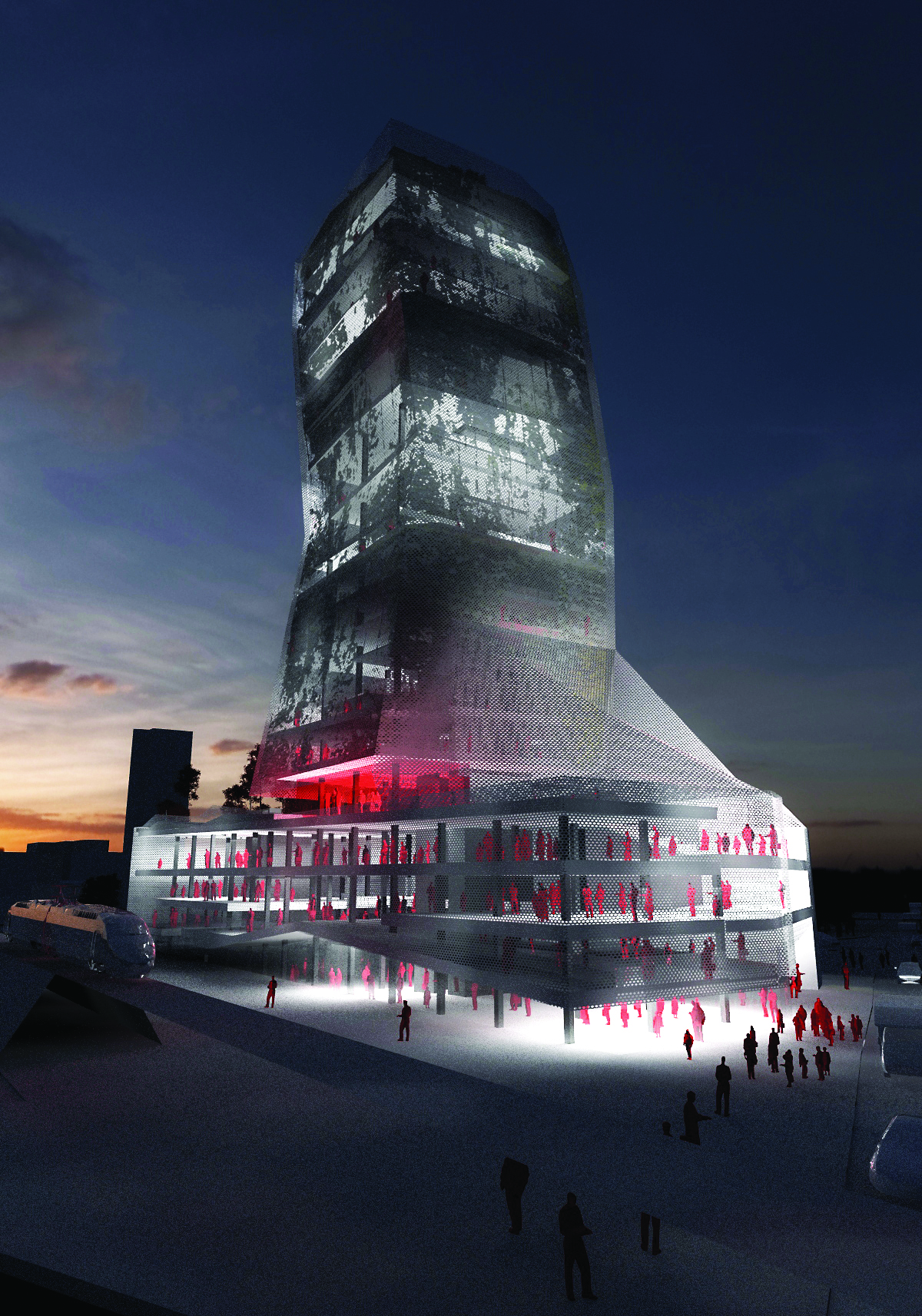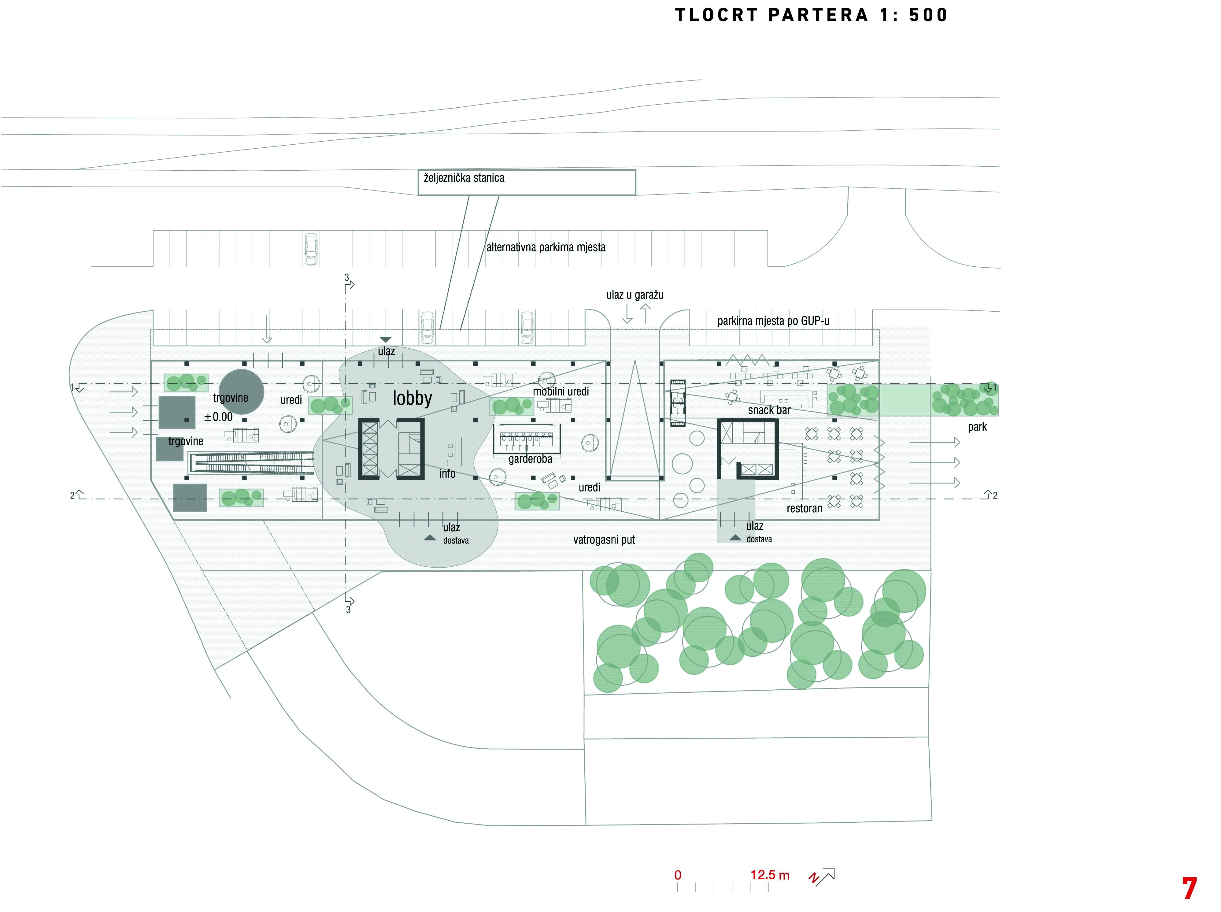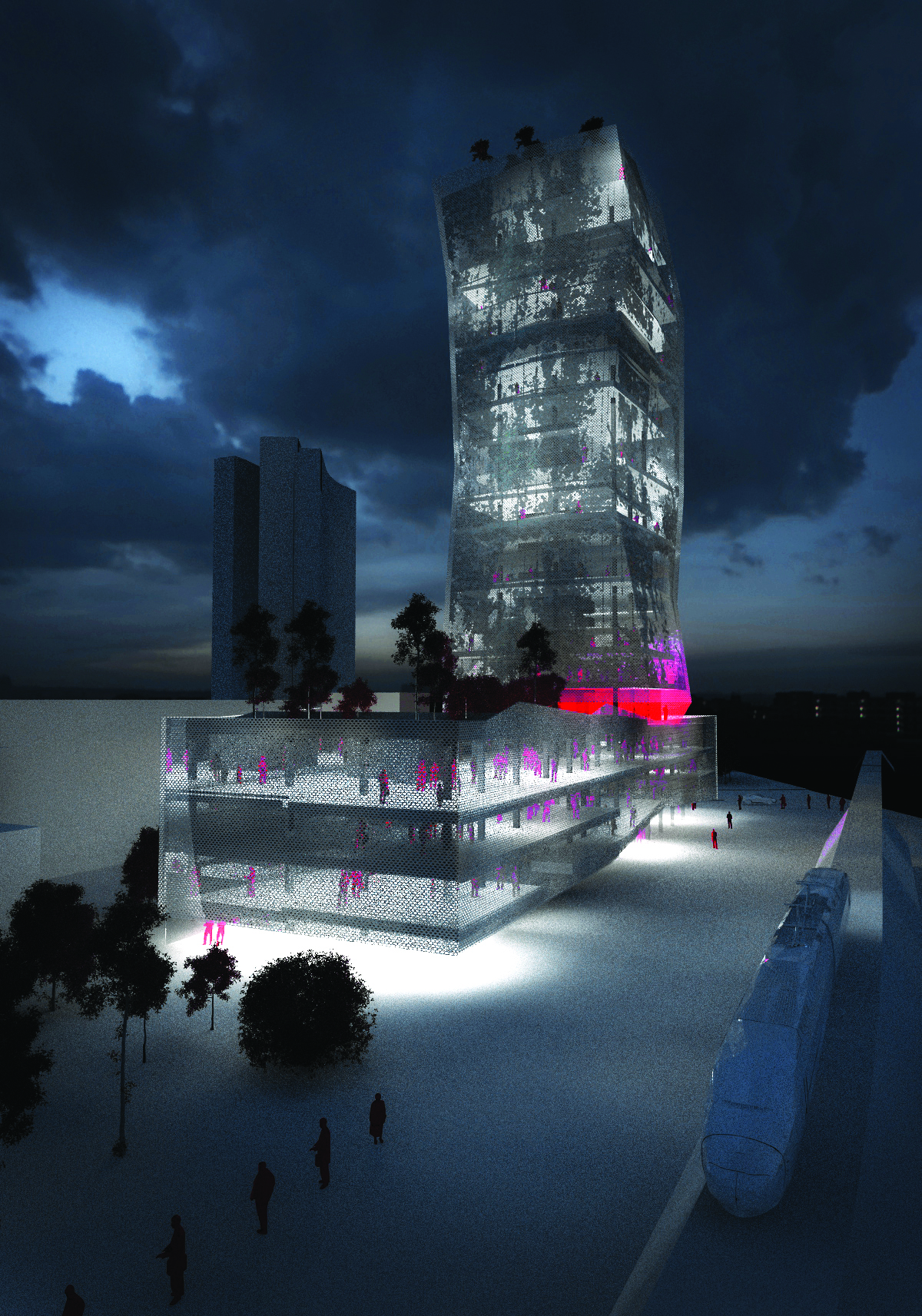 Zelenim ‘jezicima’, linearnim prodorima, atrijima i potpuno ozelenjenim krovom kompleks poslovne građevine potpuno je integriran sa planiranim javnim parkom sa sjeverne strane obuhvata. Kompleks je tretiran kao jedno skulpturalno tijelo, jer njegova visina, zbog urbanističkih ograničenih uvjeta, zahtijeva projekt ‘antinebodera’. Cijelo tijelo je kompaktno i sastoji se od 3 primarne cjeline: horizontalnog volumena ( u čijim se podzemnim etažama smještaju parkirališta, servis, skladišta) te vertikalni toranj, koji preko vezivnog elementa iz horizontale prelazi u vertikalu. Na taj način postignuta je dinamičnost i individualnost u kontekstu drugih zagrebačkih nebodera.