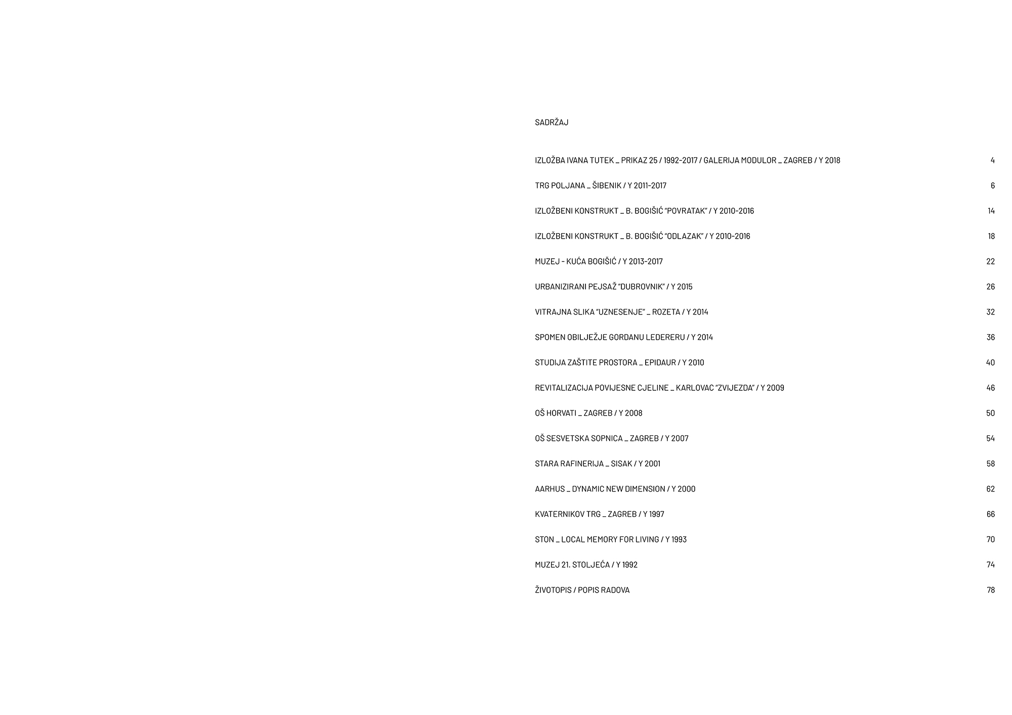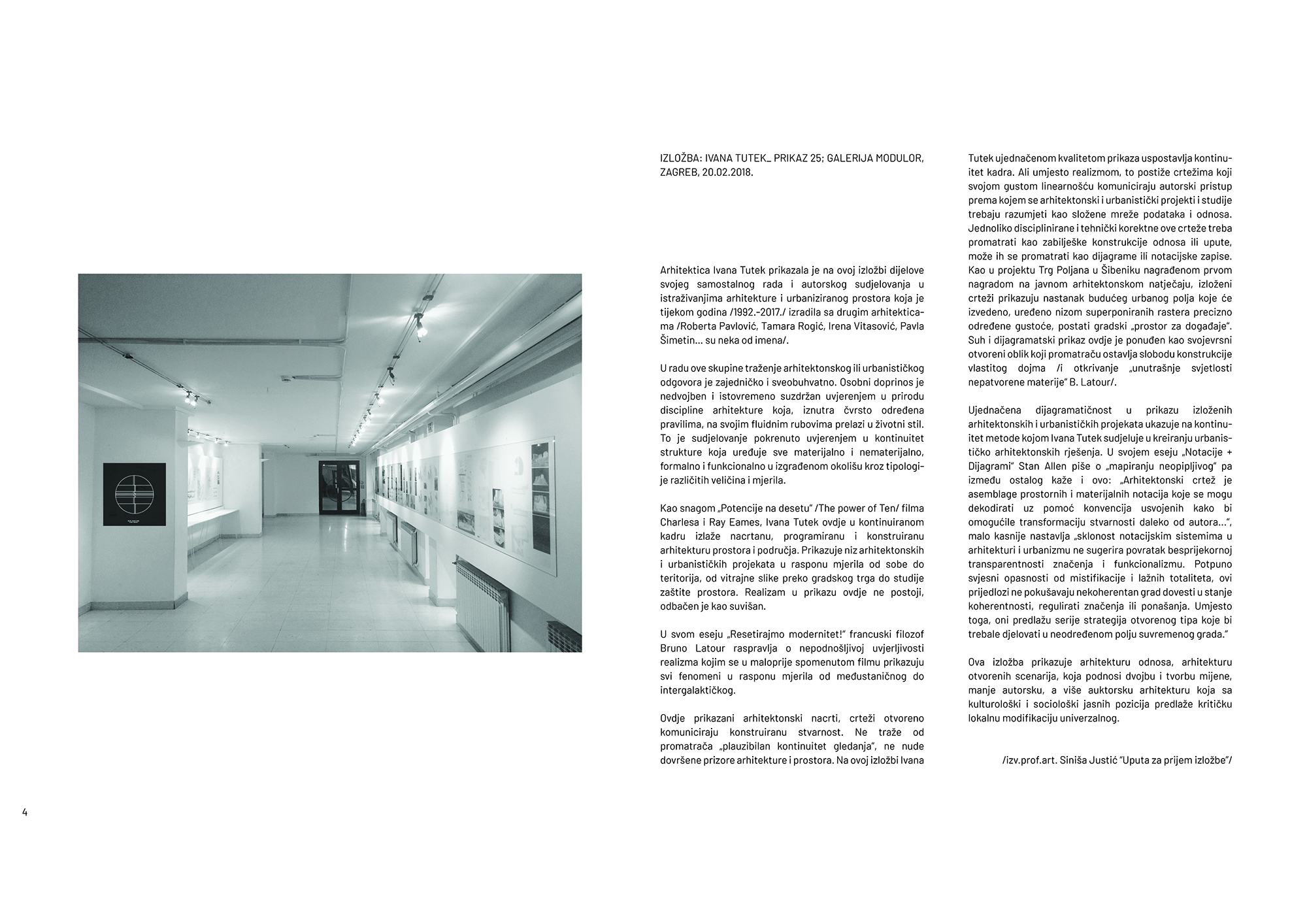 Arhitektica Ivana Tutek prikazala je na ovoj izložbi dijelove svojeg samostalnog rada i autorskog sudjelovanja u istraživanjima arhitekture i urbaniziranog prostora koja je tijekom godina /1992.-2017./ izradila sa drugim arhitekticama /Roberta Pavlović, Tamara Rogić, Irena Vitasović, Pavla Šimetin… su neka od imena/.
