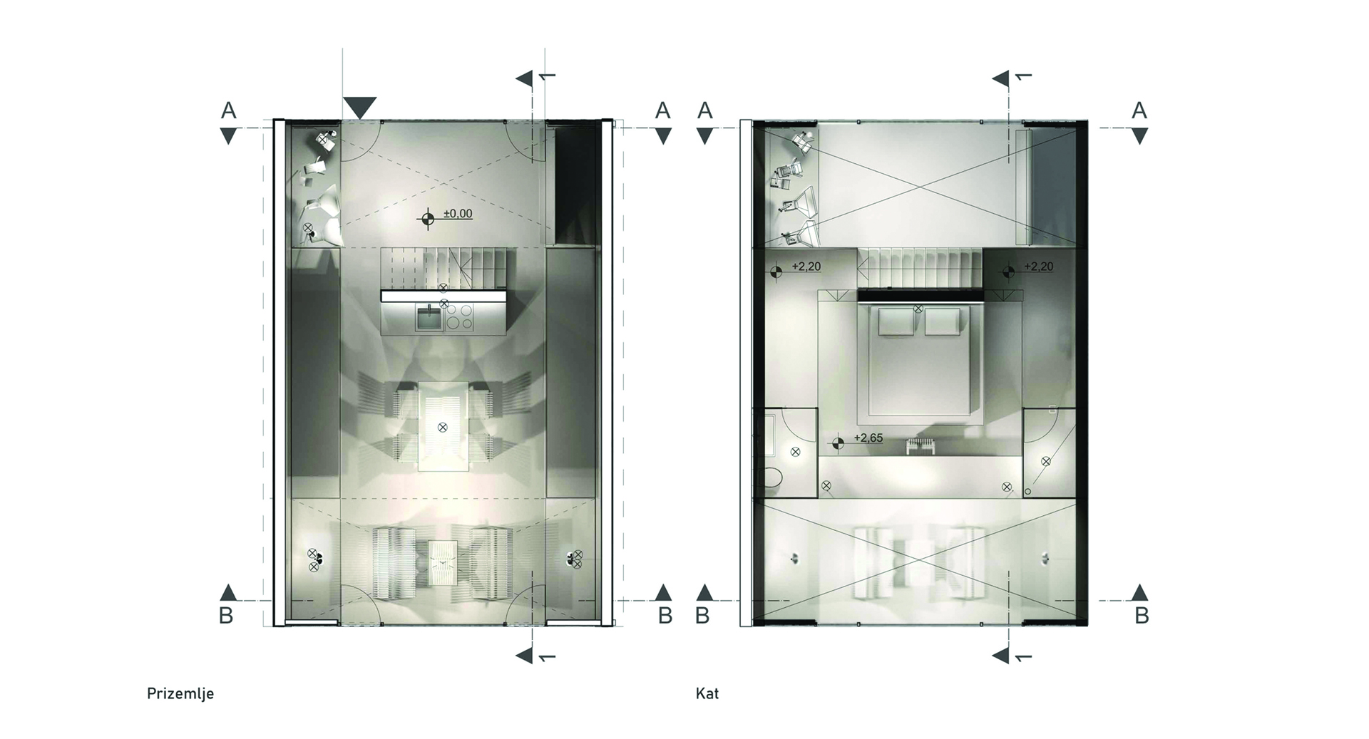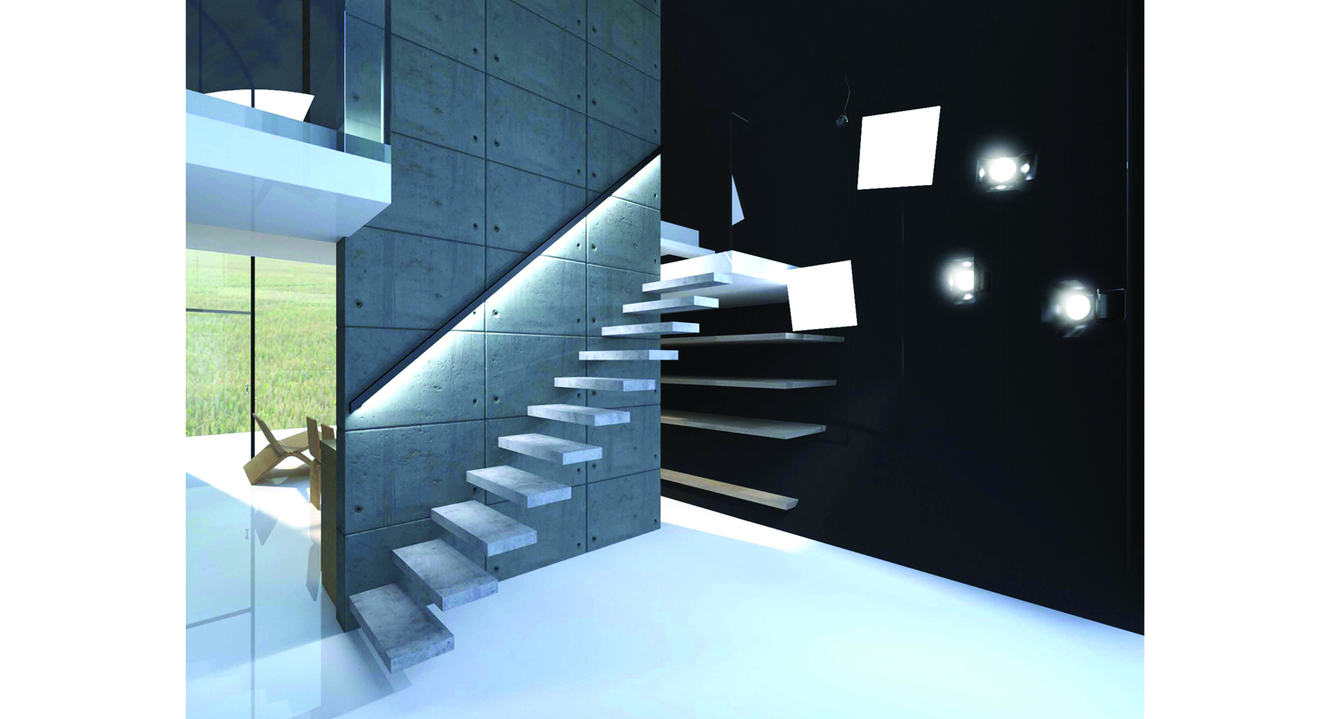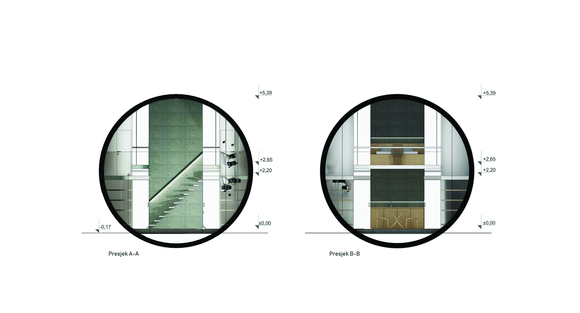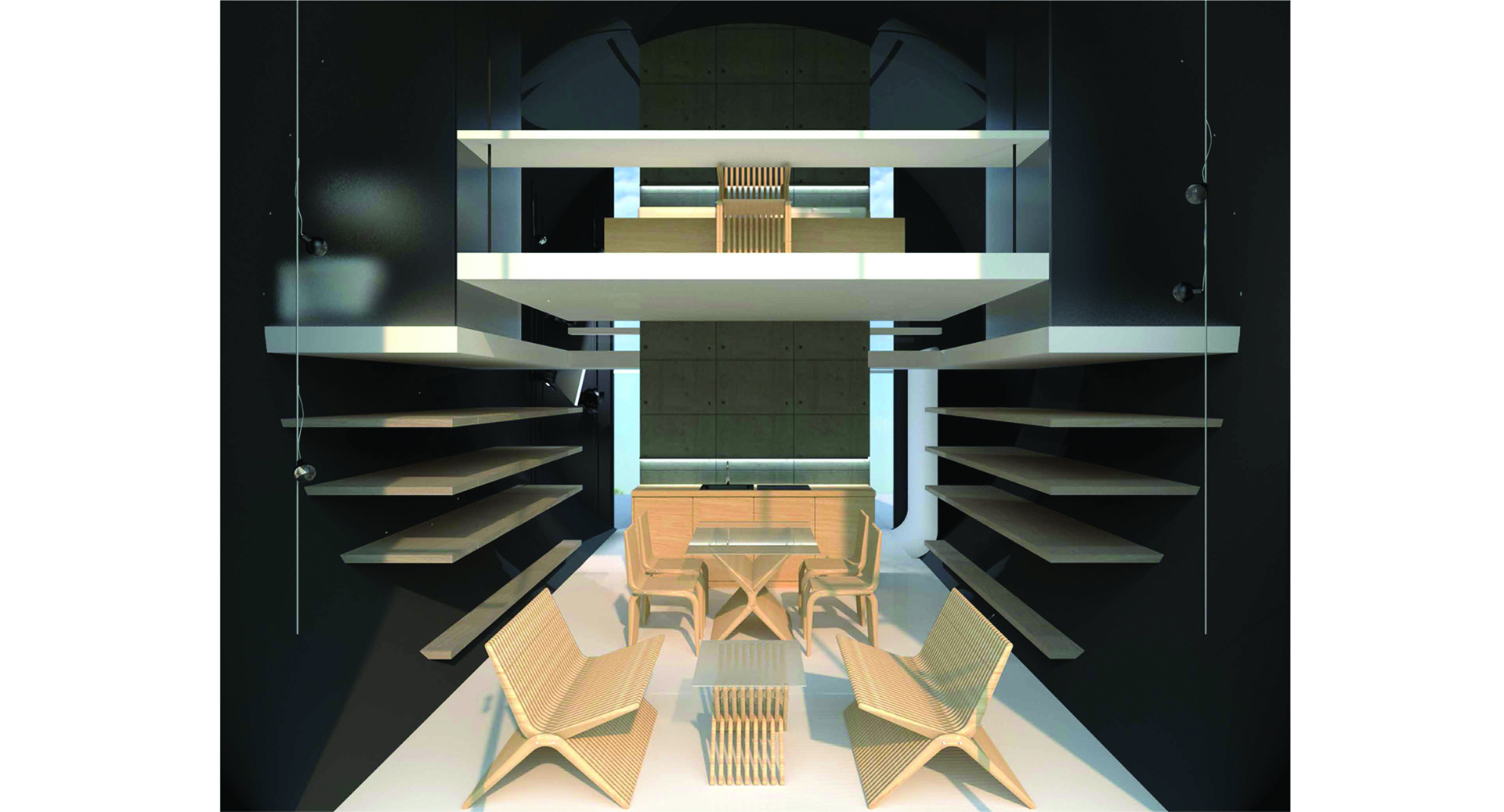 Zadana je prostorna jedinica forme valjka i unutarnjih dimenzija Ø6 x 9 m. Valjak je armiranobetonski modul debljine 25 cm. Unutar zadanog volumena smještenog na obronku Medvednice oblikovan je prostor za stanovanje i rad namijenjen fotografu. Dnevni prostor i radno mjesto na galeriji orijentirani su prema jugu, u smjeru pružanja pogleda prema Zagrebu i okolici kako bi korisnik u svakom trenutku mogao odabrati potencijalan kadar. U sjevernom je dijelu valjka fotostudio s opremom potrebnom za portretiranje ljudi. Armiranobetonska stijena dijeli unutarnji volumen na radni, ujedno i ulazni prostor te stambeni dio koji jednostavnim sklapanjem projektiranog namještaja postaje izložbena galerija. Stubište, kuhinja i krevet su kao fiksni elementi interijera vezani uz AB stijenu koja štiti fotostudio od direktnog sunčevog svjetla. Otvor sa sjeverne strane omogućava povoljnu, difuznu dnevnu rasvjetu studija. Stropna ploča vertikalno zonira prostor na javnu ulaznu etažu i intimniji, privatni prostor galerije. Fotostudio i prostor boravka dodatno su naglašeni dvostrukom visinom, čime je omogućen prodor svjetla u dubinu. Nedostatak bočnog svjetla koji je posljedica jednolikog poprečnog presjeka valjka nametnuo je jednak tretman istočnog i zapadnog dijela unutarnjeg prostora što je naglašeno simetričnom organizacijom oko duže osi. Valjak je bojan u crno kako bi se granice prostora doživjele u neutralnom kontinuitetu i kako bi se pojačao dojam lebdenja bijelih horizontala.