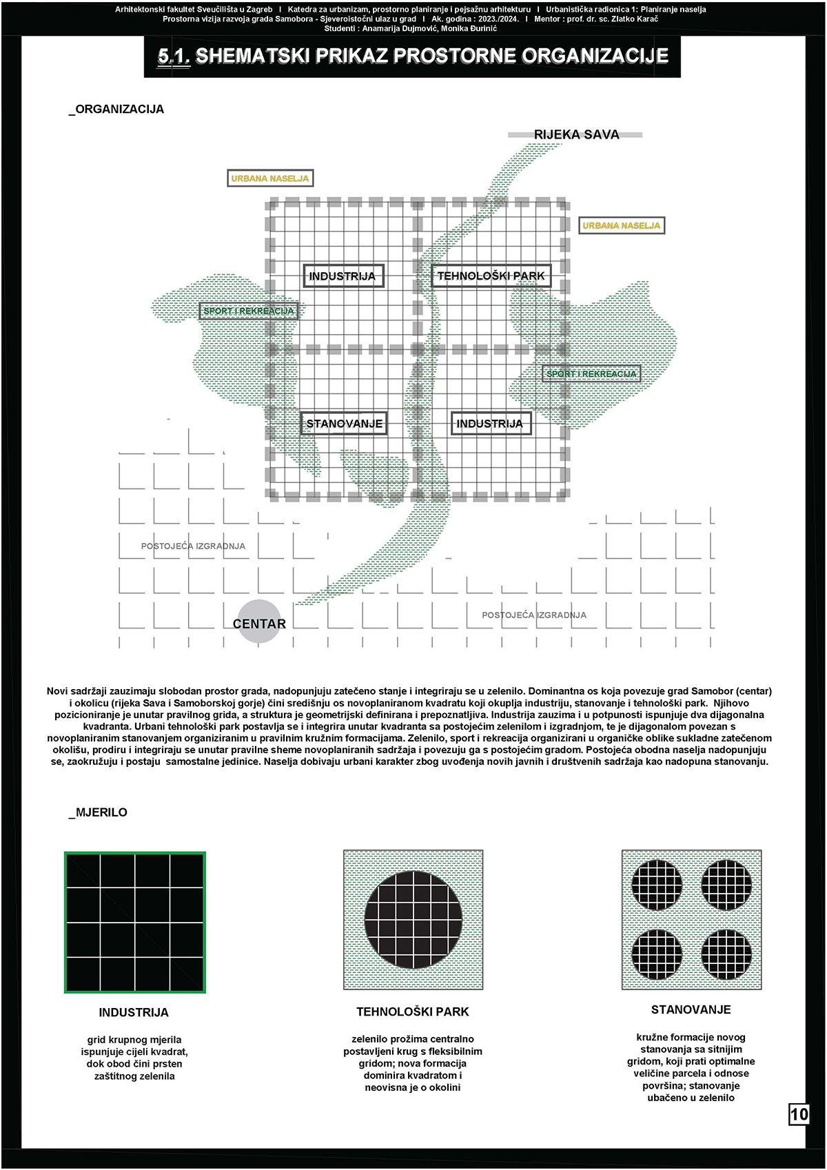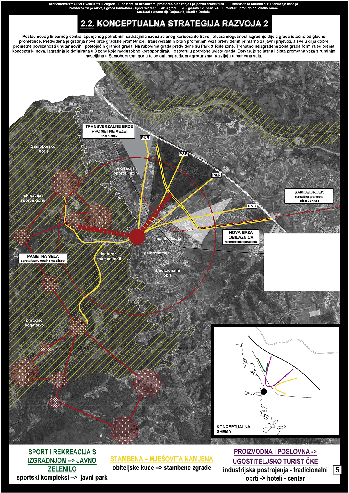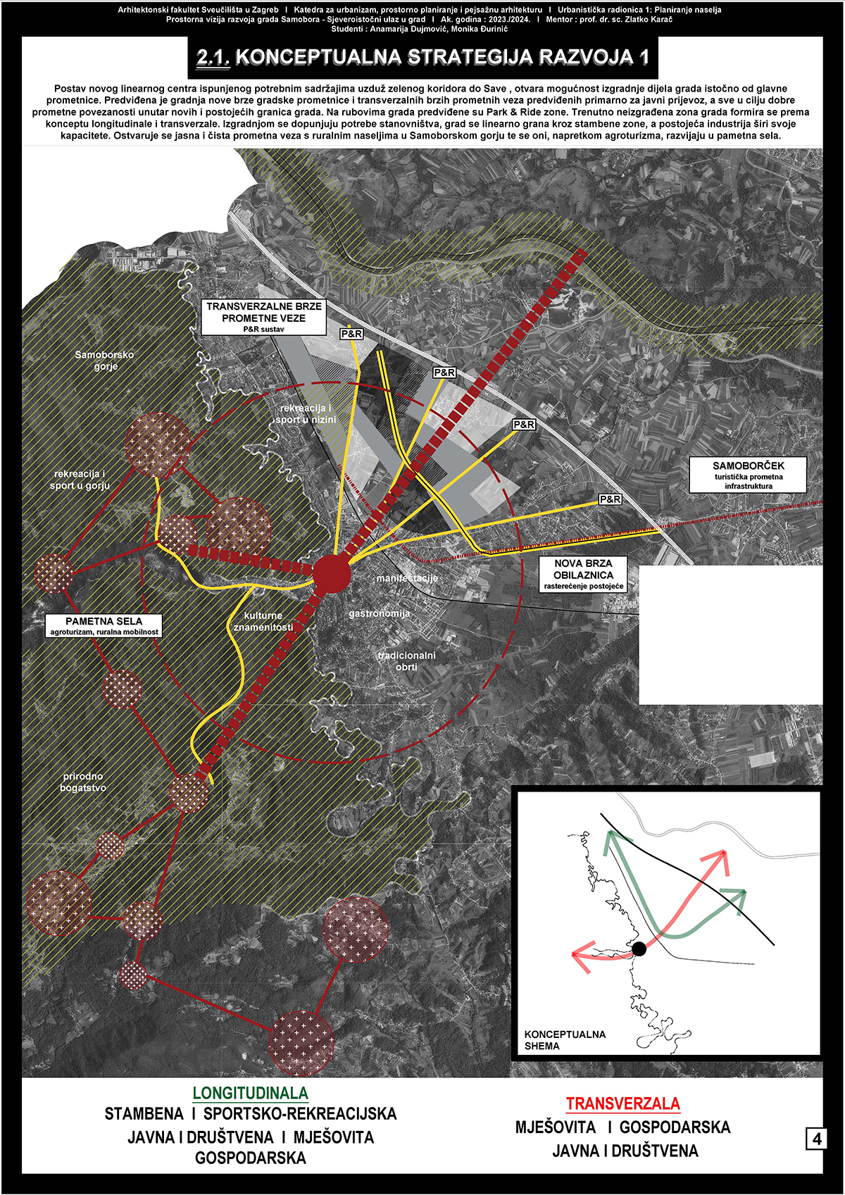 Koncept prostorne strategije bazira se na formiranju novog neizgrađenog dijela grada kontrirajući postojećoj nepravilnoj izgradnji. U prazan prostor postavlja se snažan pravilan grid sadržaja smješten unutar konteksta zatečenog amorfnog zelenila. Zelenilo prodire i dominira nad strogim novoplaniranim kvadratnim gridom, te ga povezuje sa postojećom izgradnjom. Zelenilo naglašava i novu dominantu grada kojom se formira linearni centar. Linearni centar započinje u povijesnom kulturnom središtu grada, prolazi kroz ključne komunikacijske točke, zatim kroz novi grid sadržaja da bi naposljetku, prateći postojeći potok Gradna, oformio snažnu vezu sa zelenim okolnim prostorom rijeke Save i na taj način pružio gradu mogući novi smjer razvoja (turistički gledano).