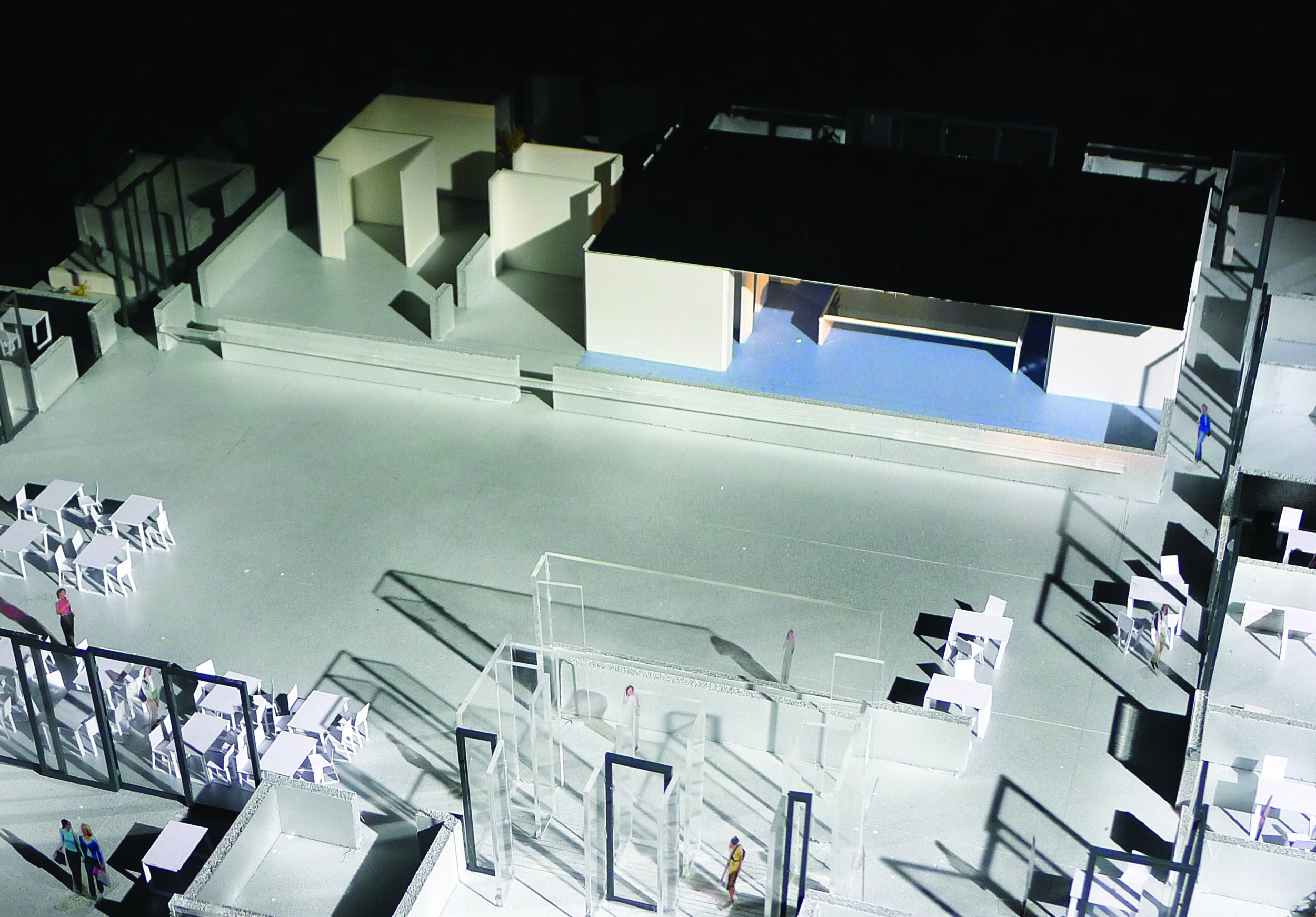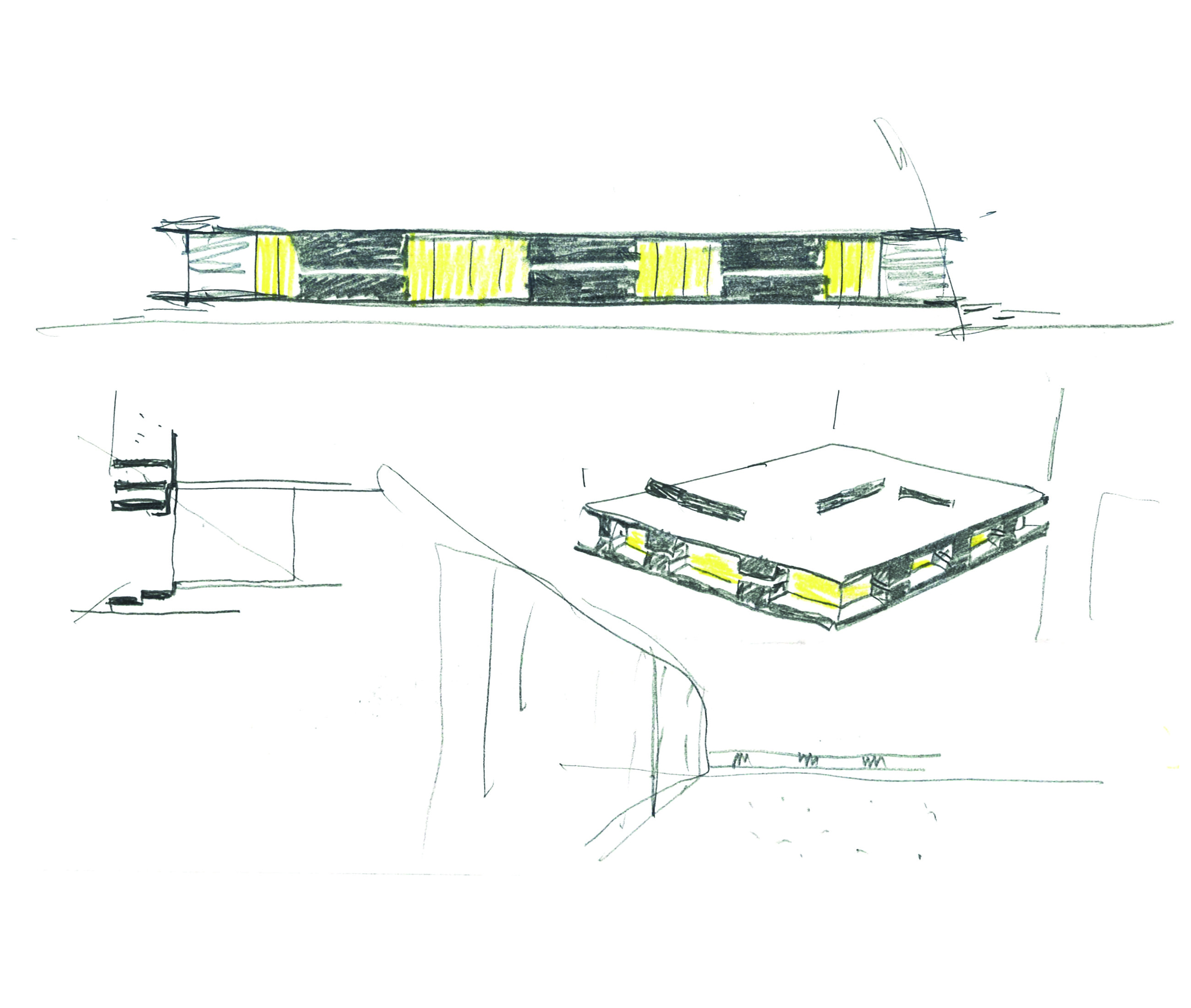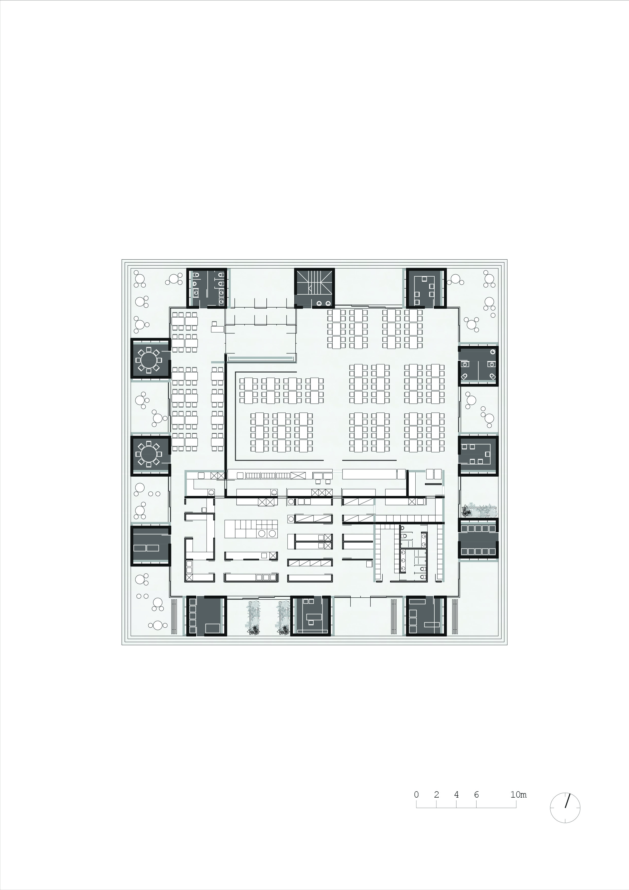 Središnji je prostor podijeljen na zonu samoposlužnog restorana, restorana a la carte i komfornu, u potpunosti funkcionalno organiziranu kuhinju. Dodatni element koji građevini daje jedinstvenost horizontalni je rez u visini oka kod sjedenja. Na taj način građevina nije podijeljena na gornju i donju ploču sa zidovima između. Uz donju plohu jasno su povezani zidovi do visine 120 cm, a sastavni su dio stropne ploče nosive grede i ostale vertikalne pregrade više od 150 cm. Ovakvim horizontalnim potezom građevina se doima kao da je u pomaku, kao da se uspostavlja novi red, mirnoća koja se osjeti tek kad se sjedne.