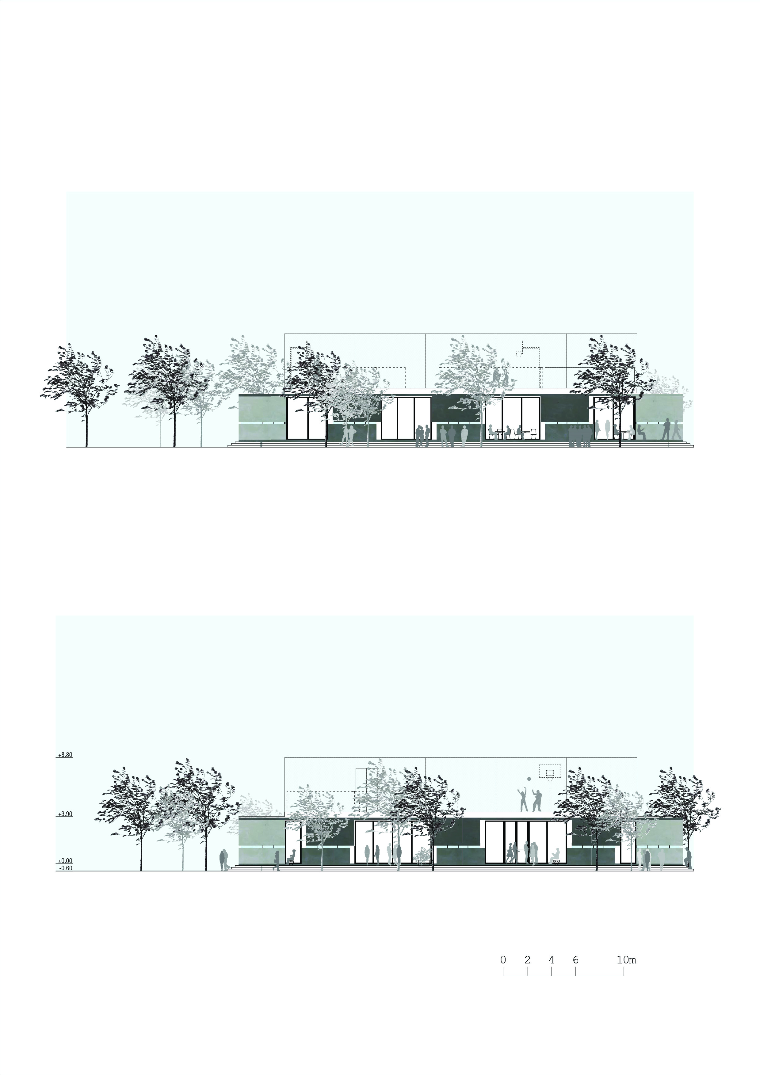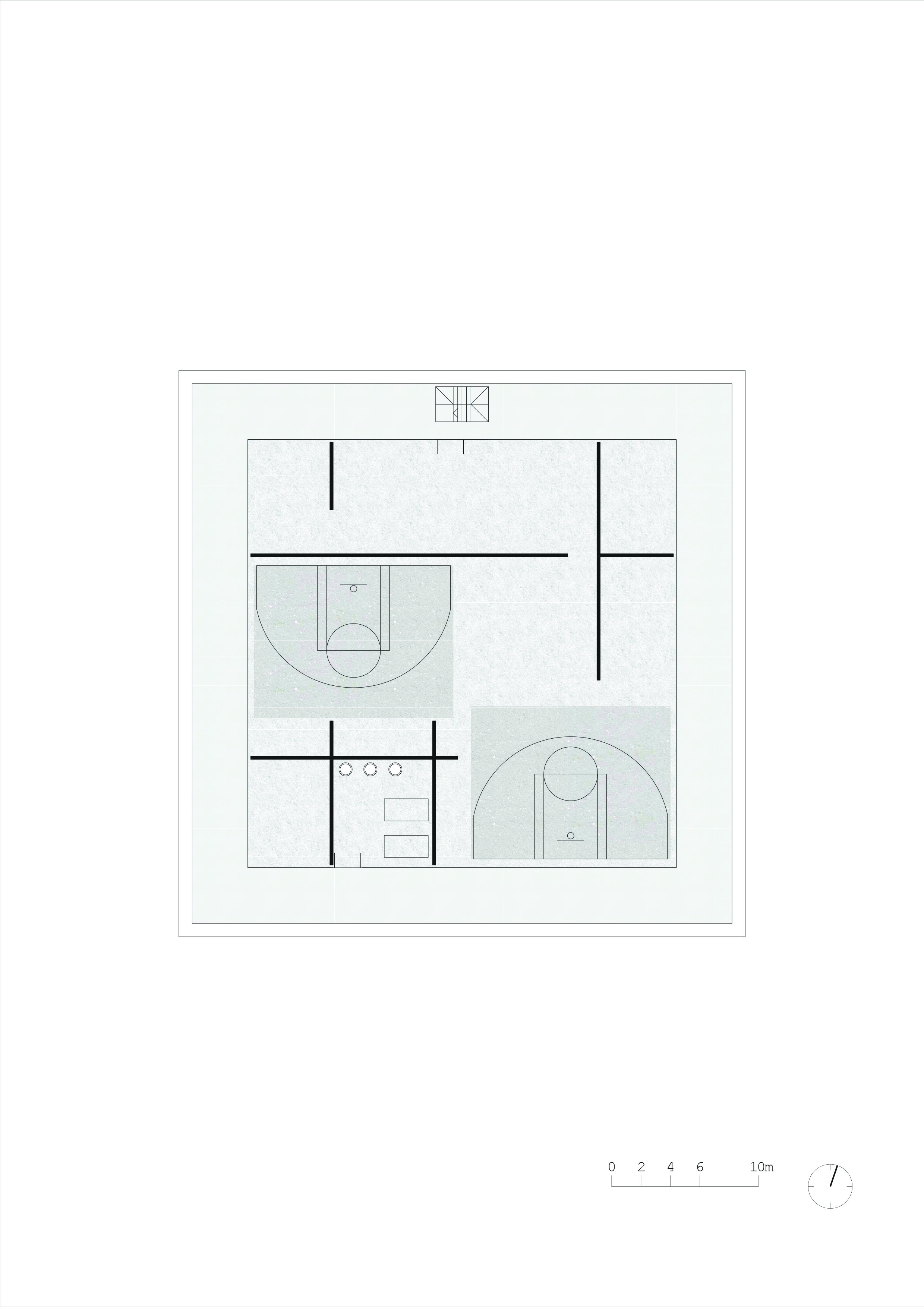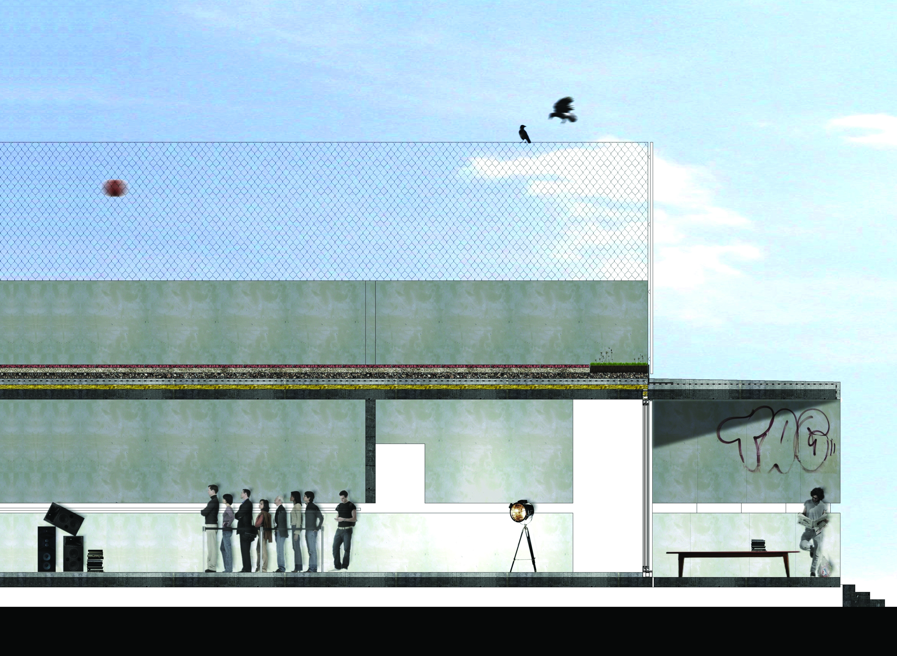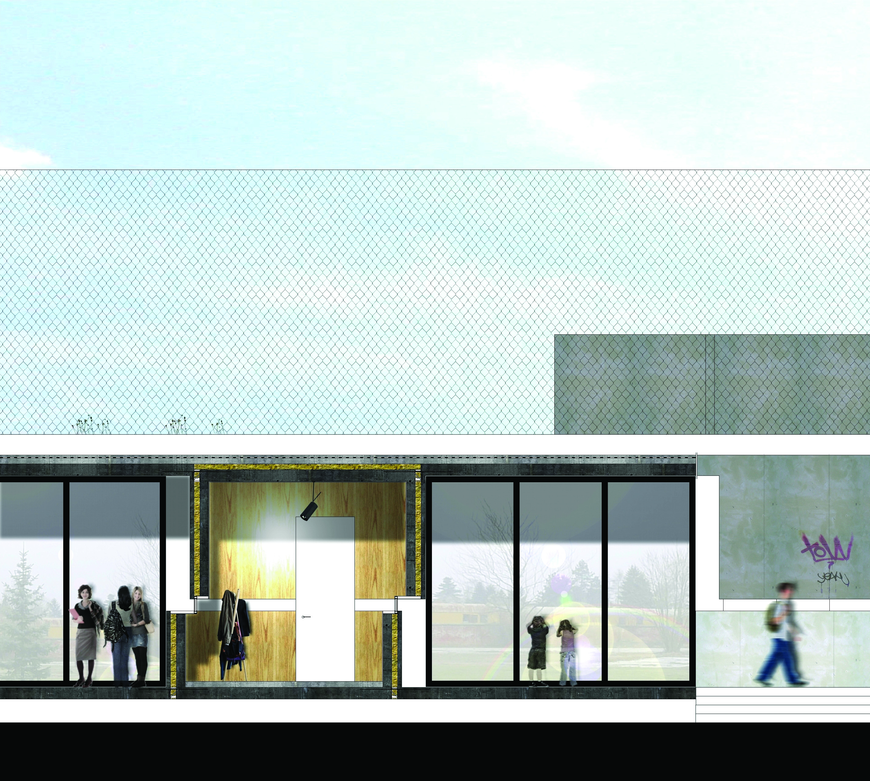 Studentski dom s pratećim sadržajima smješten je u dvorišnom dijelu, a na sjeveru je otvoren prema prometnici. S obzirom na zatečenu dimenziju, svi novi smještajni kapaciteti organizirani su u jedinstvenom objektu. Otvorenost forme omogućuje jasnu organizaciju, ali i racionalnost dvotrakta koji u ravnim i zaobljenim otklonima ostvaruje prateće sadržaje. Urbana depresija ostvaruje kontakt i s parkirališnim prostorom te formira zajednički introvertirani trg buduće studentske aktivnosti.
