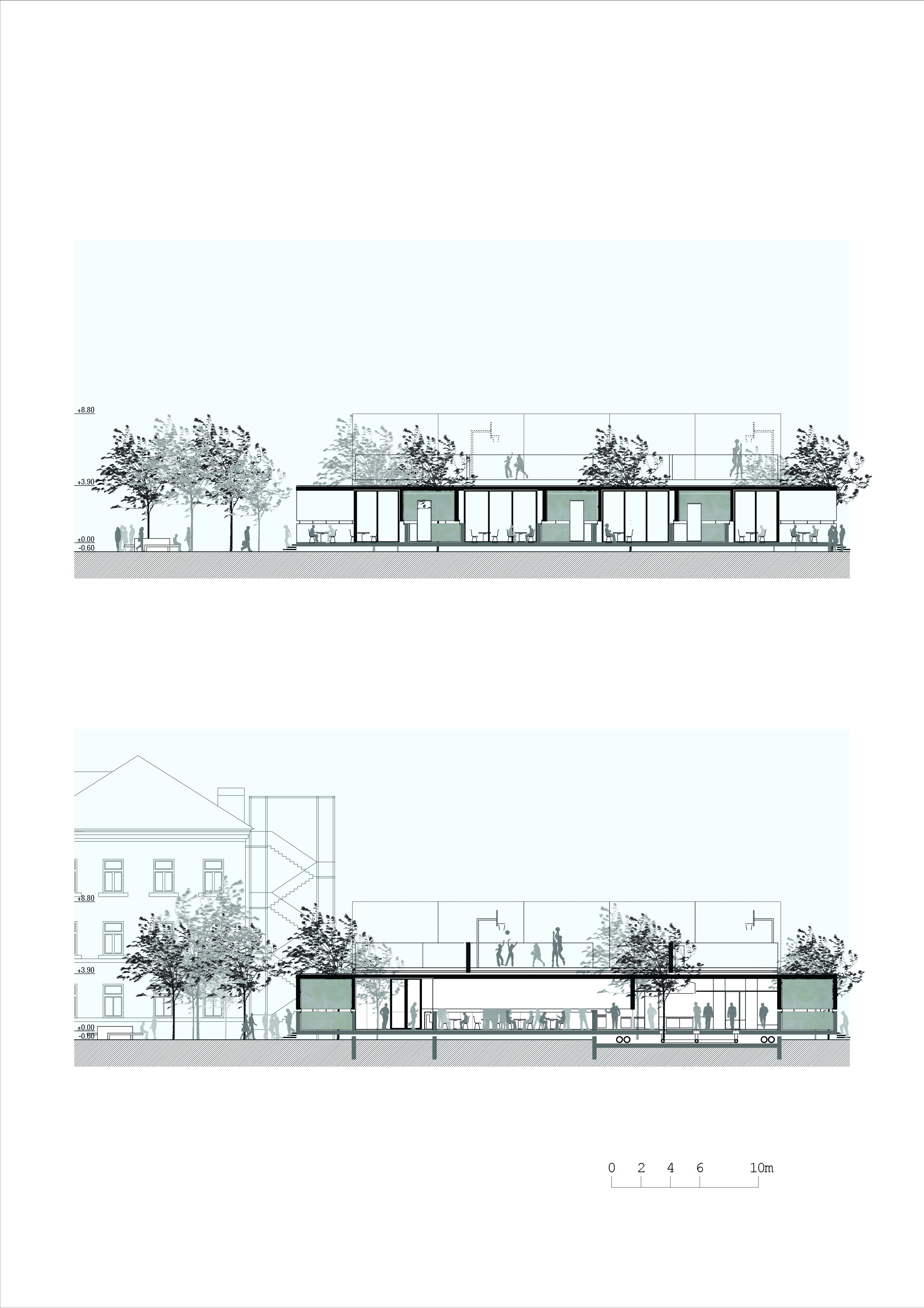 Pročelje je staklena membrana koja odjeljuje unutrašnji od vanjskog prostora, s različitim odnosima, ovisno o okolnom prostoru; prema ulici to je izlog uz šetnicu, dok s druge strane to je privatan dvorišni prostor. Translatirana livada krova, ortogonalna izohipsa postaje teren i gledalište. Streha naglašava karakter dnevnog boravka, verande. Slojevi prijelaza od unutra prema vani ili obratno, višestruki su, ovisno o mikrolokaciji. Lom u presjeku osviještena je promjena rakursa – sjedenjem (što je uobičajeni položaj) prostor se otvara, pomiče se suptilna granica, steinerovski odnos tijela u prostoru. Dinamika je ostvarena izmjenom ekstrovertirane staklene stijene i ‘zatvorenih’ kubusa, koji udomljuju drugačije načine blagovanja – muziku, internet, tišinu ili samo izolaciju, promjenu boje i atmosfere.