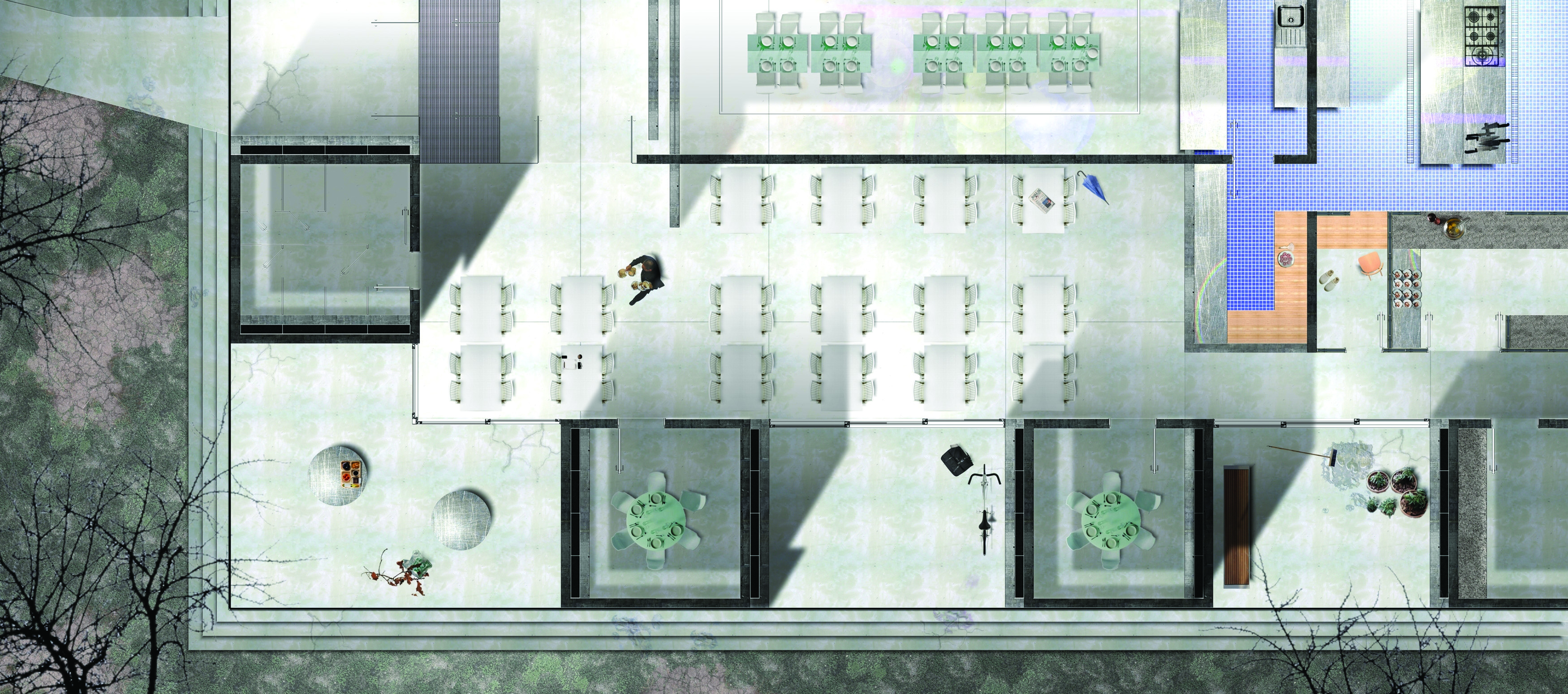 Dobar studentski život sastoji se od manje-više rutiniranog kruga radnji i prostora. Osnovno je svojstvo takvog načina intenzivnost i privremenost. Ideja koherentnosti u privremenom boravištu je anakronizam, kanonizacija. Postojeći objekt strogošću i simetrijom diktira oblikovanje ‘služećih’ prostora. U zadanom okviru parcele ostvaruju se folies različitih namjena. Restoran je otvoren objekt poruka sa širokom lepezom inerpretativnih mogućnosti i iskazuje mnoge aspekte i rezonance multitaskinga, ne prestajući nikad biti ono što jest i što mu je osnovna namjena. Restoran je najvažnija socijalna komponenta u kampusu. Dimenzijama je najveći zajednički prostor, najvažnije mjesto susreta i prerasta puko zadovoljavanje egzistencijalne potrebe.
