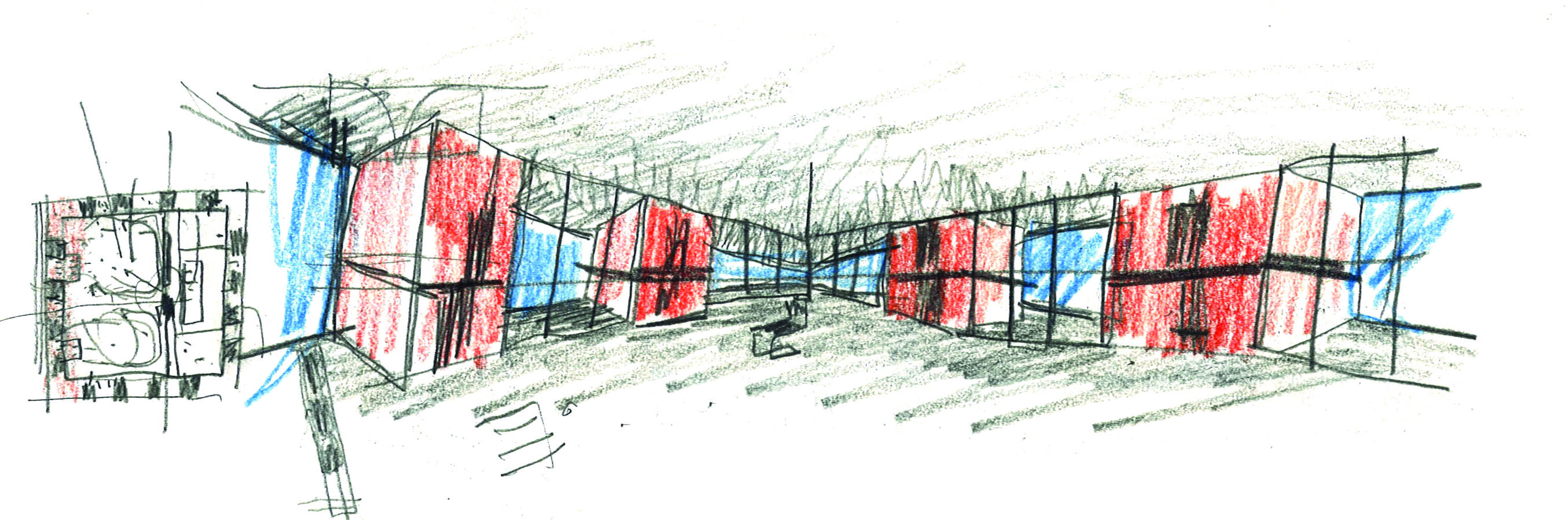 Svojom dimenzijom, bez obzira na to što je formiran kao paviljon, novi restoran na neki se način pretvara u urbani element što rubno razrješava odnos prema zatečenom ambijentu. Najvažniji je dio strukture građevine restorana njegov obodni pojas. Izmjenom punih elemenata i uvučenih trijemova jasnih dimenzija formira se odnos prema okolini. Na ovakav način ostvaruje se aktivan prostor koji pripada i građevini i javnom prostoru. To je zona boravka, susreta, objedovanja i zabave. Unutar zatvorenih jedinica ostvaruju se prostori koncentracije, mogućeg mirnog objeda uz knjigu i odmor od svakodnevne vreve studentskog života; takav je mir tijekom studentskih dana ponekad prijeko potreban.