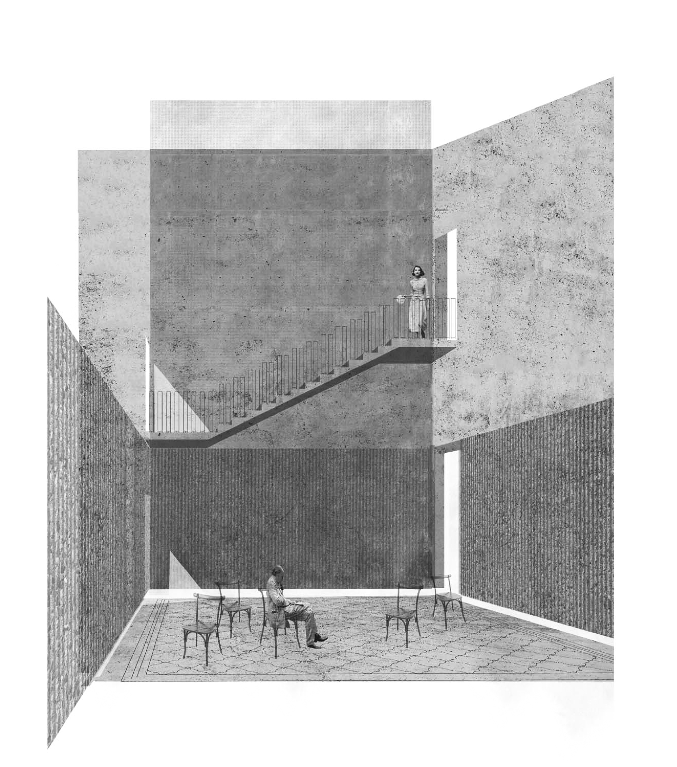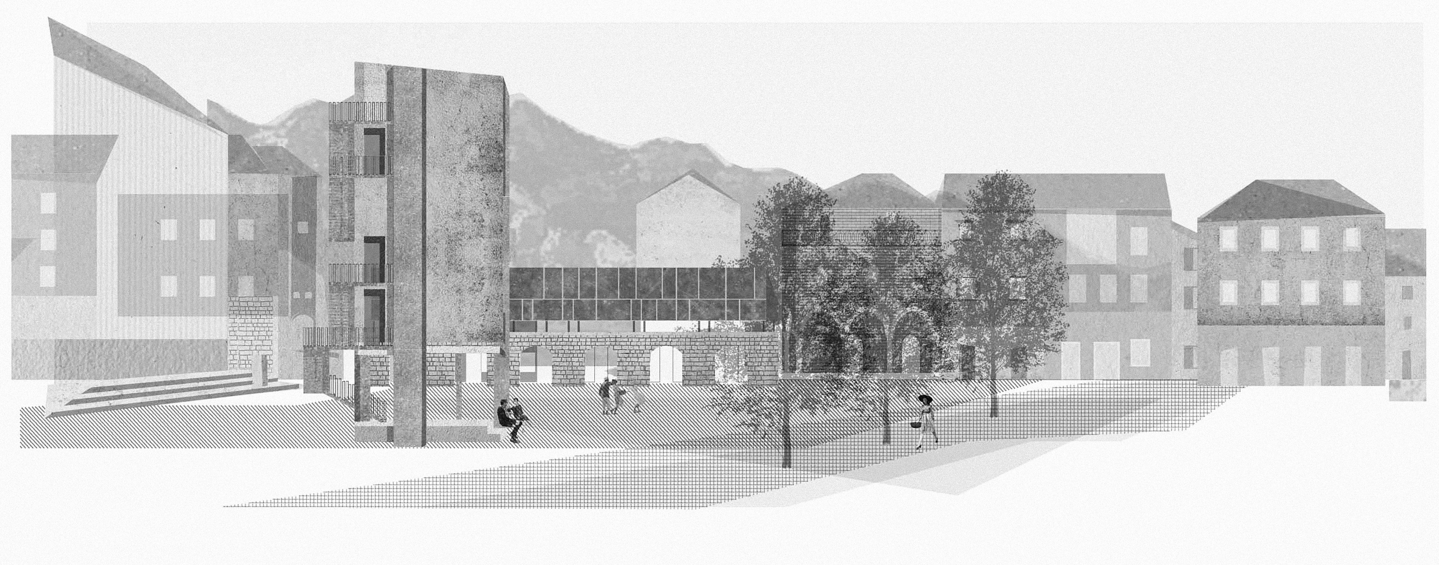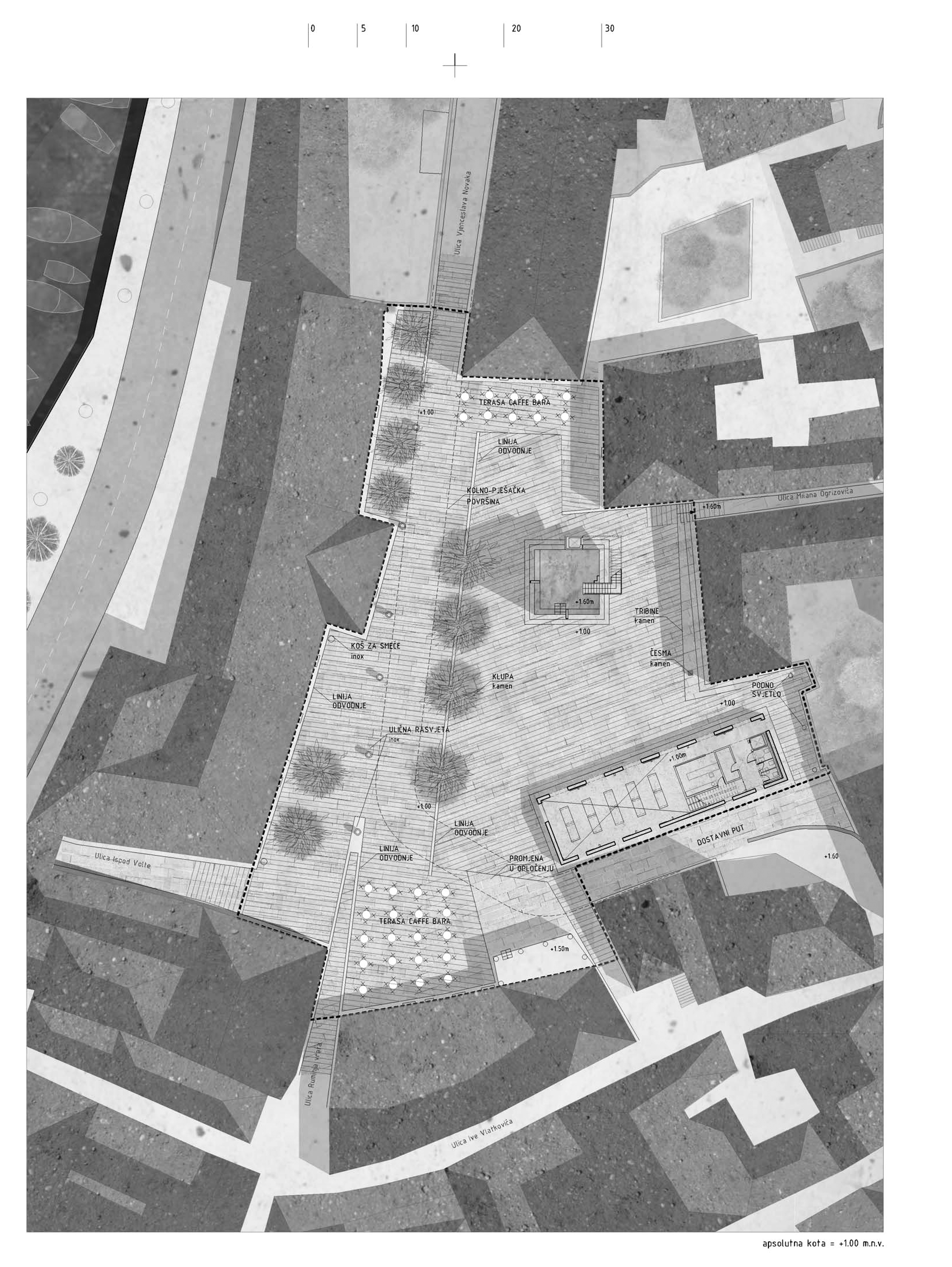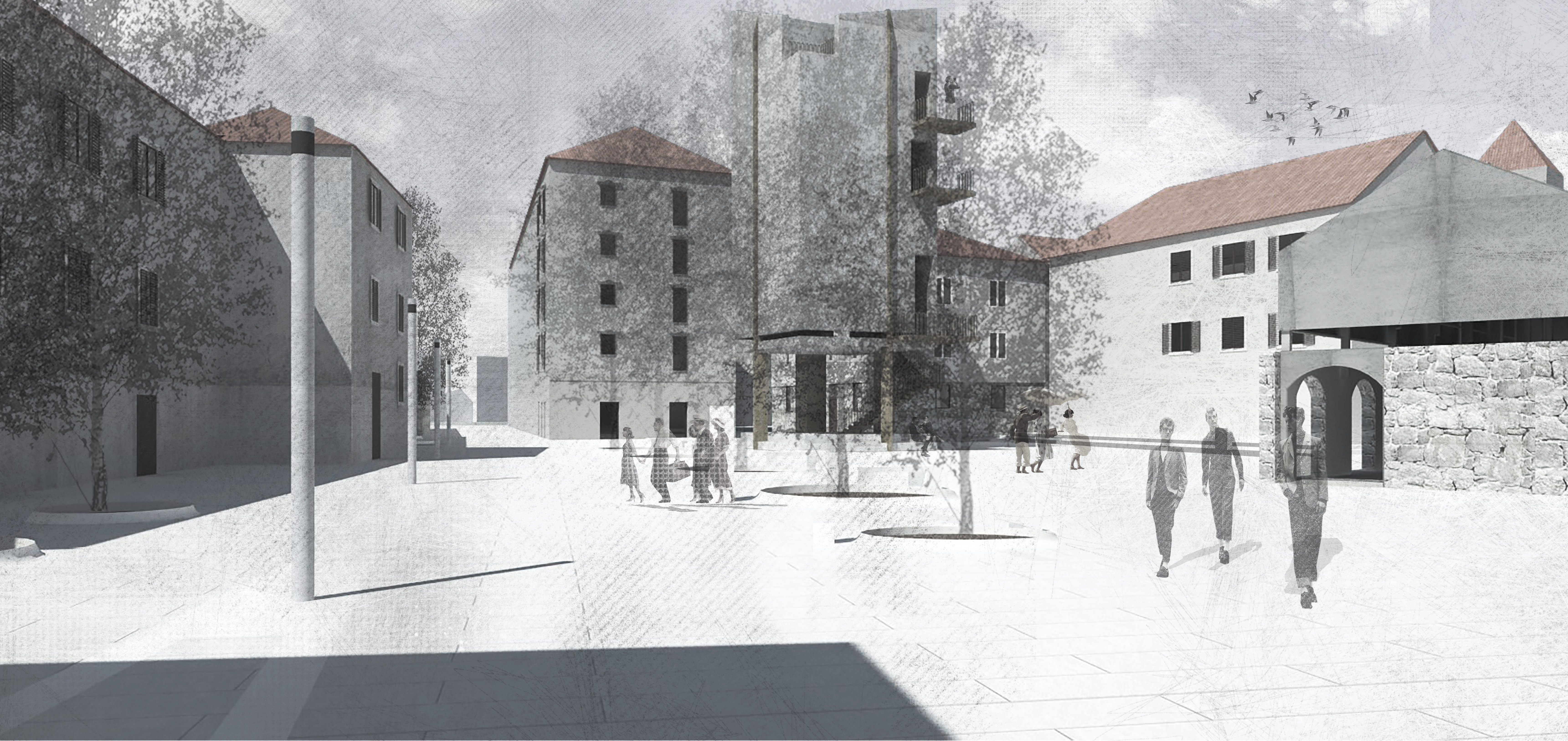 Kuća postaje dio trga i trg postaje ona. Međuodnosima koje uspostavljaju generira se bivanje u oboma. Veličina trga iziskuje interijerski pristup u projektiranju njegovih elemenata. Preklapanje zona kretanja i mirovanja titra u harmoničnoj cjelini, interferirajući međusobno. Poput kuće, trg posjeduje ritual korištenja svojih ambijenata, njihovu otvorenost ili intimnost. Poput grada – on je ambivalentan, nepravilan, pravilan, koncentriran I raspršen. Traži društvo i poštuje osamu.