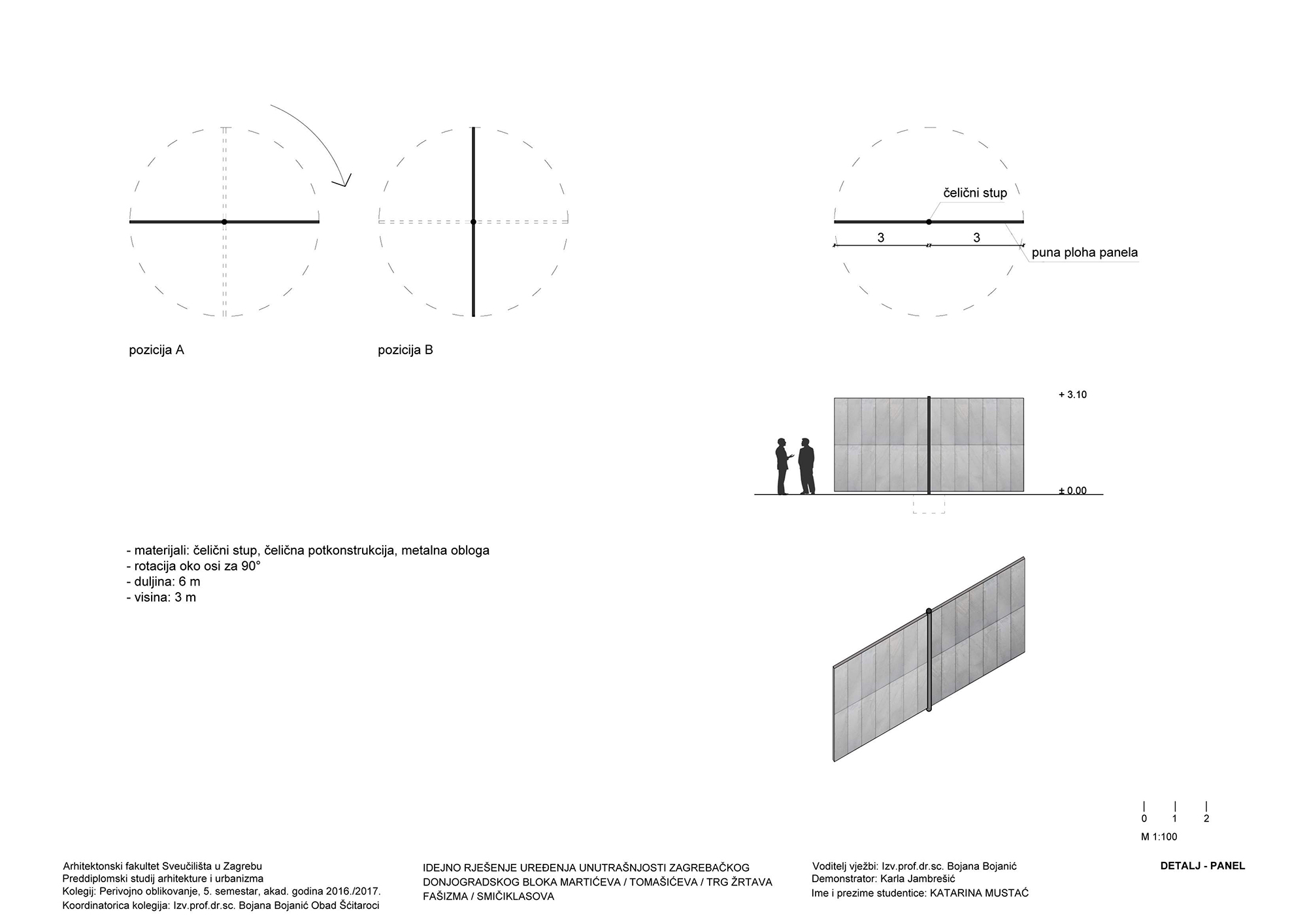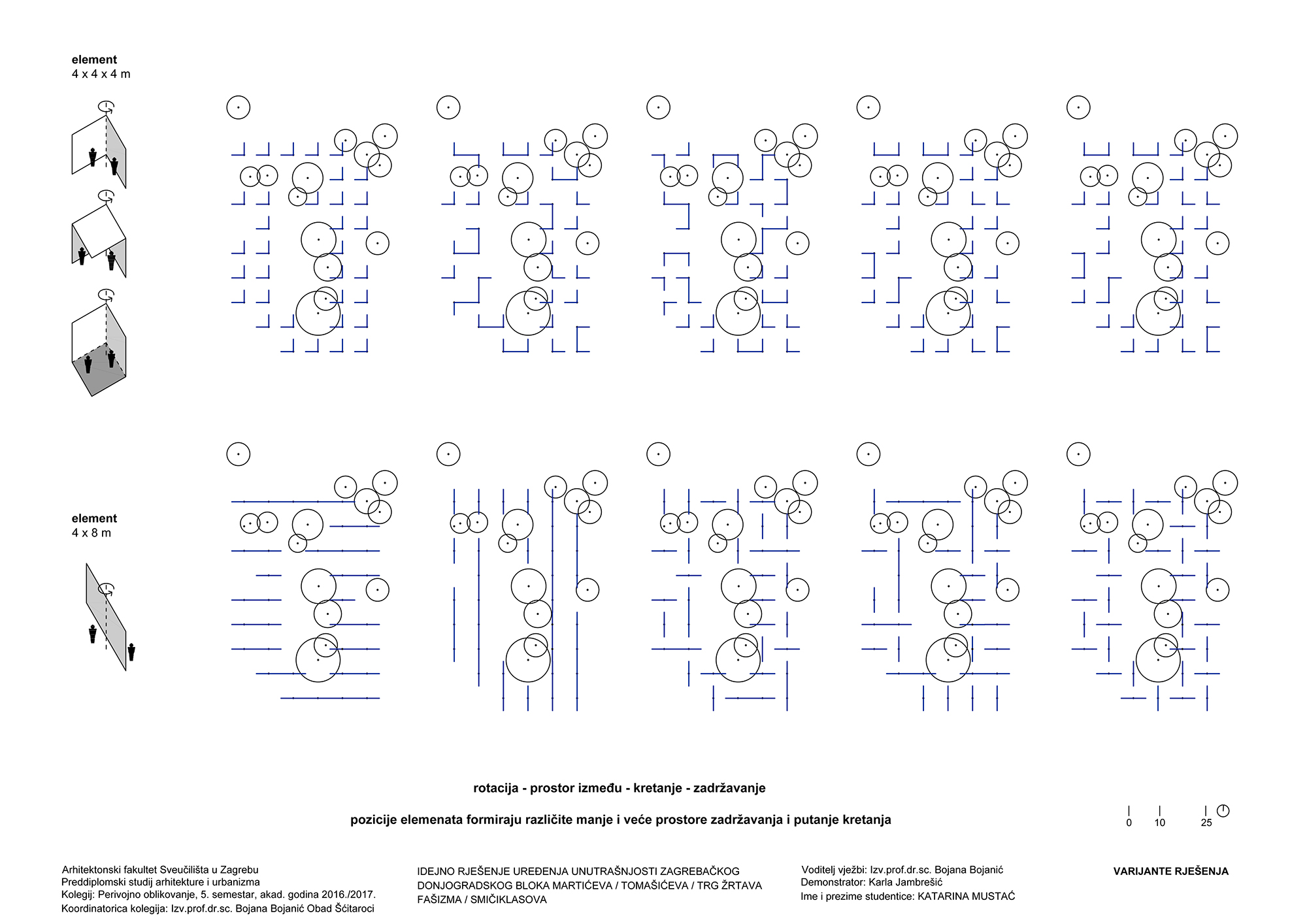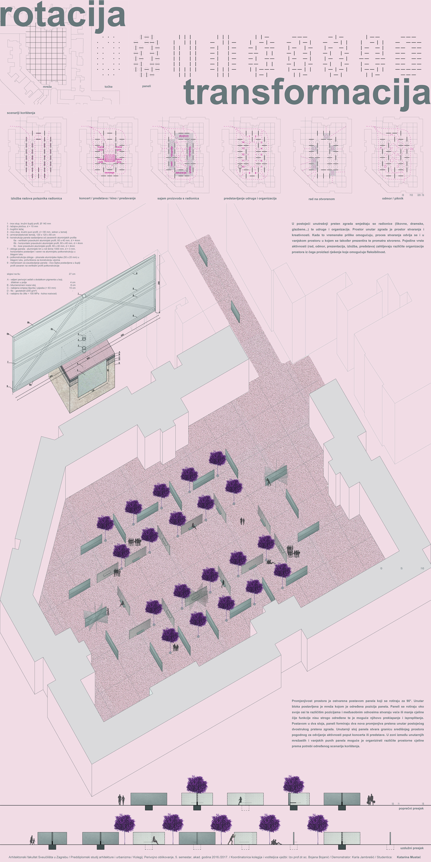 Promjenjivost prostora je ostvarena postavom panela koji se rotiraju za 90°. Unutar bloka postavljena je mreža (8 x 8 m) kojom je određena pozicija panela. Paneli dimenzija 2 x 6 m, rotiraju se oko svoje osi i različitim pozicijama i međusobnim odnosima stvaraju veće ili manje prostorne cjeline. Postavom u dva sloja, paneli formiraju dva nova promjenjiva prstena unutar postojećeg dvostrukog prstena zgrada. Vanjski paneli su pune plohe, dok su unutrašnji mrežasti. Unutrašnji sloj panela stvara granicu središnjeg prostora koji omogućuje odvijanje aktivnosti za veći broj ljudi, poput koncerta ili predstave. U prostoru između unutarnjih i vanjskih panela moguće je organizirati manje i veće cjeline prema potrebi određenog scenarija korištenja. Na uzdužnim stranicama, između panela, u četiri pravca, postavljeno je drveće koje predstavlja konstantu u kontrastu s promjenjivim pozicijama panela.