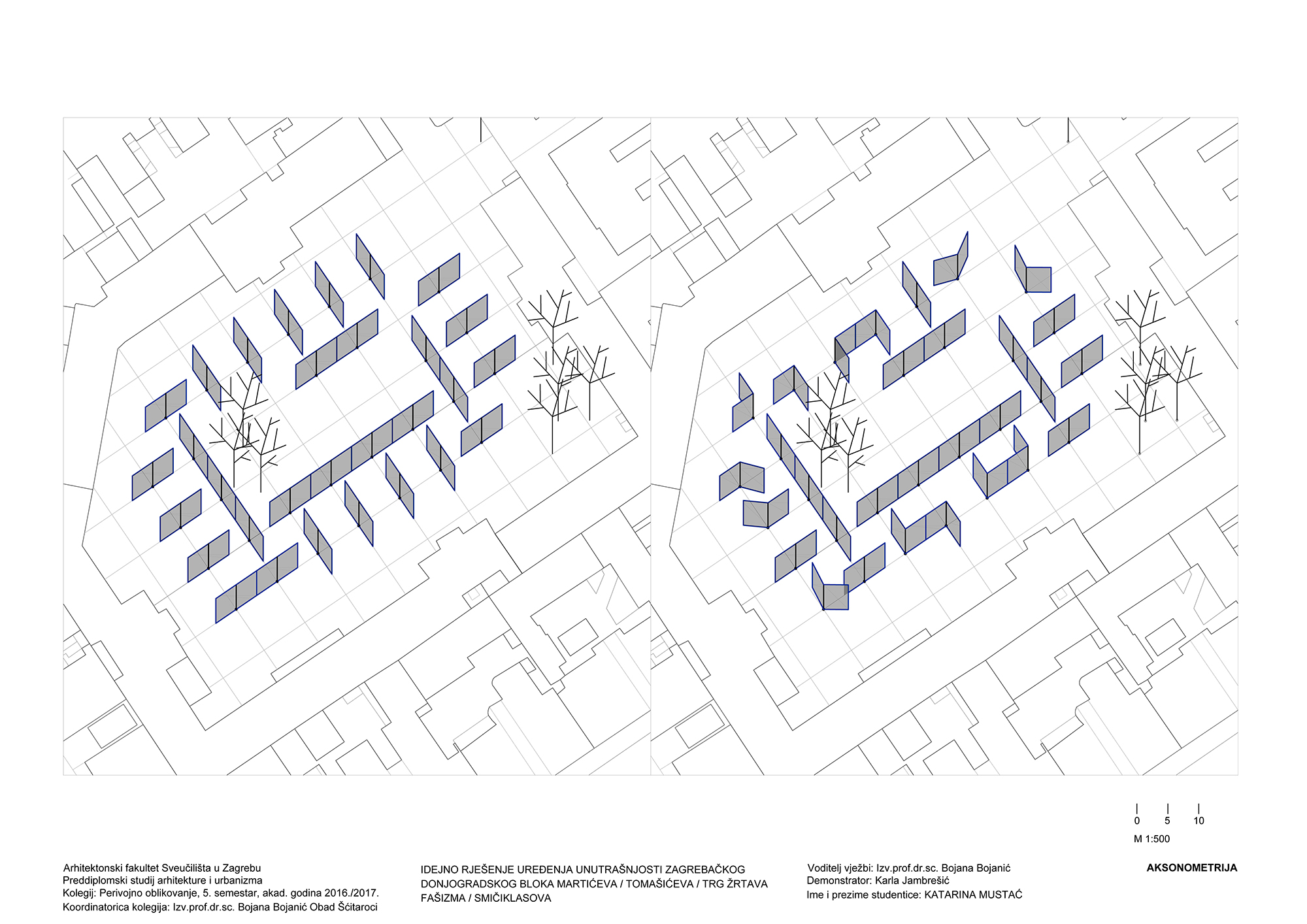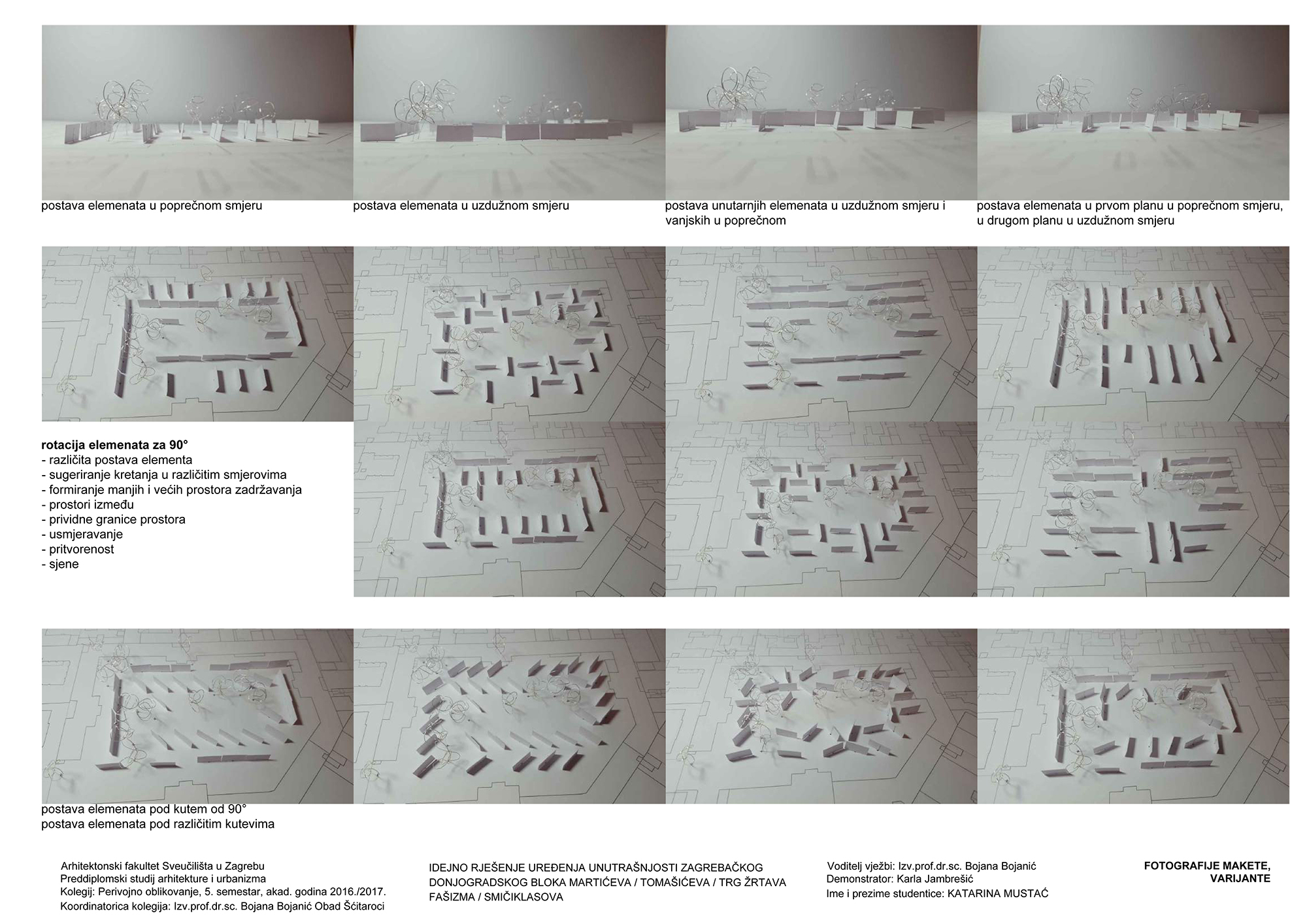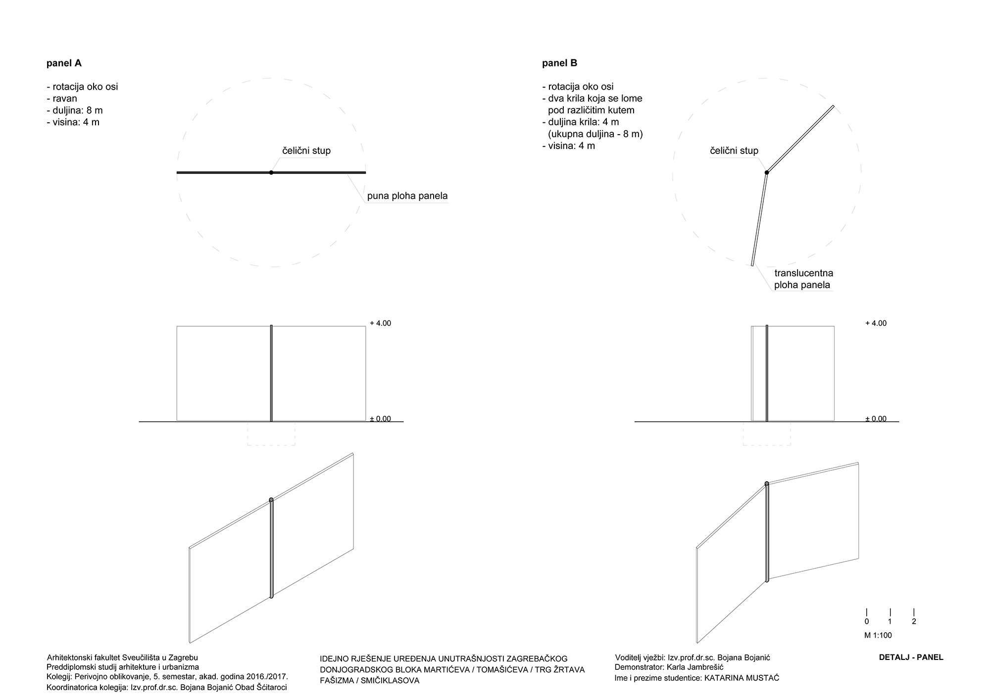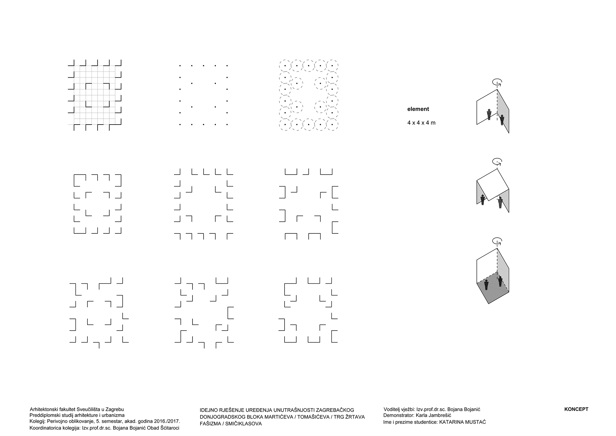 Promjenjivost prostora je ostvarena postavom panela koji se rotiraju za 90°. Unutar bloka postavljena je mreža (8 x 8 m) kojom je određena pozicija panela. Paneli dimenzija 2 x 6 m, rotiraju se oko svoje osi i različitim pozicijama i međusobnim odnosima stvaraju veće ili manje prostorne cjeline. Postavom u dva sloja, paneli formiraju dva nova promjenjiva prstena unutar postojećeg dvostrukog prstena zgrada. Vanjski paneli su pune plohe, dok su unutrašnji mrežasti. Unutrašnji sloj panela stvara granicu središnjeg prostora koji omogućuje odvijanje aktivnosti za veći broj ljudi, poput koncerta ili predstave. U prostoru između unutarnjih i vanjskih panela moguće je organizirati manje i veće cjeline prema potrebi određenog scenarija korištenja. Na uzdužnim stranicama, između panela, u četiri pravca, postavljeno je drveće koje predstavlja konstantu u kontrastu s promjenjivim pozicijama panela.
