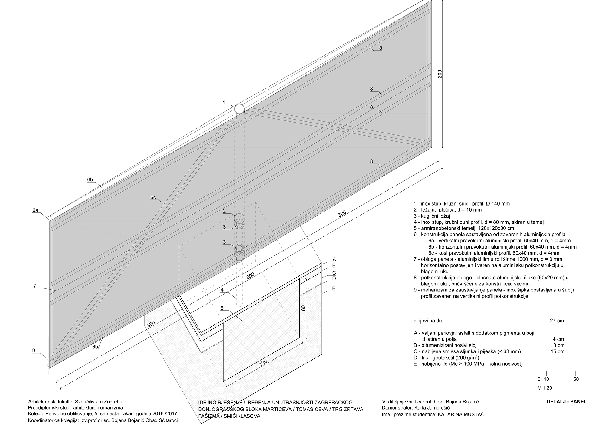 Konstrukcija panela sastoji se od inox i aluminijskih profila, a potkonstrukcija od aluminijskih šipki. Kod vanjskog prstena panela obloga je aluminijski lim u boji, dok su unutrašnji obloženi aluminijskom mrežom. Na unutrašnje panele postavljene su klupe od aluminijskog lima. Na tlu je postavljen perivojni asfalt u prljavo rozoj boji, dilatiran u polja dimenzija 8 x 8 m. Rasvjeta je postavljena kao linijska na gornjim rubovima panela (dva rasvjetna tijela u ukupnoj duljini od 2 m, 2 x 1 m) i na tlu kao točkasta između panela te prema ulazu u Patačićkinoj ulici. Drvoredi su formirani od drveća kuglastog bagrema (Robinia pseudoacacia 'Umbraculifera') uz koje su postavljeni koševi za smeće.