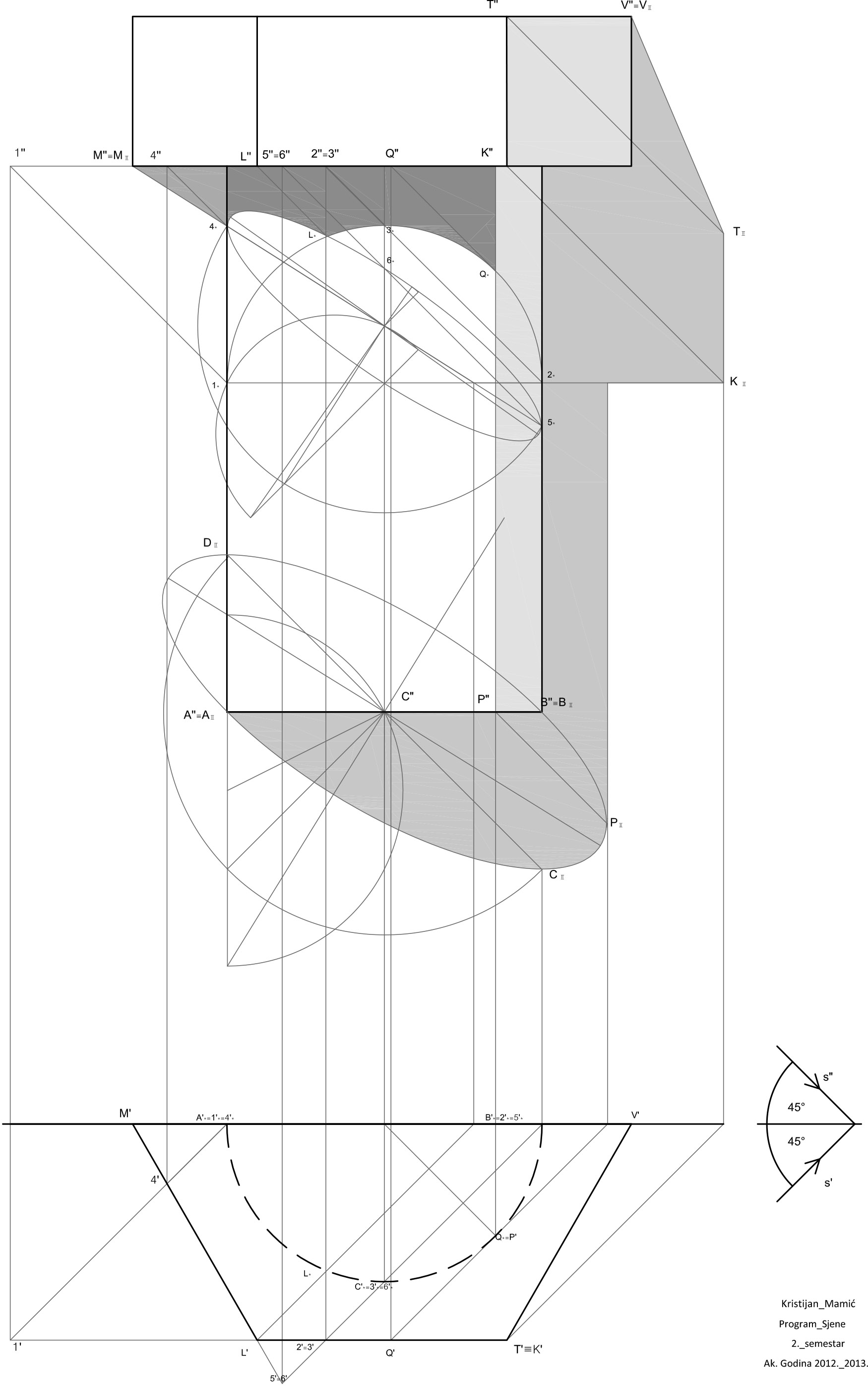 Prikazan je primjer programa iz kolegija Nacrtna geometrija i perspektiva, radnog zadatka na temu sjena. Objekt je predočen metodom ortogonalnog projiciranja, a predstavlja konzolu valjkastog oblika natkrivenu šesterokutnom pločom. Zadatak je konstruirati sve sjene objekta (vlastite sjene valjka i ploče, sjene objekta na zidu te sjene ploče na valjak) pri paralelnoj dijagonalnoj rasvjeti. Prikazane su sve potrebne konstrukcijete istom bojom različitog intenziteta označene spomenute vrste sjena.