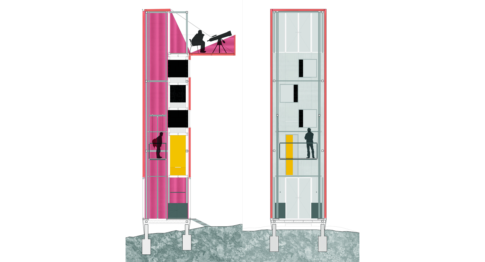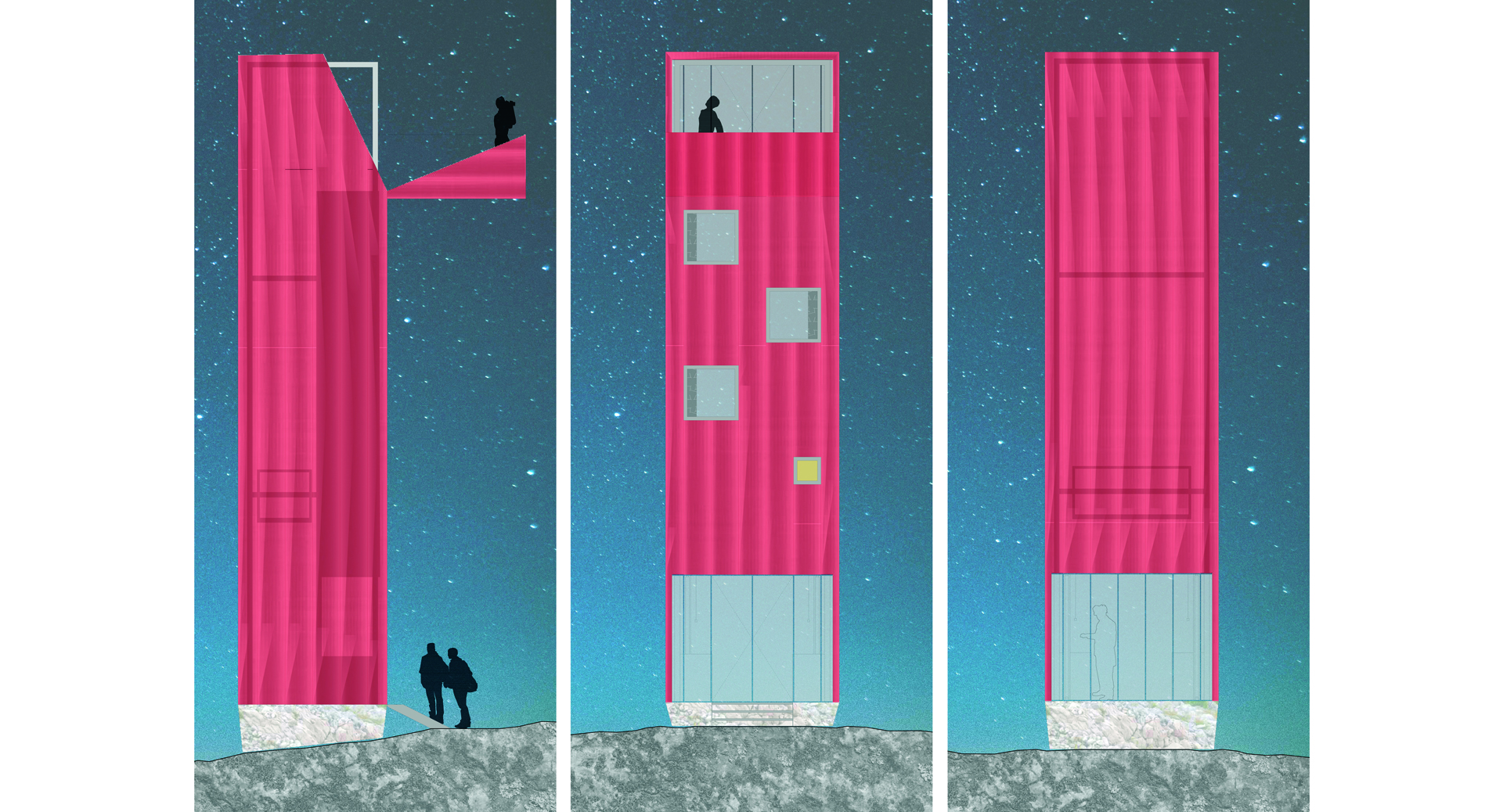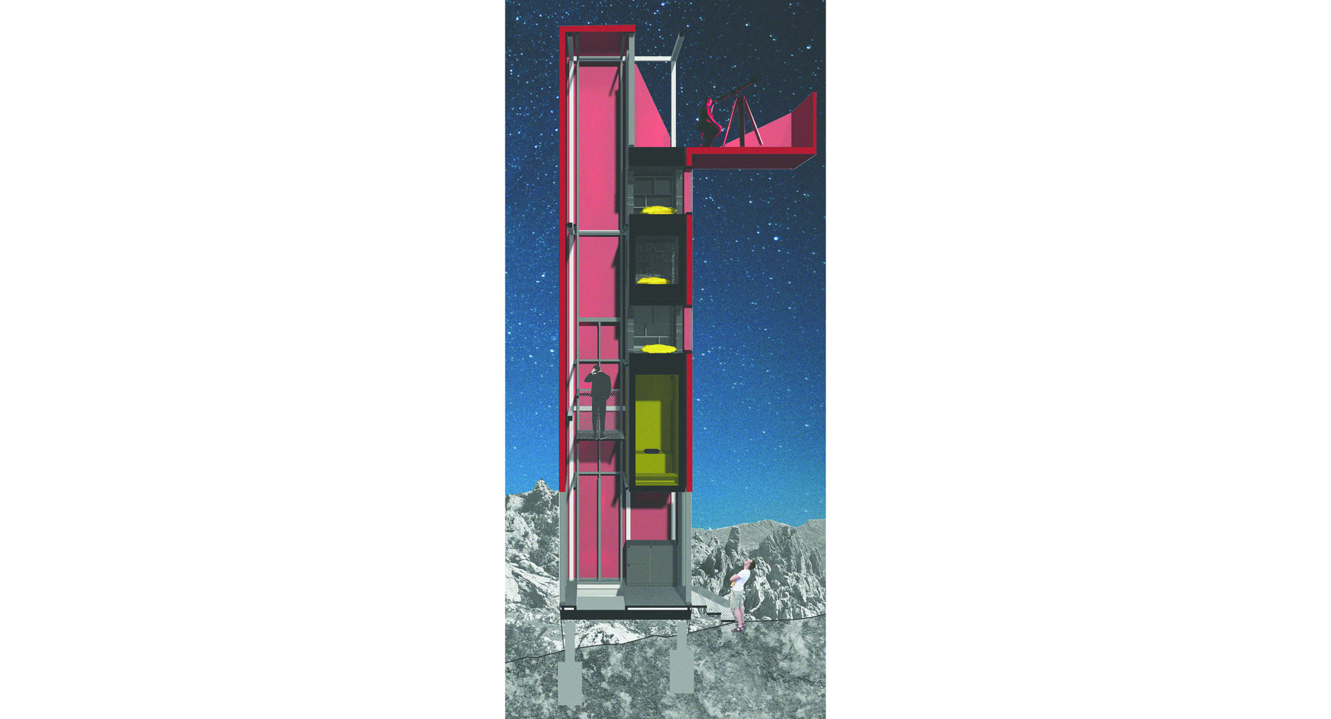 Koncept oblikovanja skloništa u prirodi proizašao je iz definiranja programa kojim se bave njegovi korisnici. Objekt je namijenjen astronomima amaterima koji sklonište koriste tijekom promatranja zvijezda. Specifičnost je programa ta što je standardni tijek korištenja prostora noć-dan tj. spavanje-aktivnost u ovom slučaju obrnut. Noću se promatraju zvijezde, a danju se spava. Organizacija interijera podređena je astronomima. U okvir vertikalno postavljenog kontejnera umeće se pomična platforma kojom korisnici putuju od prostora dnevnog boravka u prizemlju prema prostoru noćnog boravka odnosno terasi na vrhu objekta. Osim platforme, element interijera je i servisni ormar u kojem se nalaze svi potrebni popratni sadržaji u koje se pristupa sa platforme.
