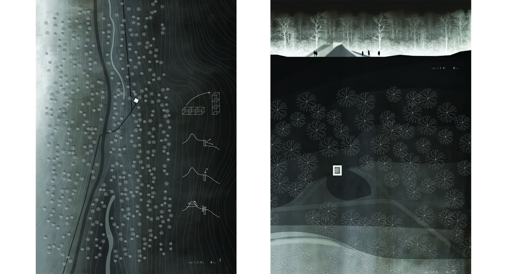 Tema je zadatka sklonište u prirodi. Zadana je prostorna jedinica vanjskih dimenzija kontejnera 40' HC s konstrukcijom koju čine čelični profili presjeka 10/10 cm. Odabrana lokacija nalazi se u gustom zelenilu obronaka Medvednice uz mjesto susreta potoka, ceste i planinarskog puta koji vode do vrha planine. Planinarenje, šetnje u prirodi i druge slične aktivnosti oduvijek su imale značajnu ulogu u održavanju fizičkog i psihičkog zdravlja pojedinca. Taj čimbenik je polazna točka ovog projekta. Čovjekov put u ovom scenariju započinje uspinjanjem do planiranog objekta. Staza na jednom mjestu skreće i dovodi posjetioca do kaverne, spuštanjem u koju osoba simultano ponire u vlastite misli. Na dnu, posjetioca dočekuje svjetlost, trenutak spoznaje. Ponovno uspinjanje ne završava izlaskom i napuštanjem objekta, već se nastavlja usponom do vrha Sljemena.