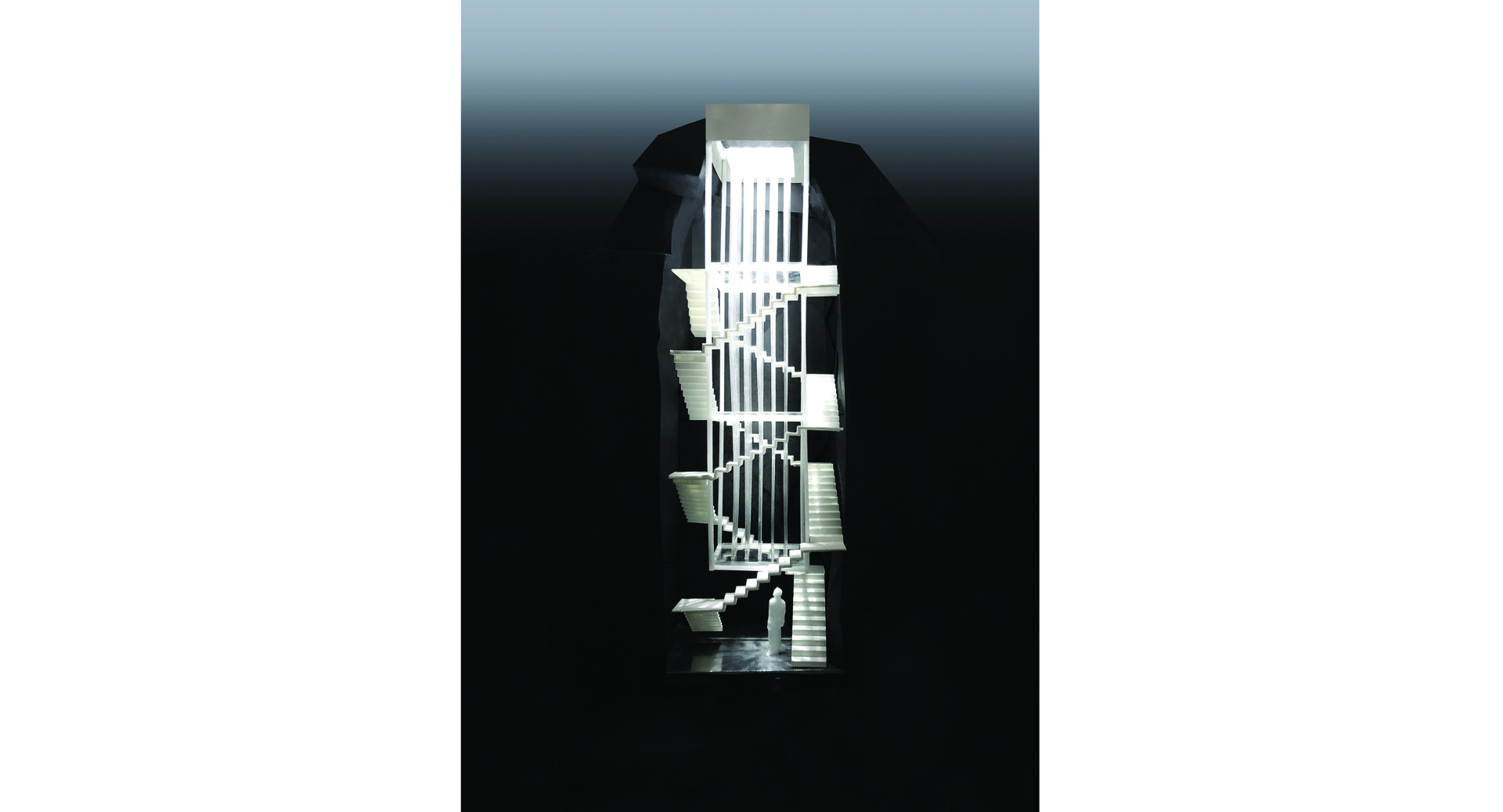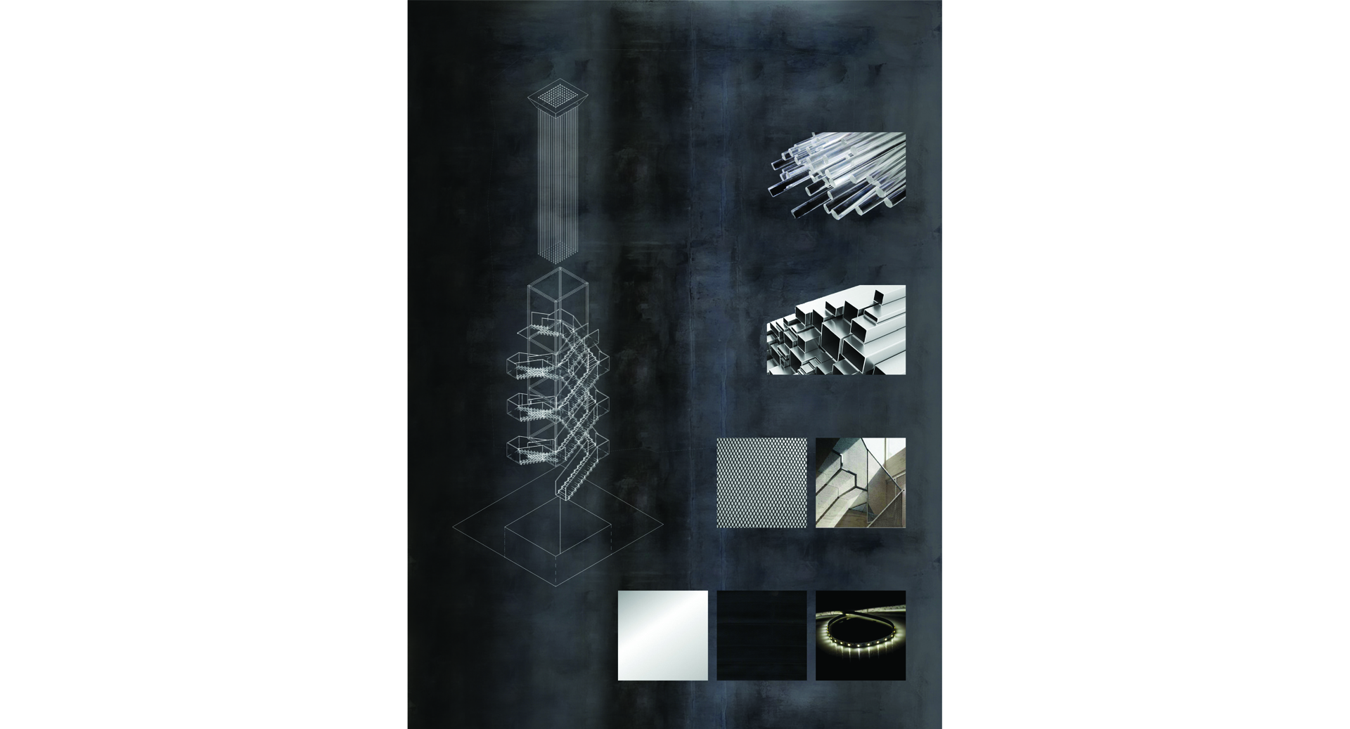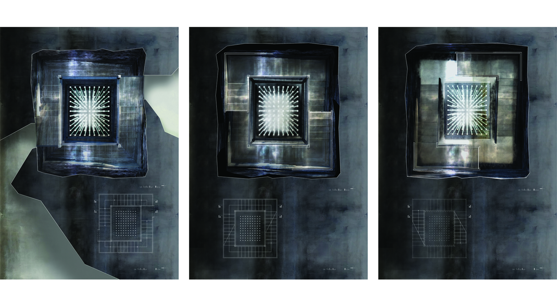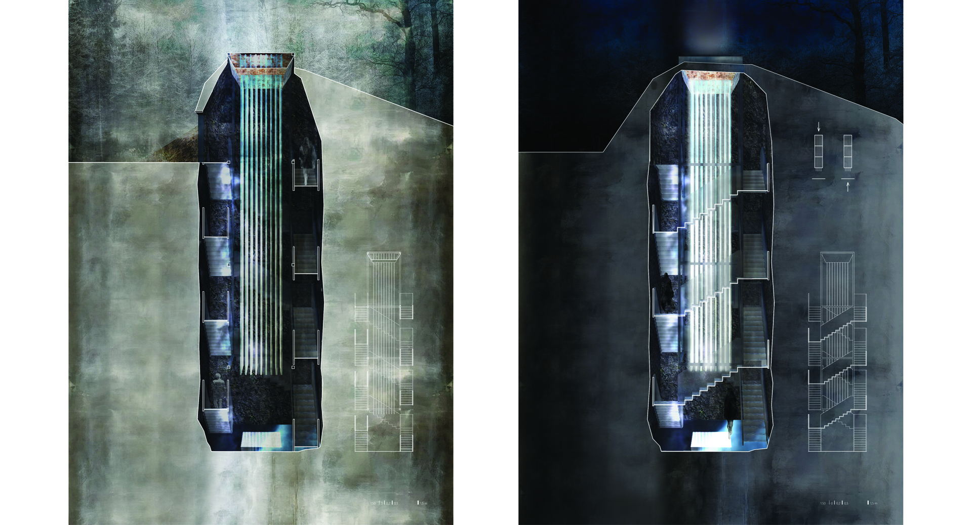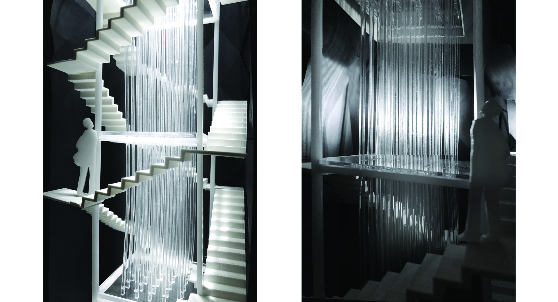 Šupljina nastala ukopavanjem u tlo definira volumen kontemplativnog prostora. Površina stijene postaje međom tako nastale praznine u koju se umeće zadani čelični okvir. Konstruktivni okvir nosi akrilne cijevi u funkciji rasvjete i lagano stubište s podestima. Prisutni su prirodni i artificijelni materijali. Akrilne cijevi provode sunčevu svjetlost u dubine iskopa danju, odnosno služe kao izvor svjetlosti noću kada se pale u njih ugrađene LED lampe. Vidljive su s bilo koje točke stubišta i reflektiraju se u zrcalu postavljenom na dnu objekta stvarajući iluzija beskraja i dubine.