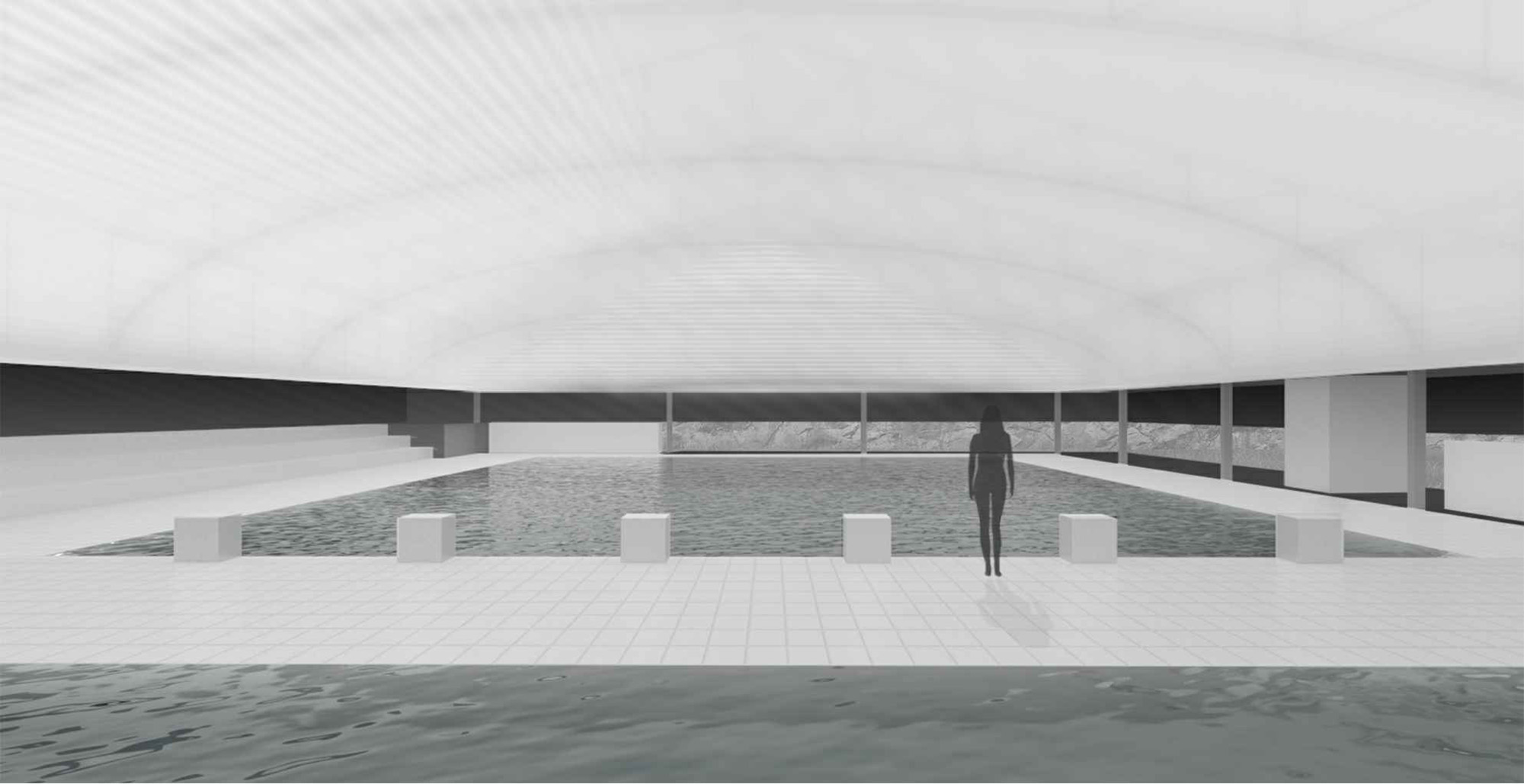 Naglasak projekta je na prostoru bazenske dvorane koja, poput tvrđave, ima zid (dvostruku opnu, ophod) u kojoj su servisni sadržaji te je puna koncentracija na prostoru s vodenom plohom. Ona ima svoj izlaz u vrt/sunčalište visinskom barijerom odvojenim od perivoja za posjetitelje čitavog komplesa i stanovnike naselja.