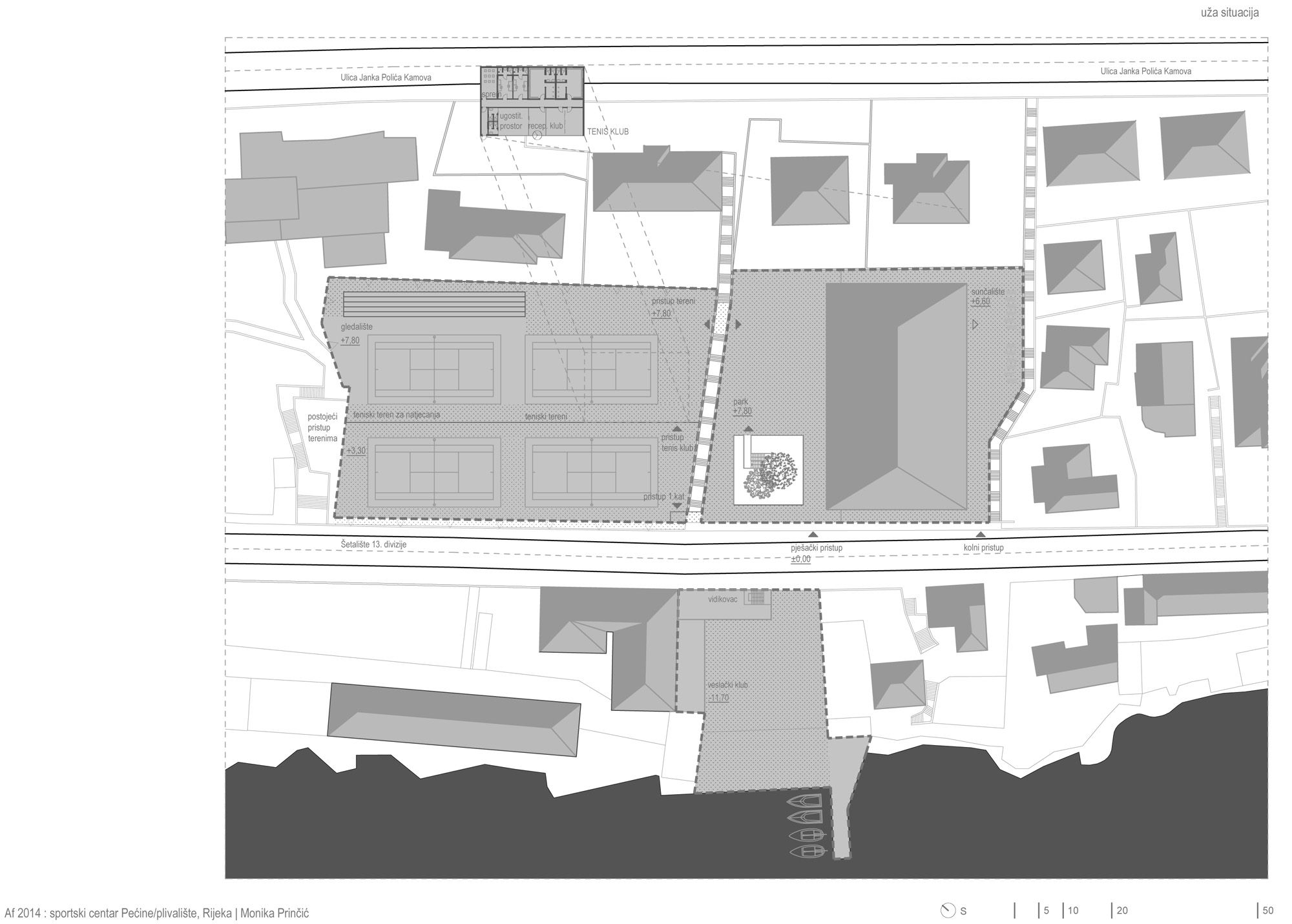 Novoplanirano riječko plivalište se nalazi u gradskoj, pretežito stambenoj četvrti Pećine, na istoku grada. Karakteriziraju ga stambene vile na kaskadnom terenu, kuće sa okućnicama kao platoima do kojih se pristupa izravno sa prometnice i stubama koje povezuju strmi teren. U nedostatku slobodnog javnog prostora, parcela plivališta, u potpunosti ispunjena programskim sadržajima, se podiže na kat oslobađajući tako prizemlje i krov te stvarajući novu kotu terena. Bazen je samostalni introvertirani volumen, odnosno kuća koja ima svoju okućnicu. Vertikalnim komunikacijama i horizontalnim platonima iste visine ostvarena je povezanost sve tri parcele - vanjskih terena sa suhim sportovima (A), javnog otvorenog prostora pokraj bazenske dvorane, ulaznog trga (B) te mokrih sportova na otvorenom uz more (C).