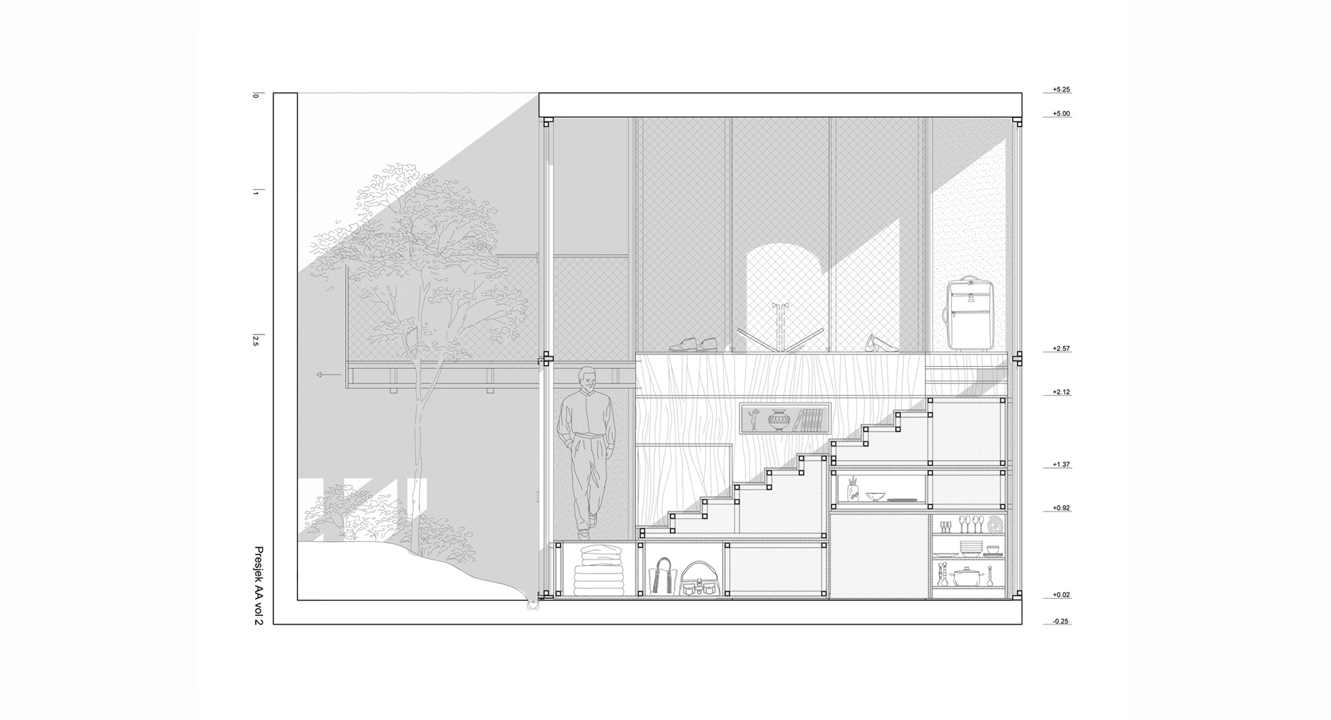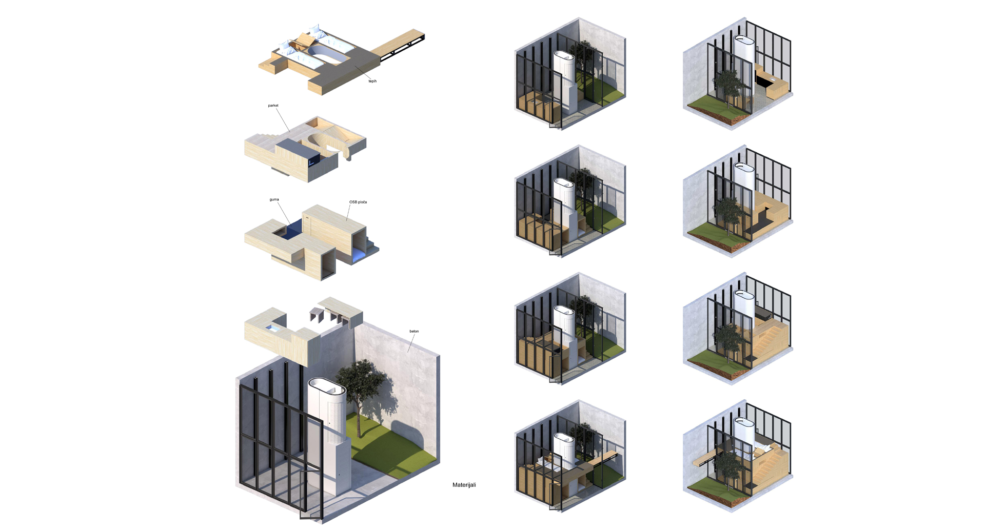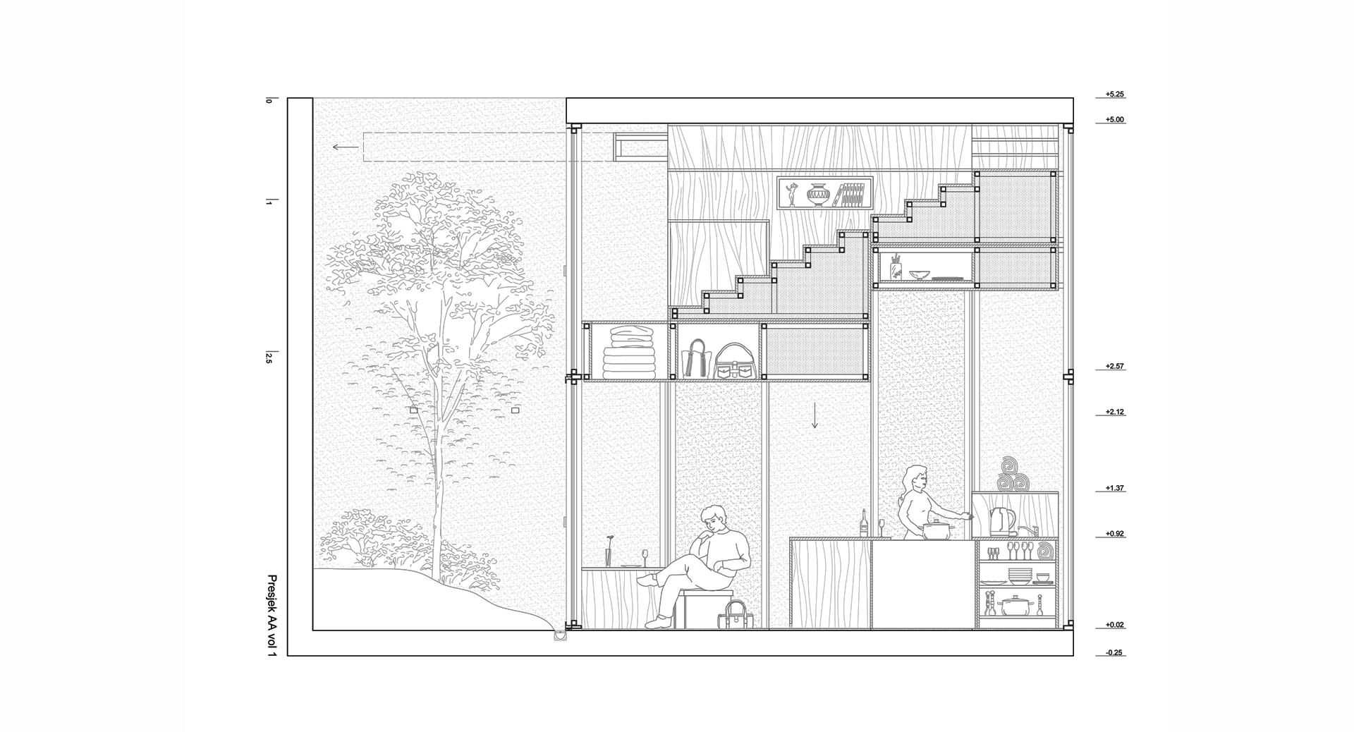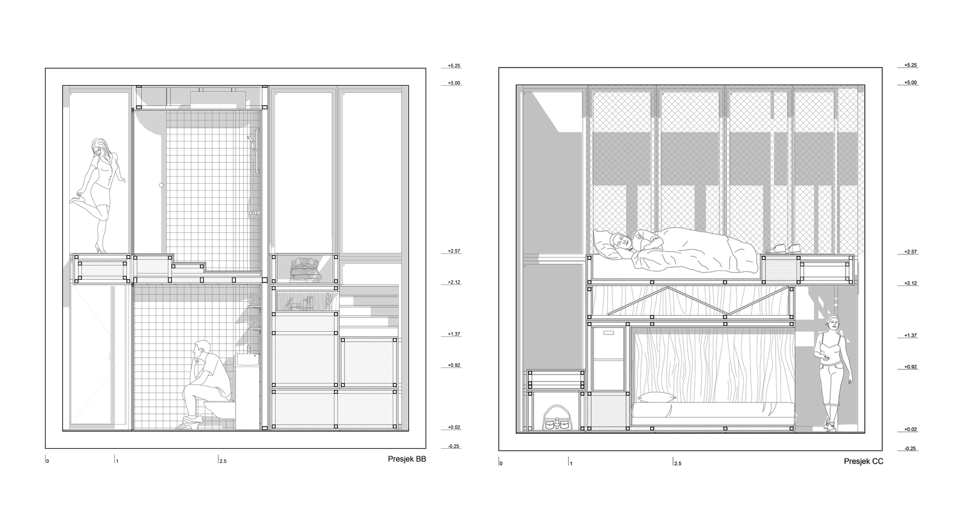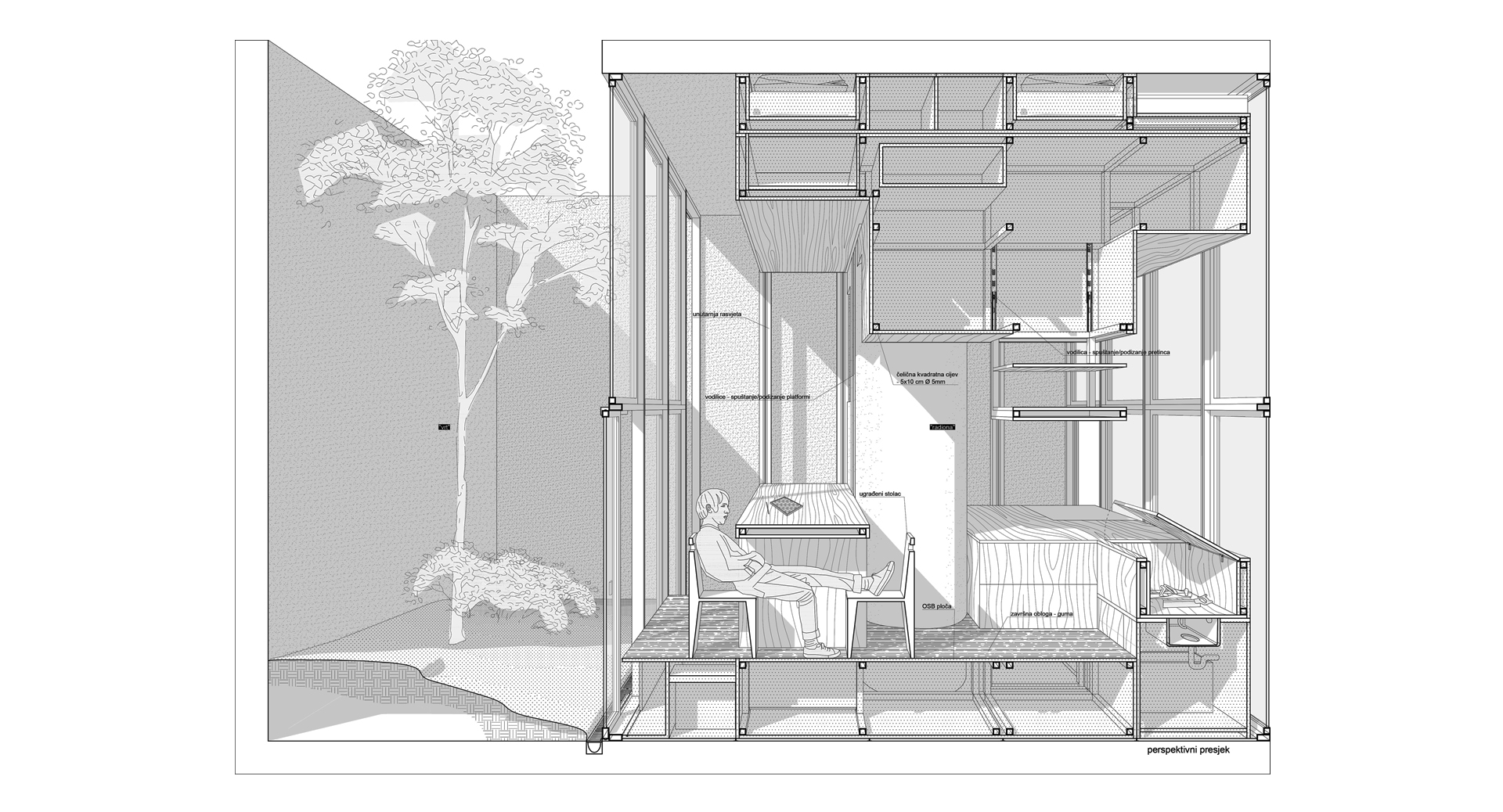 U zadanu prostornu jedinicu forme AB kvadra definiranih otvora i unutarnjih dimenzija 5 x 5 x 7,5 m smješten je stan budućnosti. Rješenjem je predloženo umetanje četiriju platformi - svaka sa svojom namjenom, a njihovo korištenje ovisi o dnevnom ritmu stanara. Prostor kontrolira korisnik i njegovom odlukom platforme se spuštaju/dižu prateći time raspored njegovih aktivnosti. Prostorna ograničenja iskorištena su za istraživanje krajnjih mogućnosti racionalizacije prostora i komprimiranja funkcija. U prostoru se nalaze fiksni elementi: oprema kuhinje, sanitarija i prostor vrta te pomični elementi: oprema radionice, dnevnog boravka i spavanja. Platforme svoj položaj mijenjaju krećući se po okomitoj osi sastavljenoj od stupova i vodilica unutar kojih je smješten motor koji se aktivira glasom. Završne obloge podnih ploha variraju, konstrukcija umetnuta u zadanu AB opnu je čelična.