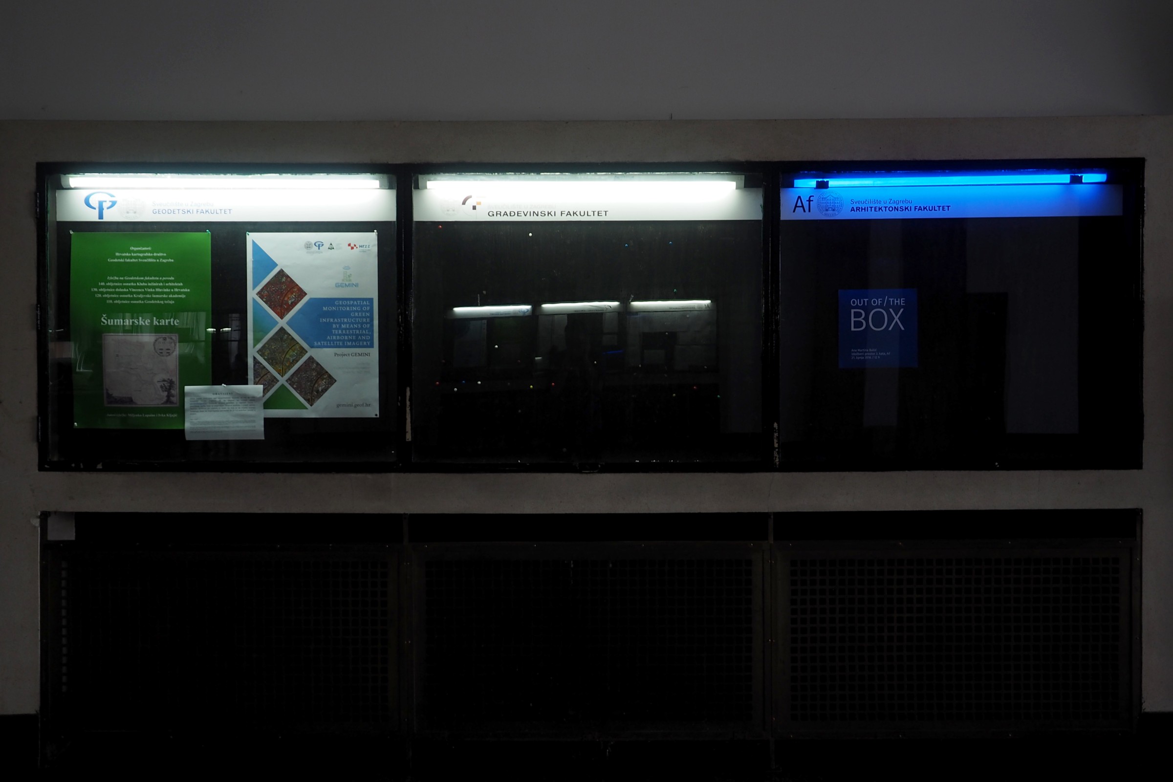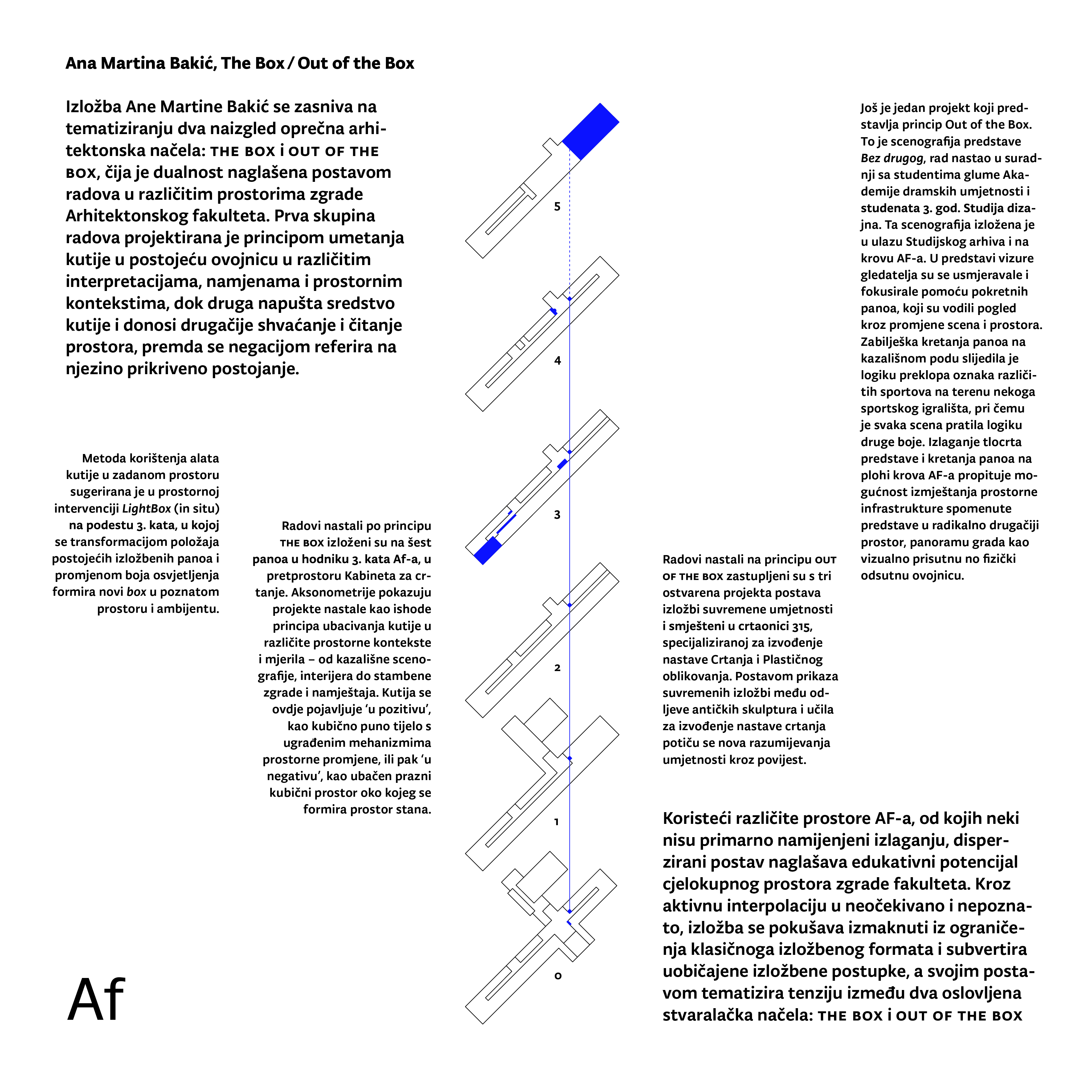 Izložba tematizira dva naizgled oprečna arhitektonska principa: The Box i Out of the Box, čija dualnost je naglašena postavom radova u različitim prostorima zgrade Arhitektonskog fakulteta. Prva skupina radova projektirana je principom umetanja kutije u postojeću ovojnicu u različitim interpretacijama, namjenama i prostornim kontekstima, dok druga napušta sredstvo kutije i donosi drugačije shvaćanje i čitanje prostora, premda se negacijom referira na njezino prikriveno postojanje.