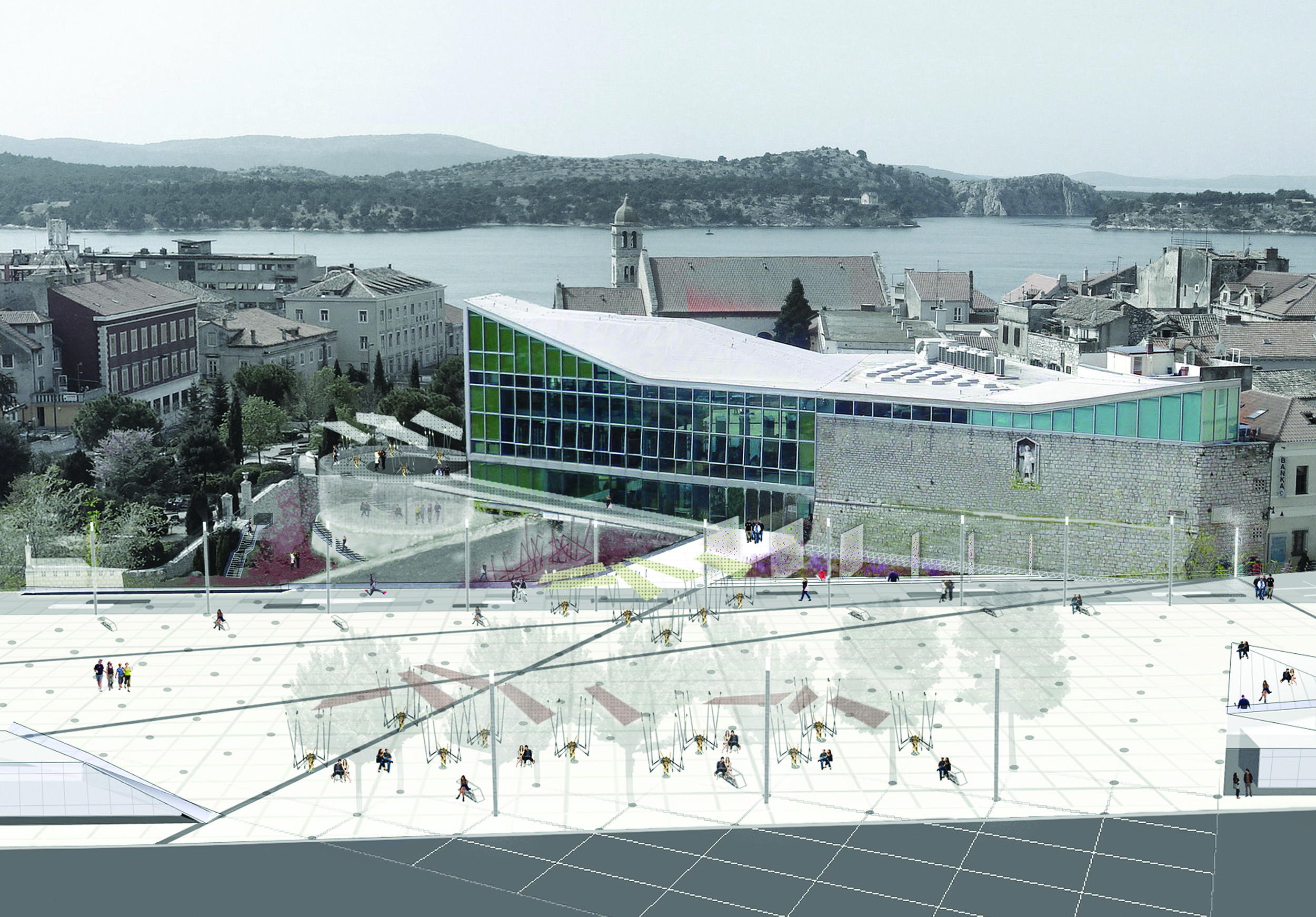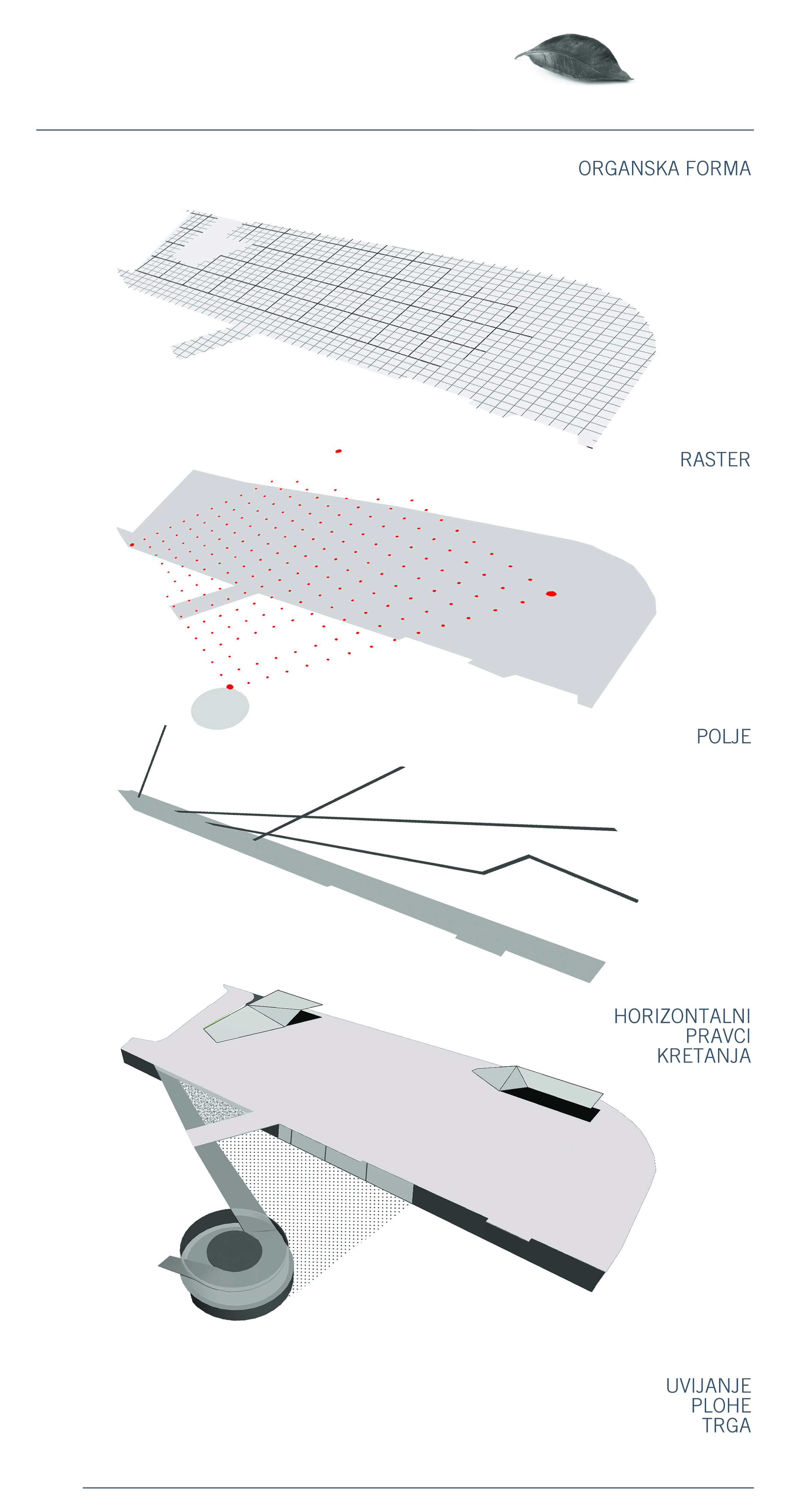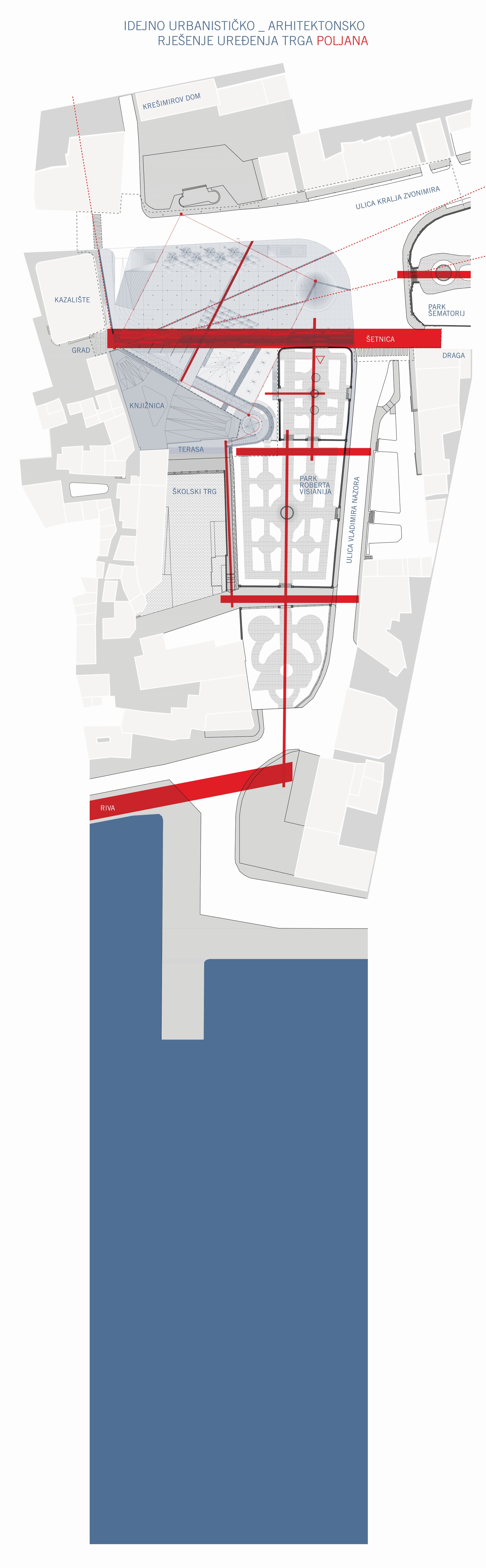 Trg Poljana, koji se nalazi u već ustaljenom sustavu objekata, parkova i arheološkog nalazišta, zamišljen je kao veliko polje koje se svakodnevno mijenja kroz život gradskog središta. Tako se ploha i prostor trga redefiniraju u aktivan gradski prostor namijenjen pješacima. Horizontalna usmjerenja na plohi trga uspostavila su ponavljanja i uhodane rute iz svakodnevice građana. Novostvoreno kvadratno polje točaka usmjereno logikom bedema i Vitićeve biblioteke definira prostor fleksibilne organizacije. Na plohi se tako preklapaju dvije matrice: klasični raster i polje.