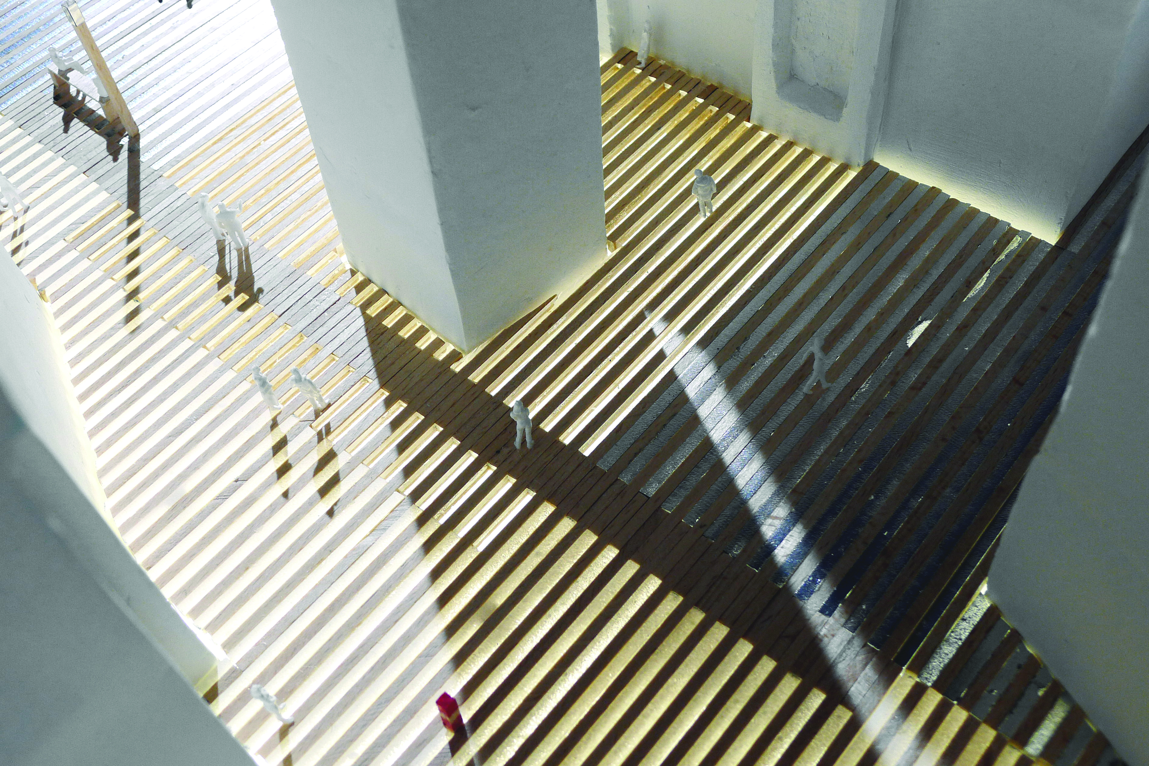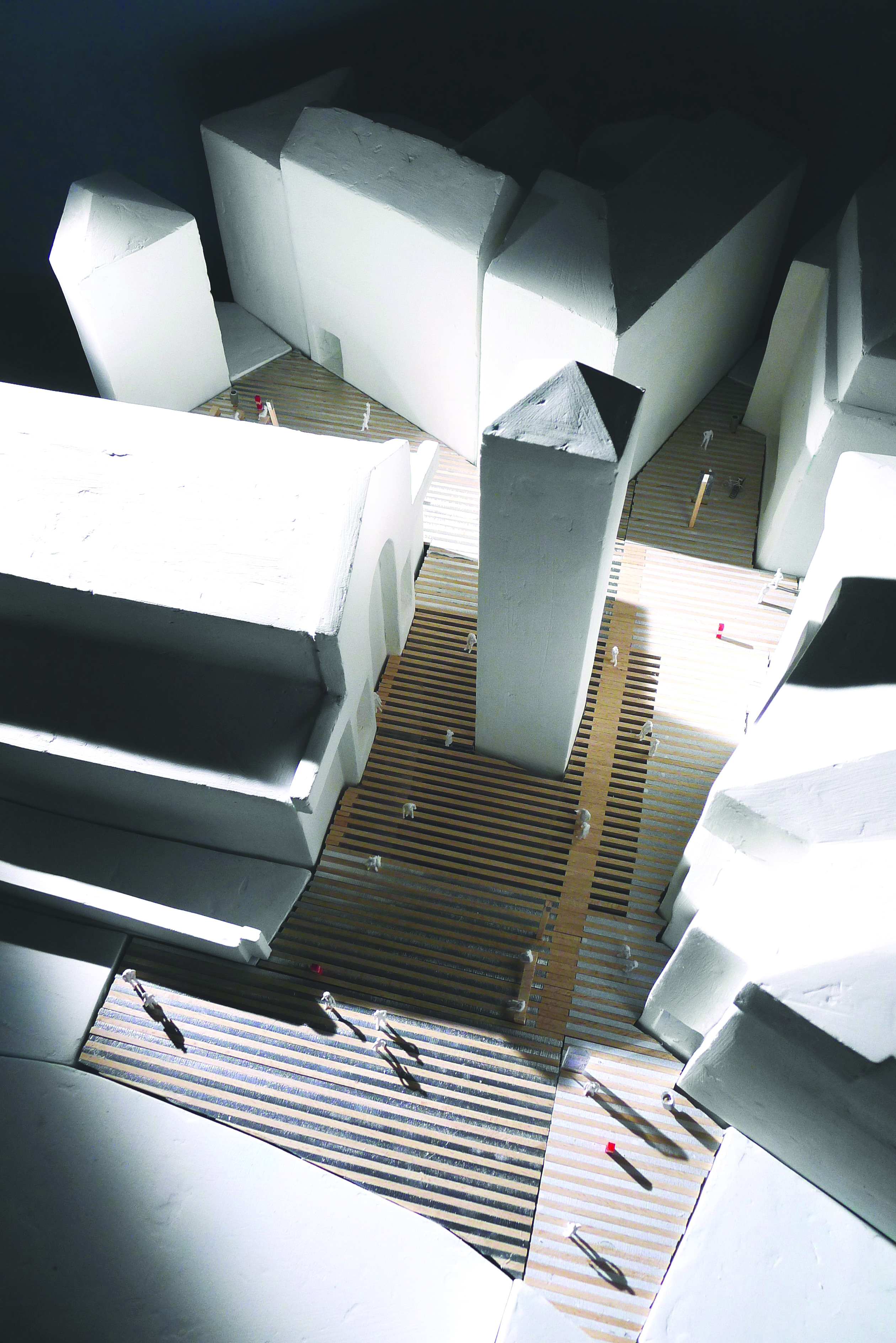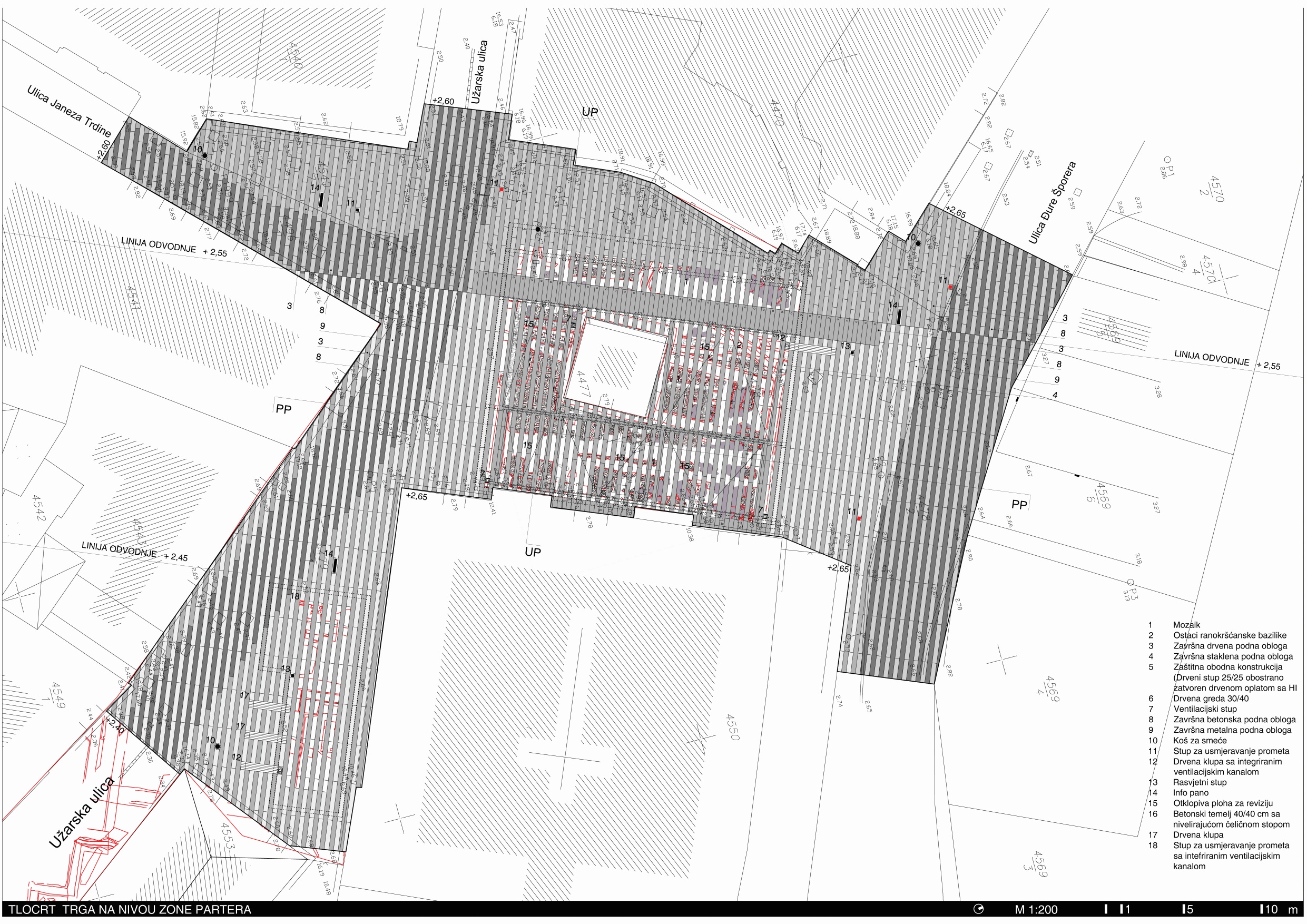 Gradeći, puneći prostor, krojeći grad prema potrebama, kroz duže vremensko razdoblje, gdje se u hodu nešto proširuje, prepravlja, dodaje, u pravilu se dogode prostorni restlovi, žmirje, prednost punog nad praznim, ali baš kao i u pričama o relikvijama, ruka sv. Marcijana ostaje pokazateljem i u vrednovanju zajednice važniji dio dvojstva. Tako i ovaj trg, intiman po dimenzijama, dinamičan kretanjem i nepravilnošću, predstavlja gotovo interijerski, teatarski, javni dnevni boravak kvarta u kojem se superpozicijom elemenata: drva, kamena, stakla i metala iščitavaju i postavljaju trajektorije vrednovanja povijesti. ‘Nadrealistički’ kosi zvonik pojačava dramatiku. Novi urbani prostor formiran je ne samo pročeljima zgrada i ulicama, koji ga okružuju, nego i pažljivim tretiranjem horizontale, poštujući zatečene vrijednosti, a izborom materijala ‘omekšan’ je i jedinstven u svojoj složenosti. Kao kalafati urbane promjene, otvaramo arheološke slojeve i dodajemo nova čitanja, sistemom punog i praznog, od prove do krme gradeći jedinstvenim sistemom, ali pritom suptilno varirajući temu prema specifičnostima i potrebama mikrolokacije. Na ‘morskoj’ strani alteracija je u metalu, na ‘gradskoj’ u kamenu. Oprema je napravljena kao varijacija, nenametljivim pomakom u elevaciji.