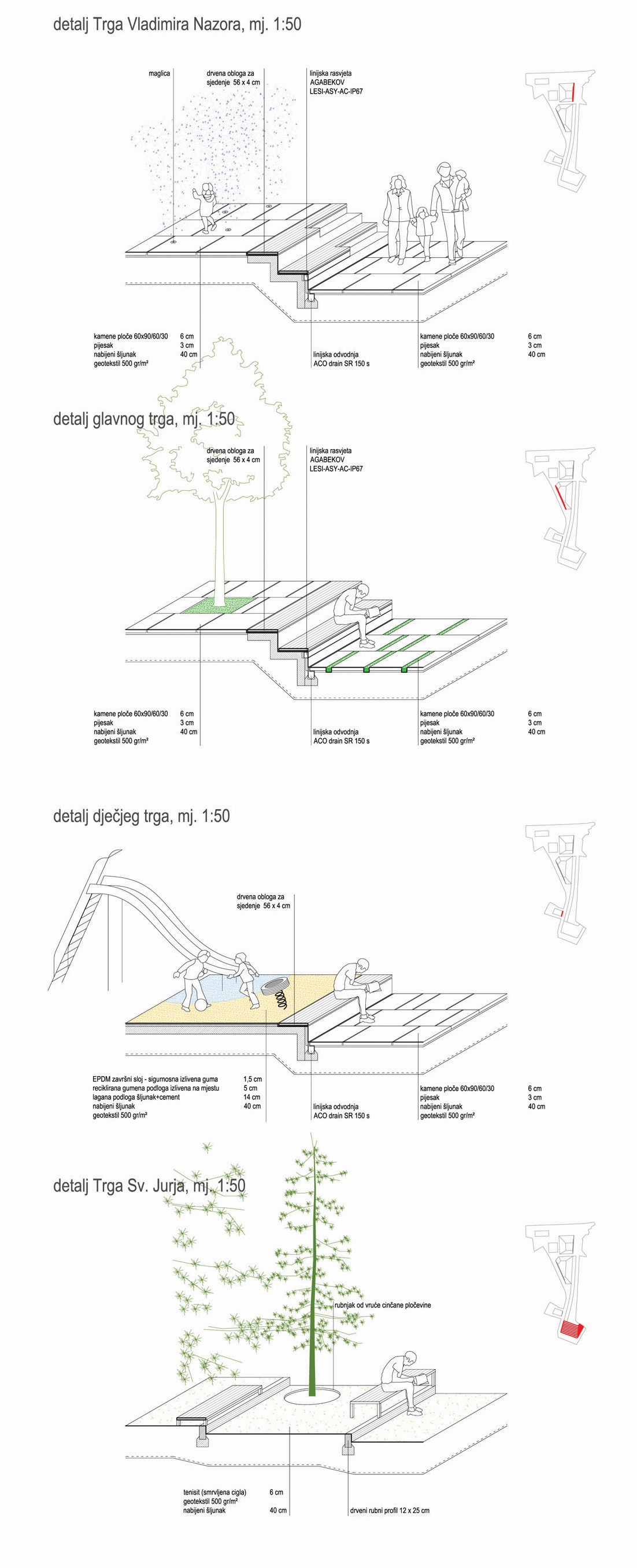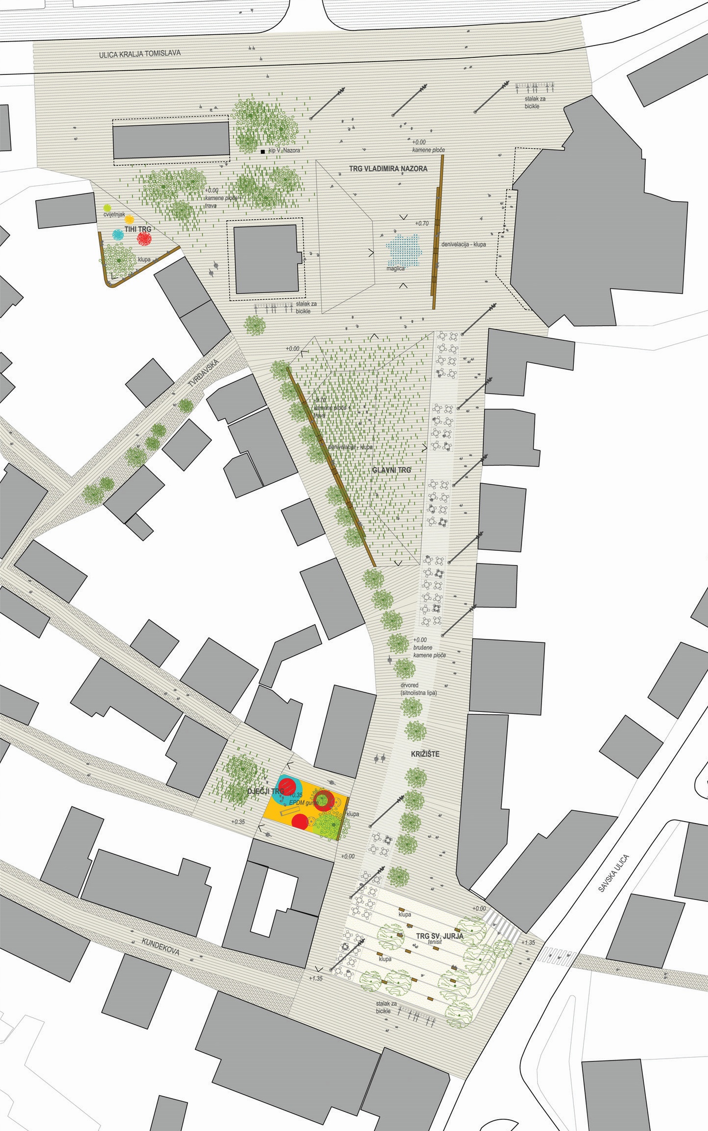Dječji trg je niša izdignuta iz prostora Trga Svetog Jurja, a u nivou Podgrađa. Živih je boja: meki pod od EPDM-a i reciklirane gume, crvenolisni javori, igračke (tobogan, ljuljačke, cijev...) i žuta ograda s vratima. Križište je mjesto na kojem trg još uvijek govori da je nekada bio proširena ulica. To je dodatno naglašeno mimosmjernim ‘križanjem’ drvoreda (koji ‘u zraku’ prelazi sa zapadne na istočnu stranu) i trake u popločenju od brušenog kamena (koja na tlu prelazi s istočne na zapadnu stranu). Idući prema glavnom trgu, križište se širi ali i izdvaja od dječjeg trga prijelazom koji je riješen kao stepenasta denivelacija – klupa.