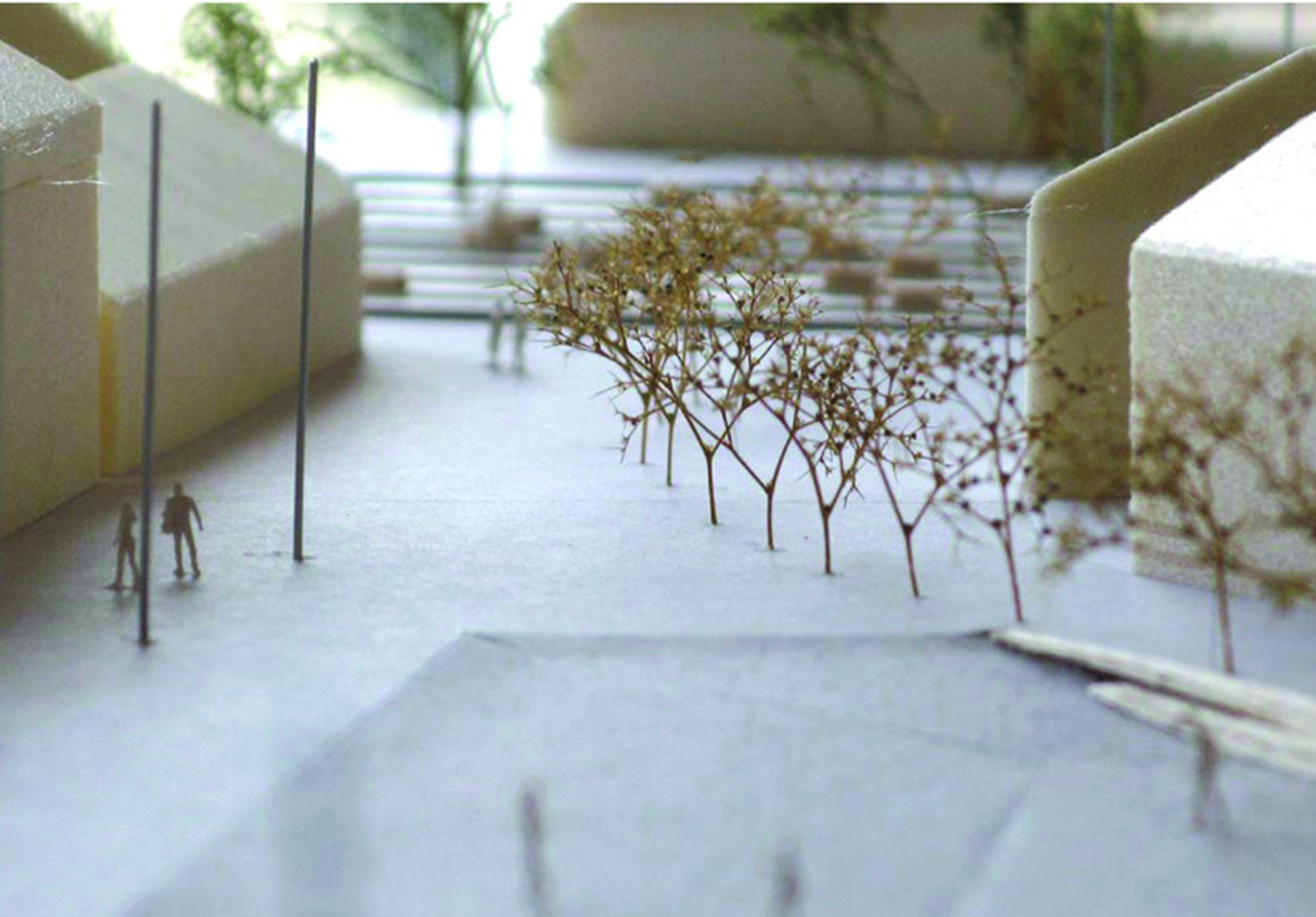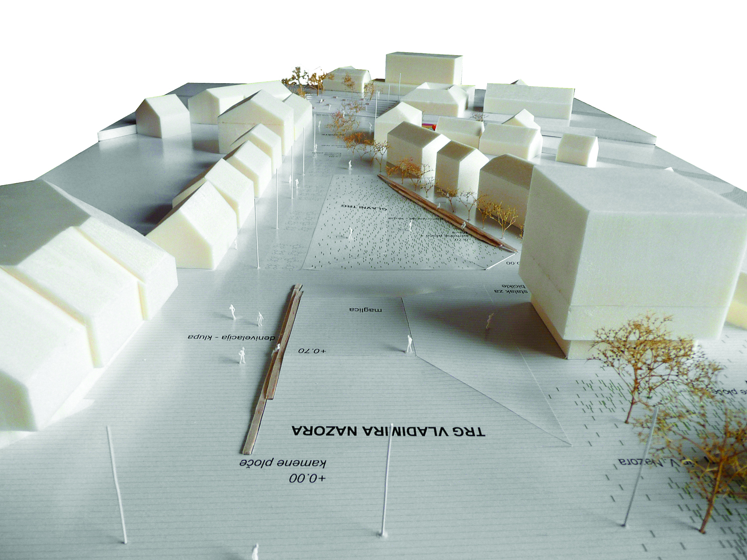 Izdizanje plohe Trg Vladimira Nazora usmjerava prema zapadu, zgradi Županije i spomeniku. Kraj izdizanja prema istoku i ‘Ivanićanki’ stvara stepenastu denivelaciju – klupu. Izdizanje plohe omogućuje da se u slučaju većih događaja pola trga pridruži glavnom trgu ili Ulici kralja Tomislava. Na ravnom dijelu i najvišoj koti nalazi se fontana koja proizvodi nježnu izmaglicu, a vizualno i akustički izdvaja trg od Ulice kralja Tomislava i pod određenim kutom svjetla stvara dugu. Postojeće visoko zelenilo na sjeveru učvršćuje rub trga i najavljuje Park Stjepana Posezija. Visoko zelenilo na sjevernom i jugoistočnom rubu i rasvjetni stupovi određuju vertikalnu dimenziju trga.