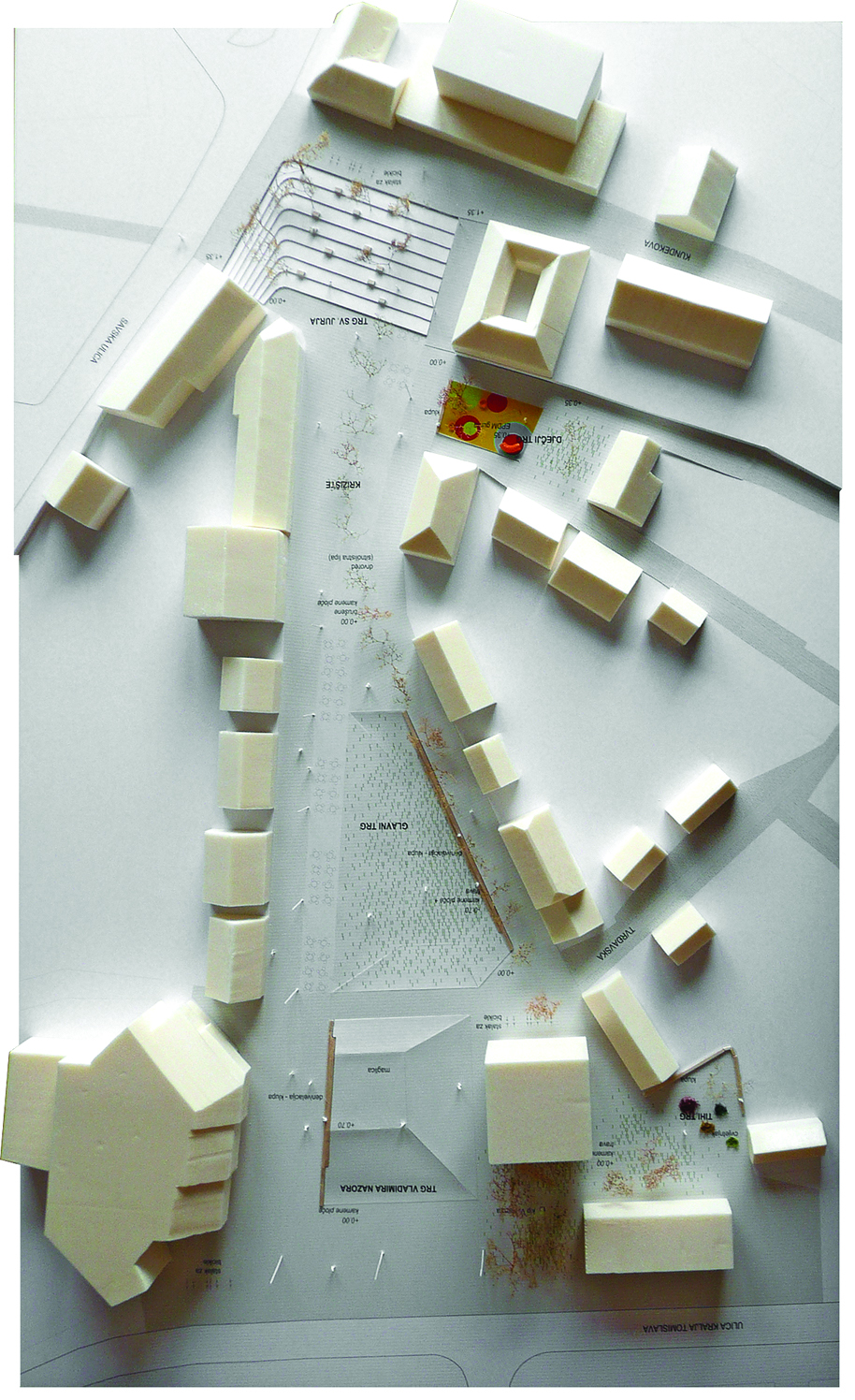 Glavni trg je mjesto za druženje i najmirniji je i najveći od svih trgova. Koridori komunikacija izuzeti su iz plohe trga tako da ju tangiraju, a u slučaju velikog događaja povećavaju. Komunikacija na zapadnom rubu izdvojena je denivelacijom i drvoredom, a na istočnom rubu različitom obradom plohe – brušenjem. Stepenasta denivelacija – klupa usmjerava trg prema istoku i omogućuje ugodno popodnevno sjedenje. Pozornica za velike događaje može biti na južnom vrhu trga ili na sjeveru – najvišem dijelu Trga Vladimira Nazora.