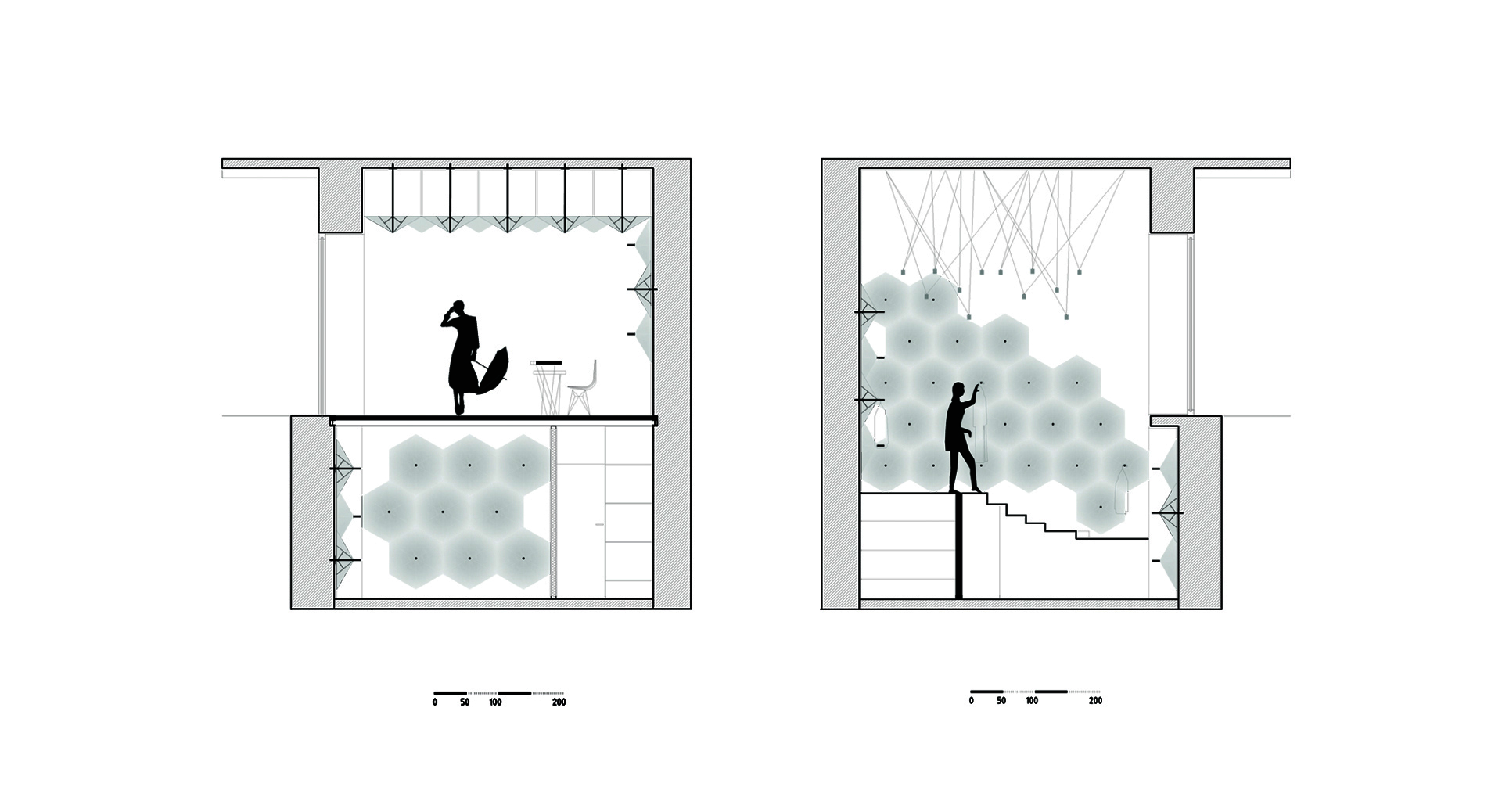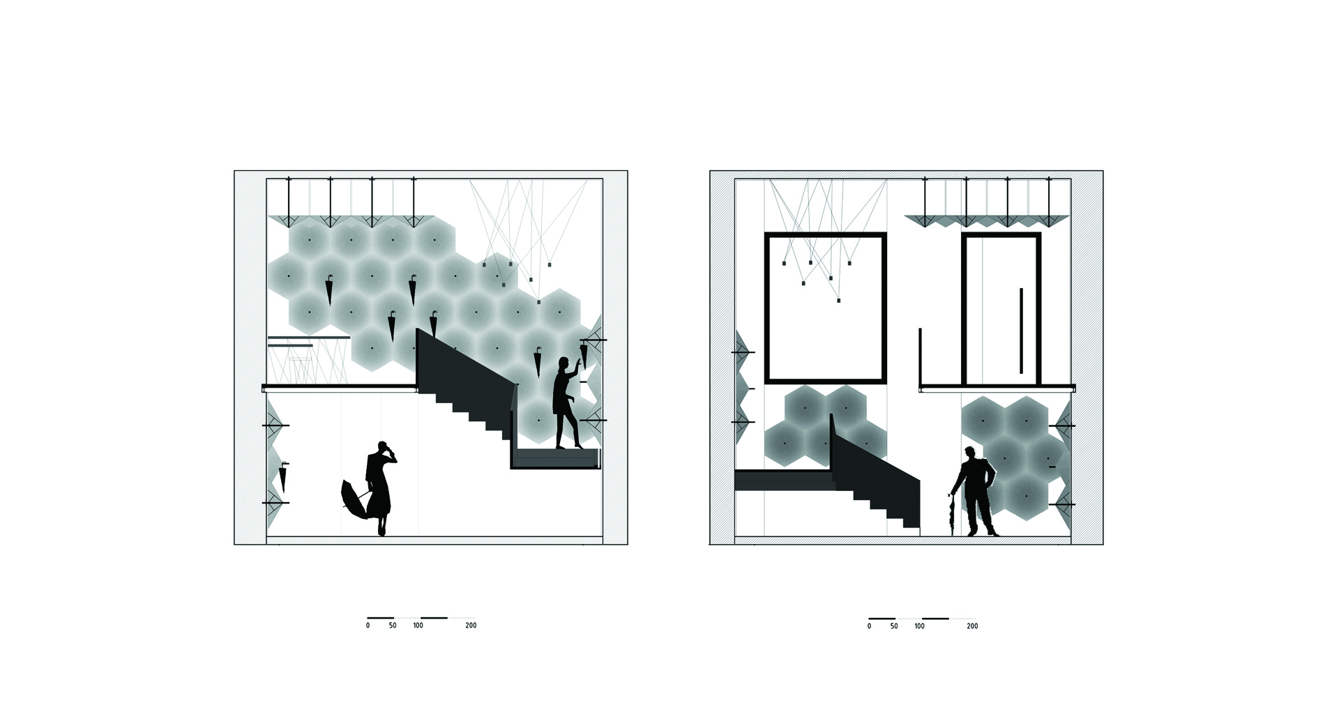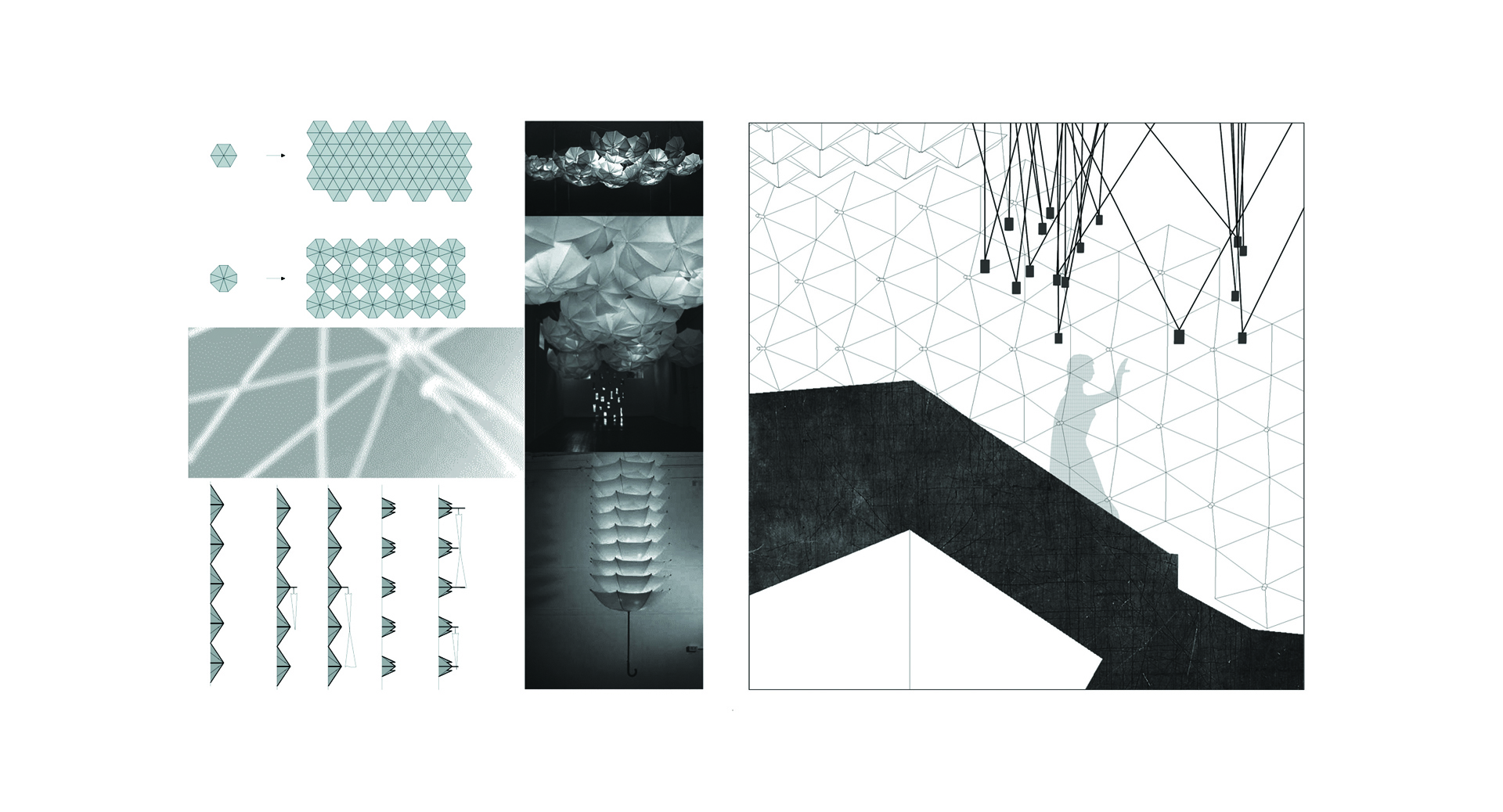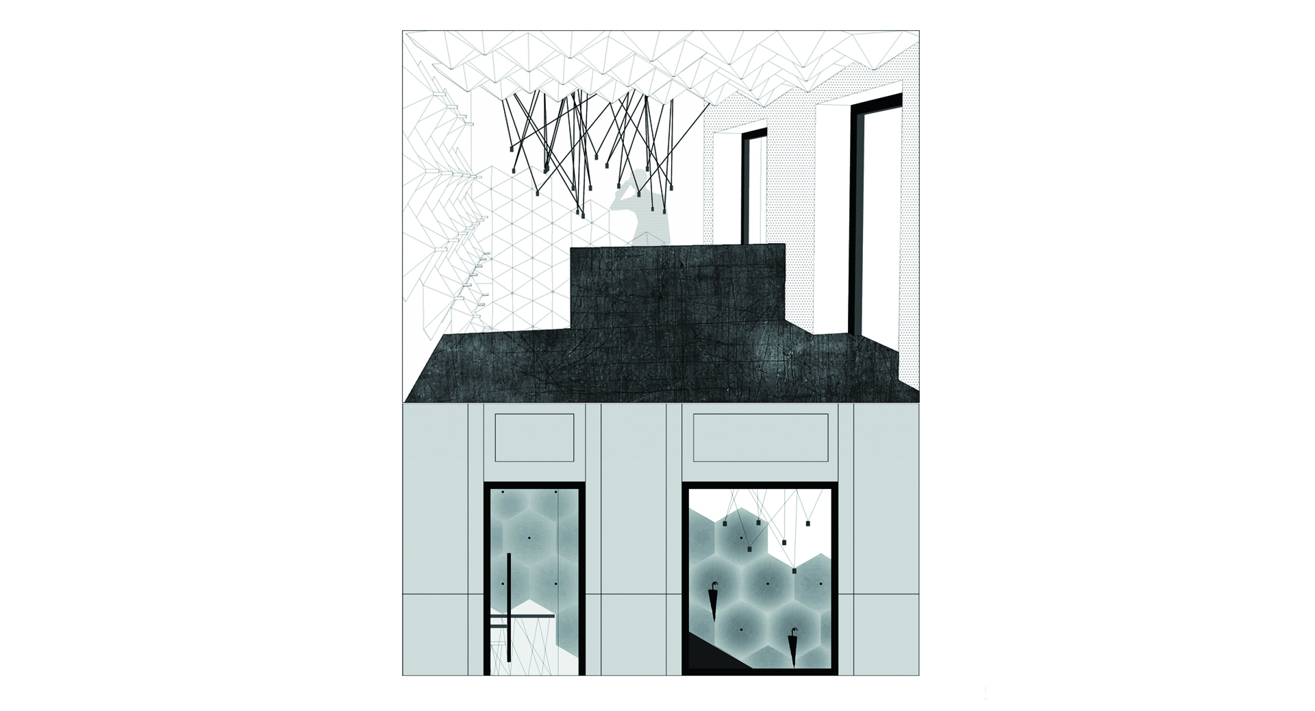 Zamisao oblikovanja jednog od lokala u Miškecovu ili tzv. Obrtničkom prolazu, polazi od korištenja jednog elementa i njegova multipliciranja te stvaranja jedinstvene i prepoznatljive dinamične strukture. Osnovni oblikovni element interpretacija je konstrukcije i plašta kišobrana. Osim funkcionalne element ima i asocijativnu vrijednost s obzirom da je kao tema zadatka izabrana trgovina kišobranima. Dobivena struktura predstavlja montažno – demontažnu instalaciju u prostoru. Funkcija i forma su promjenjivi. Promjena funkcije utječe na metamorfozu forme čime se u brojnim varijantama mijenja cijela struktura. Interpoliranu strukturu zapažamo prilikom ulaska u trgovinu (strop), ona prati naše kretanje stubištem (zid) i zaključno je prisutna u podrumskoj etaži.