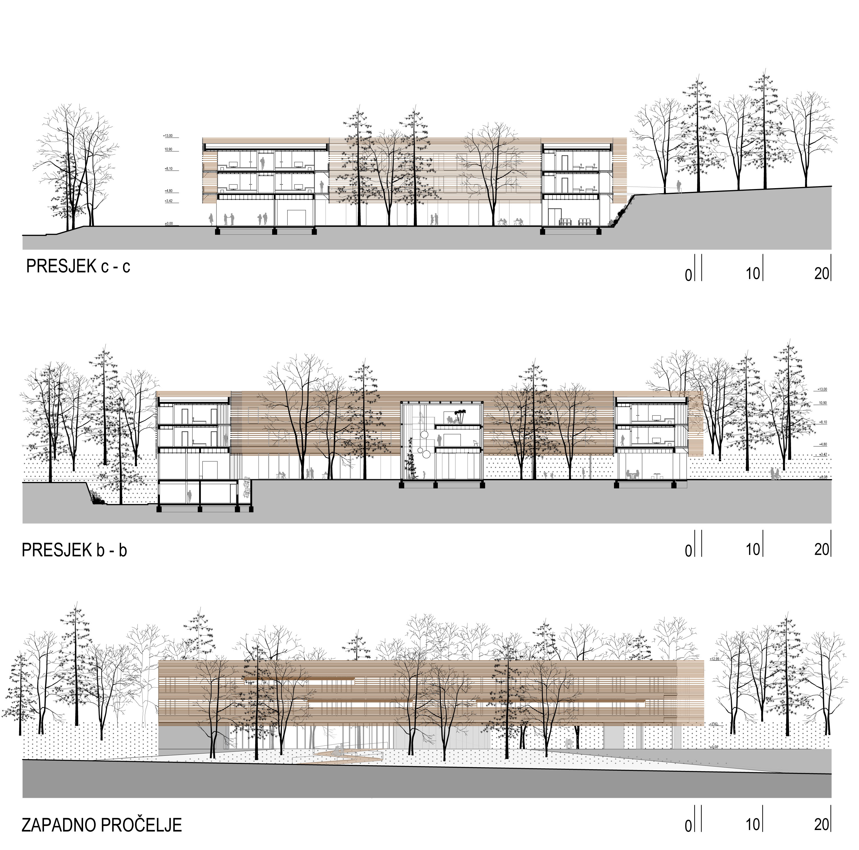 Zona prvog i drugog kata sastoji se od četiri krila sa smještajnim jedinicama. Smještajne jedinice projektirane su u programskim dimenzijama, sa lođama koje formiraju pročelje oblikovano drvenim brisolejima. Horizontalni drveni brisoleji osiguravaju smještajnim jedinicama vizualni zaklon od vanjskih pogleda, a isto tako korisnicima iz smještajnih jedinica osiguravaju nesmetan pogled prema van. Taj element pročelja - drveni „plašt“, kojim dominiraju horizontale, kako bi se vizualno smanjila realna dimenzija građevine je artificijelna interpretacija šume i njene promjenjive „propusnosti“ (gustoće) s obzirom na godišnja doba.