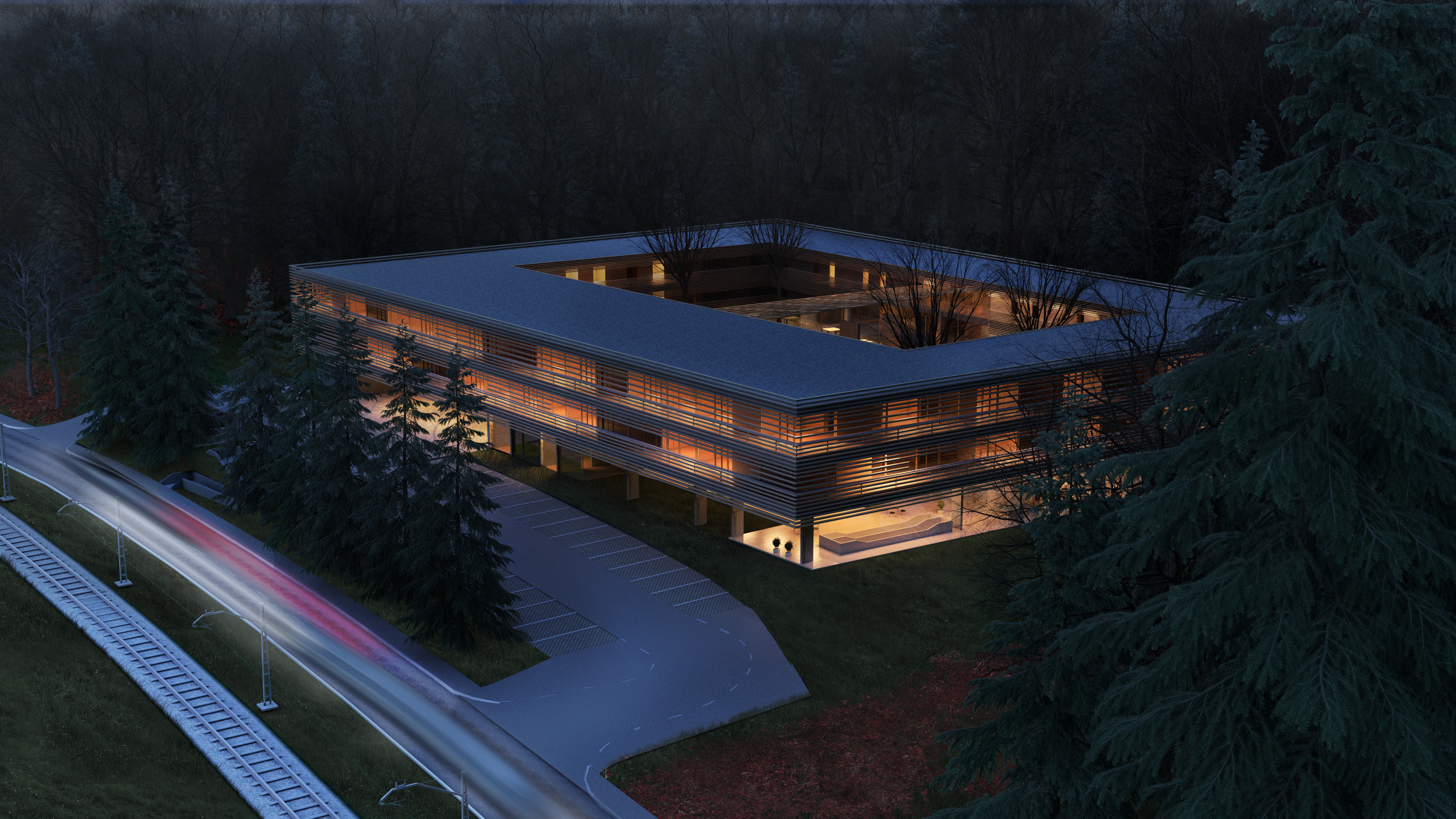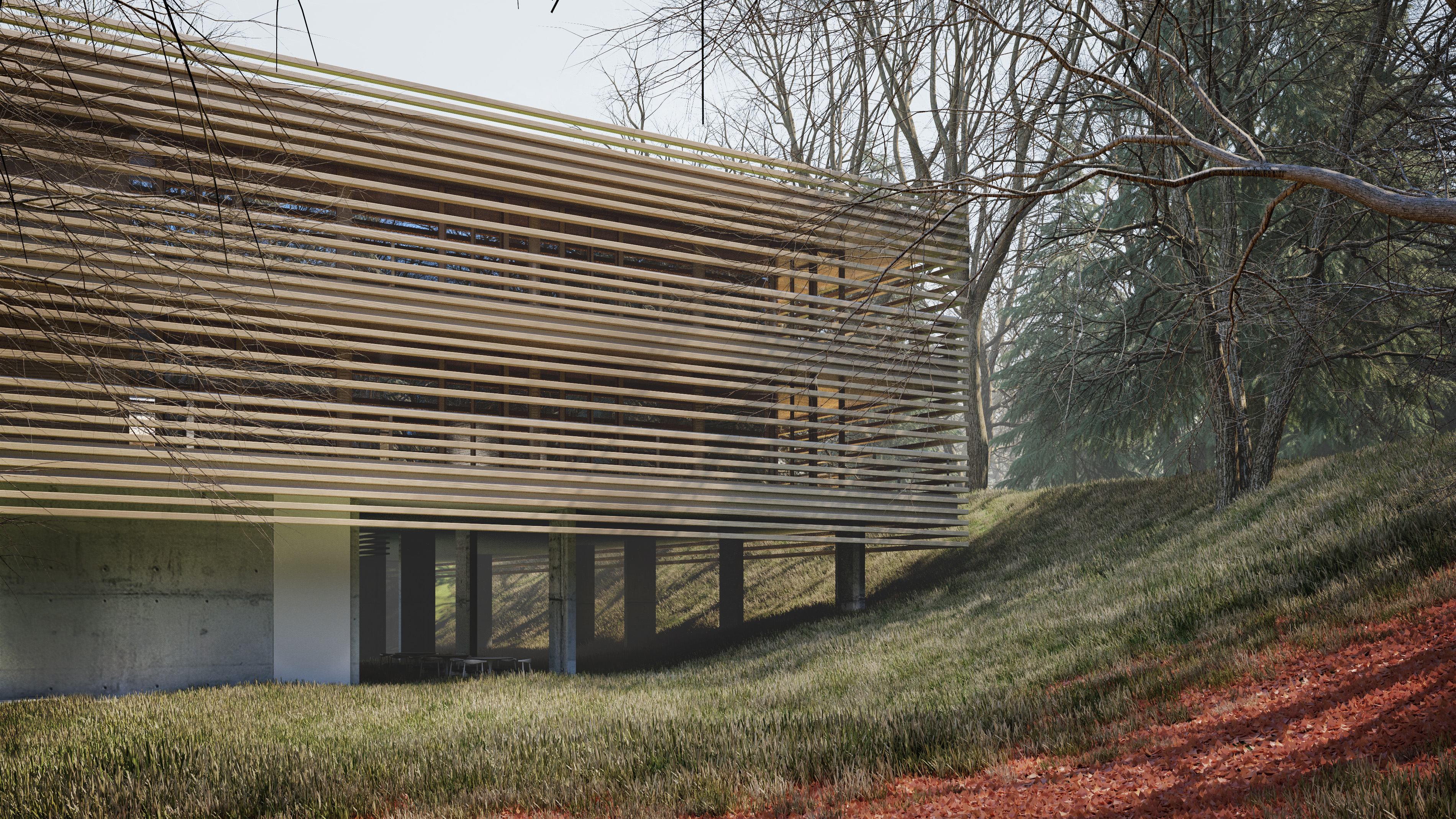 Zgrada Veteranskog centra u Daruvaru smješteno je zemljištu na mirnoj, šumom okruženoj lokaciji i ta prednost se maksimalno potencira kroz atrijsku koncepciju zgrade,otvaranjem partera prema šumi i direktnim pješačkim povezivanjem na staze. Mikro urbanizam atrija osigurava povezivanje sadržaja i preglednost, kao i intimu vanjskih prostora koji nastaju unutar volumena i kroz natkrivene vanjske površine u južnom dijelu zgrade. Forma kuće je maksimalno pojednostavljena: pravokutni „prsten“ koji je pozicionira na mjesto sadašnjeg igrališta, a kako bi se maksimalno sačuvala postojeća šuma.